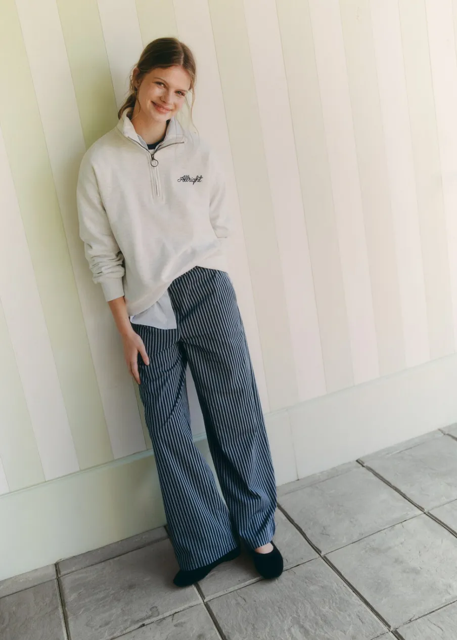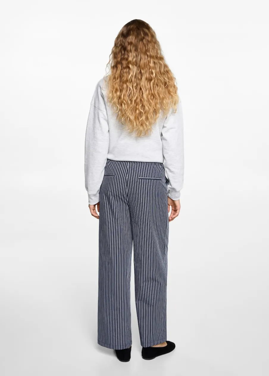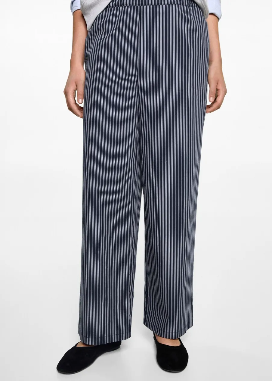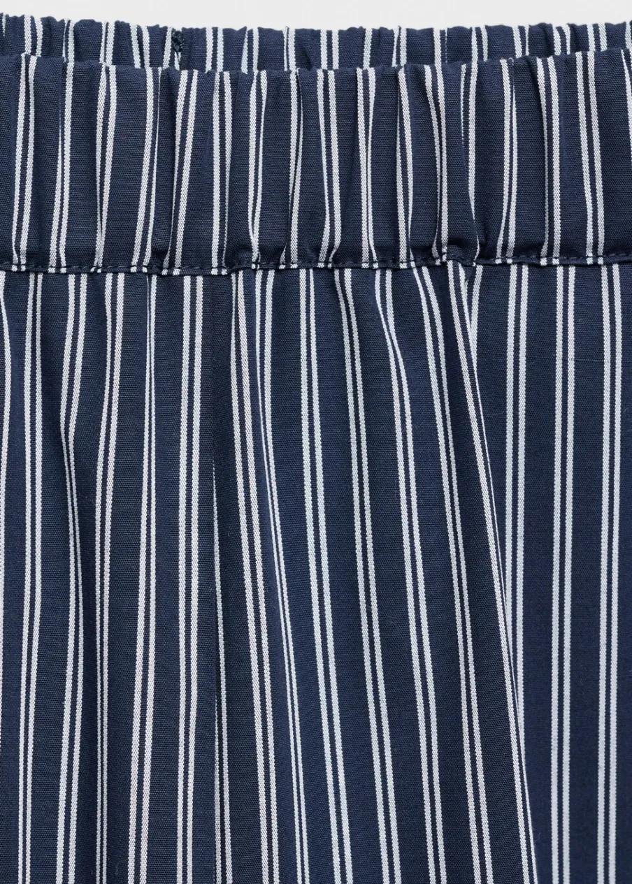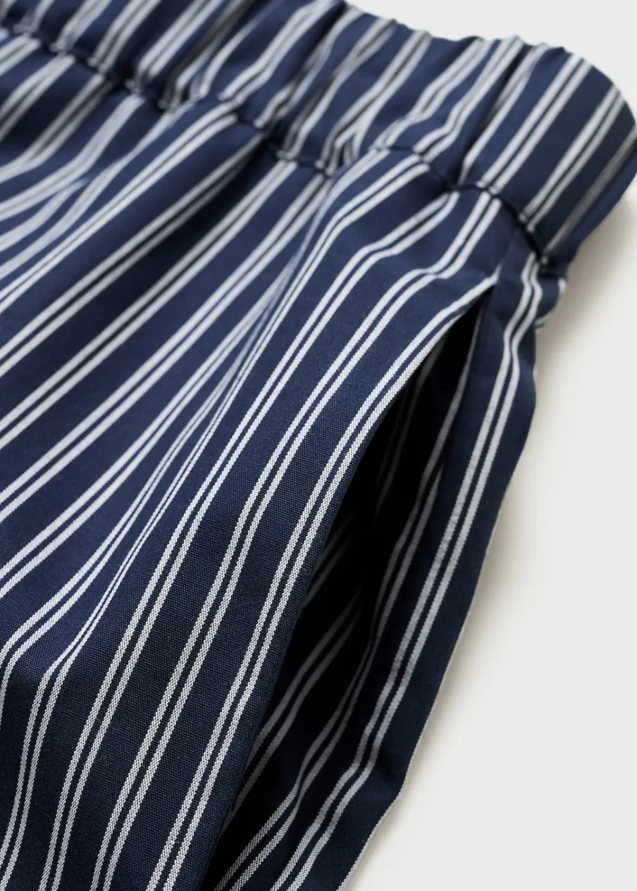 Model długi. Wzór w pasy. Elastyczny pas. Kieszenie boczne. Dwie wpuszczane kieszenie z tyłu.