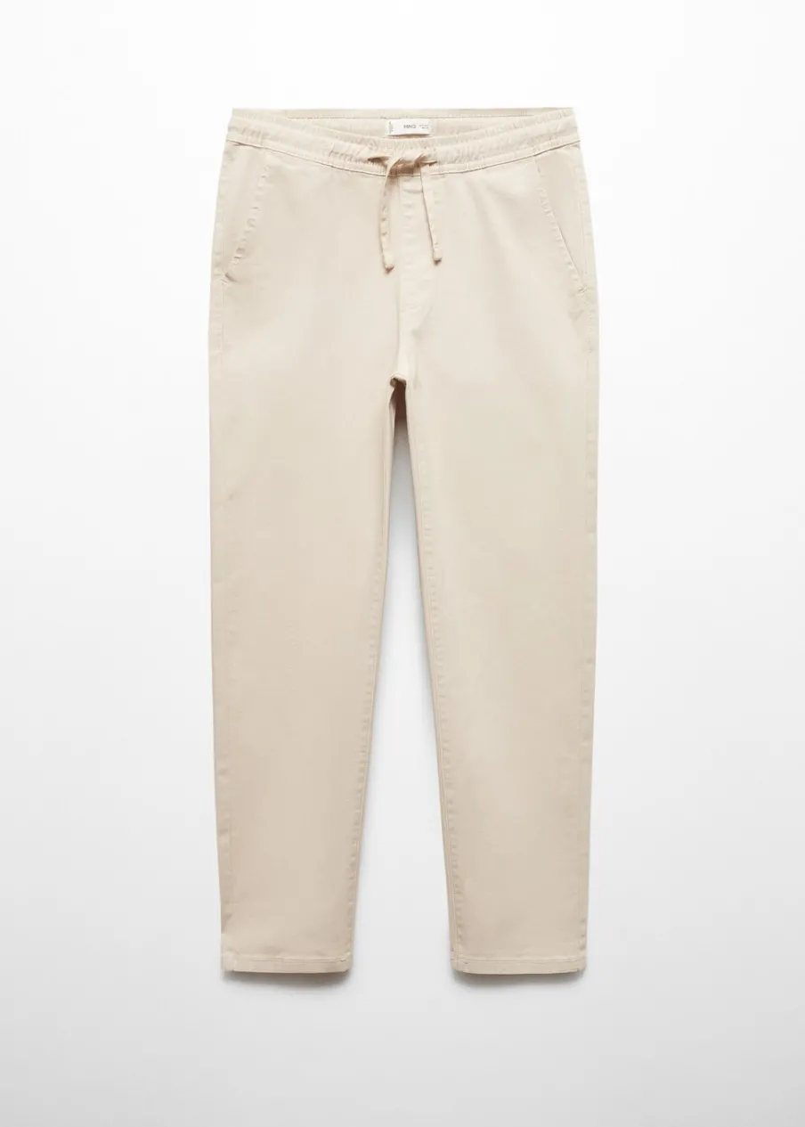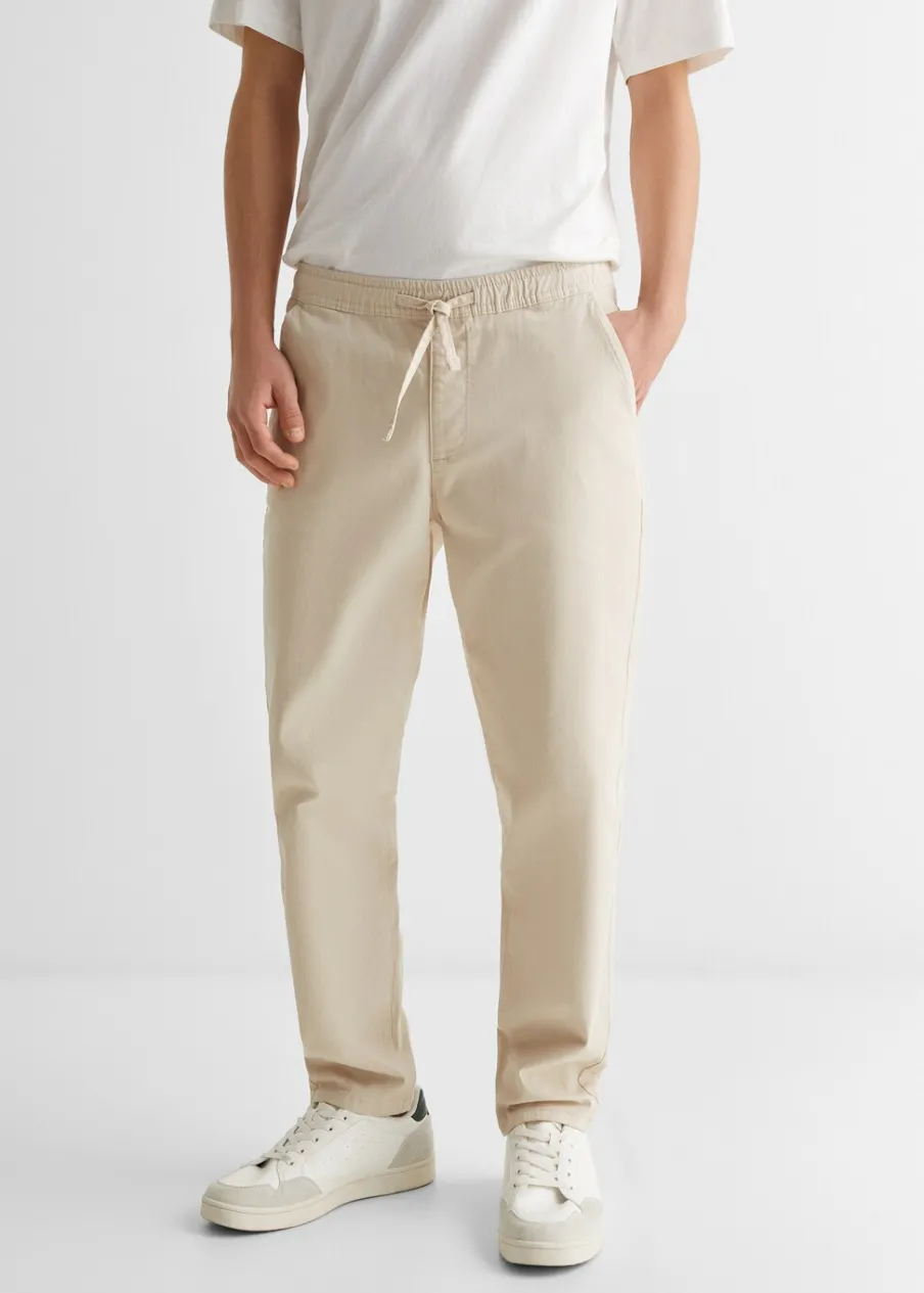 OpisTkanina z bawełną. Model prosty. Model długi. Elastyczny pas ze sznurkiem. Dwie kieszenie nakładane z tyłu.