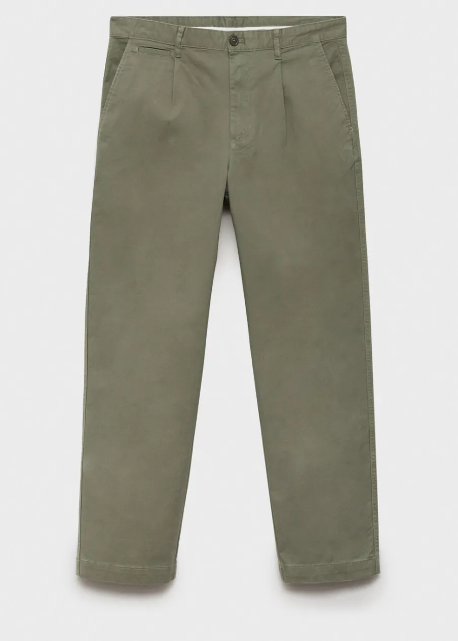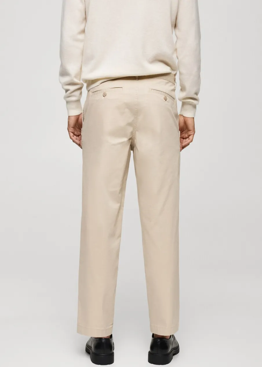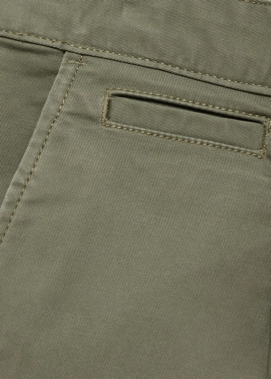 Tkanina bawełniana. Dwurzędowe zapięcie z przodu na guziki i zamek. Zaszewki z przodu. Kieszonka na monety na wysokości biodra. Dwie kieszenie boczne. Dwie wpuszczane kieszenie z guzikiem z tyłu. Prosty dół. Model ma 190 cm wzrostu i nosi rozmiar 42.