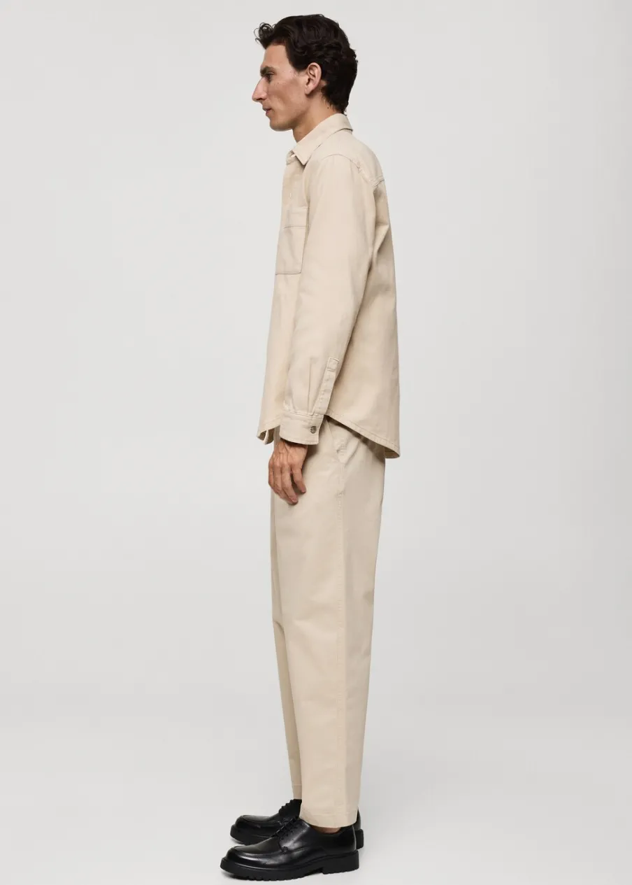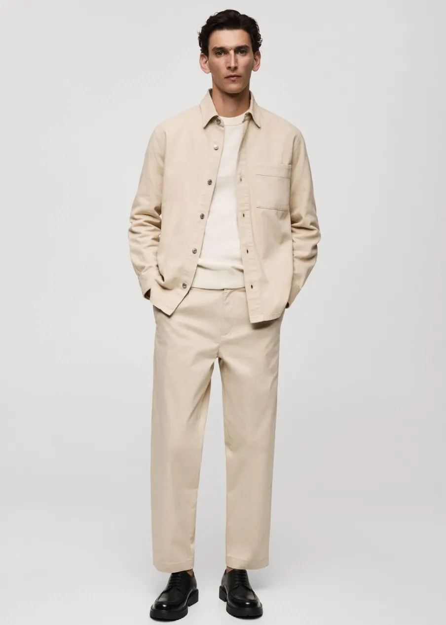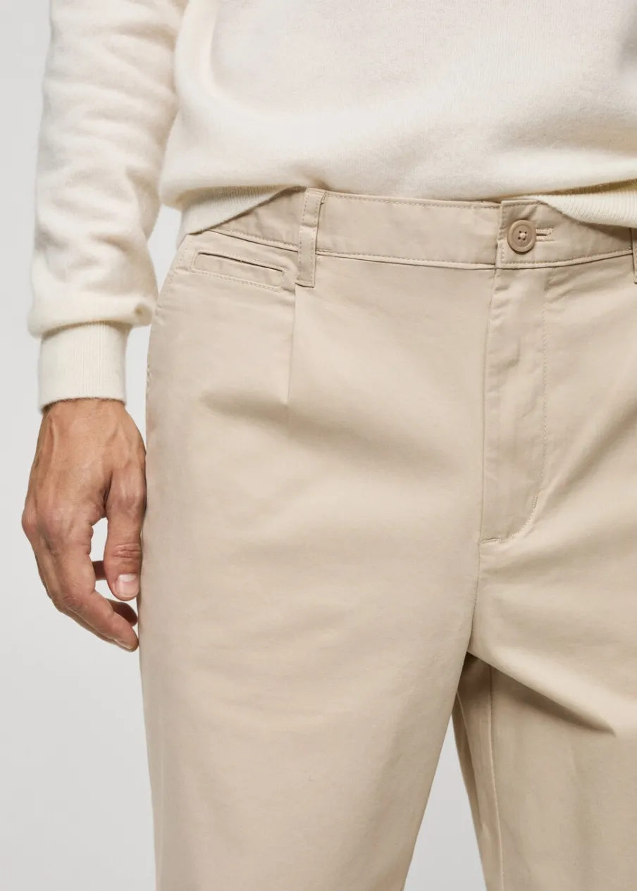 Tkanina bawełniana. Dwurzędowe zapięcie z przodu na guziki i zamek. Zaszewki z przodu. Kieszonka na monety na wysokości biodra. Dwie kieszenie boczne. Dwie wpuszczane kieszenie z guzikiem z tyłu. Prosty dół. Model ma 190 cm wzrostu i nosi rozmiar 42.