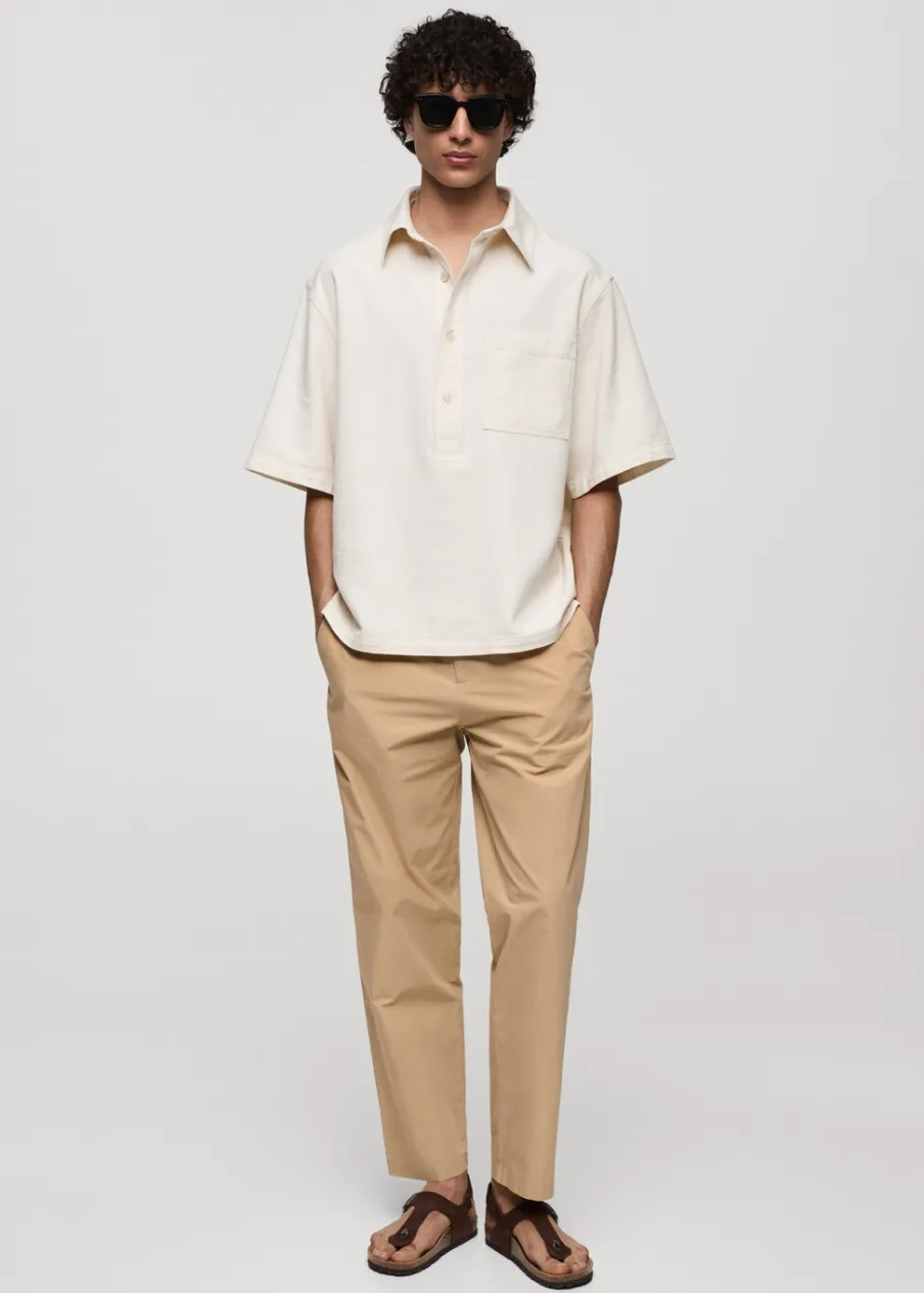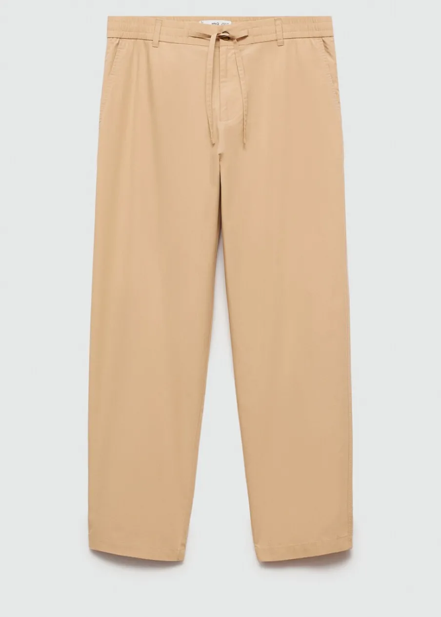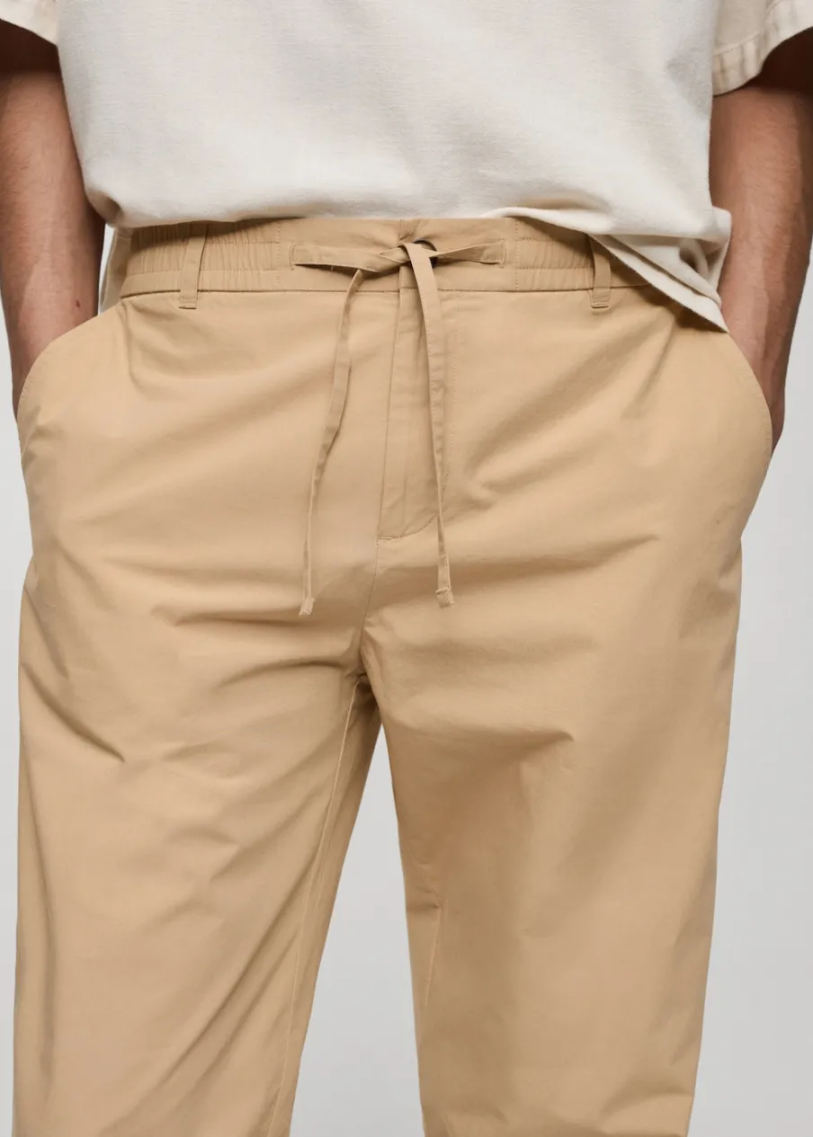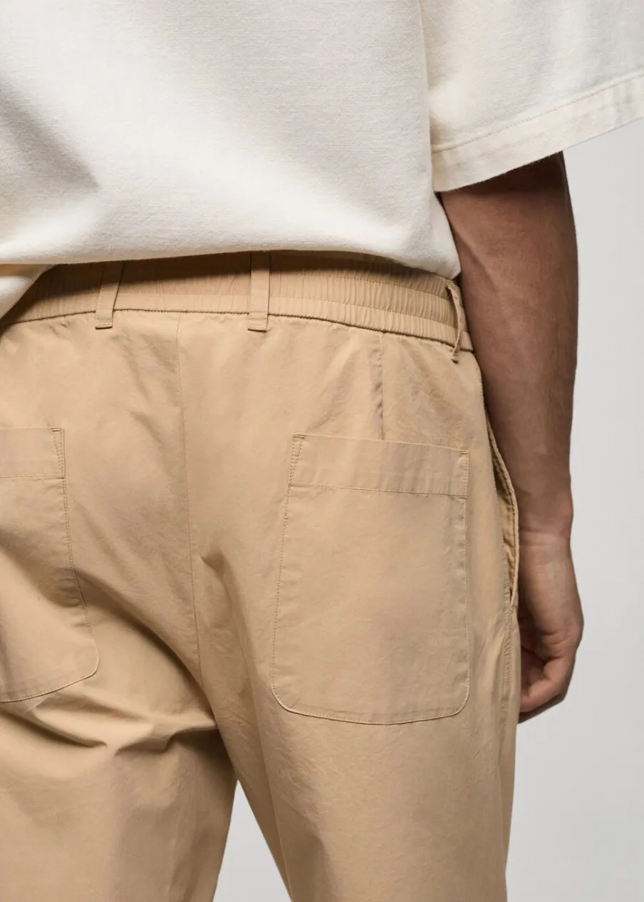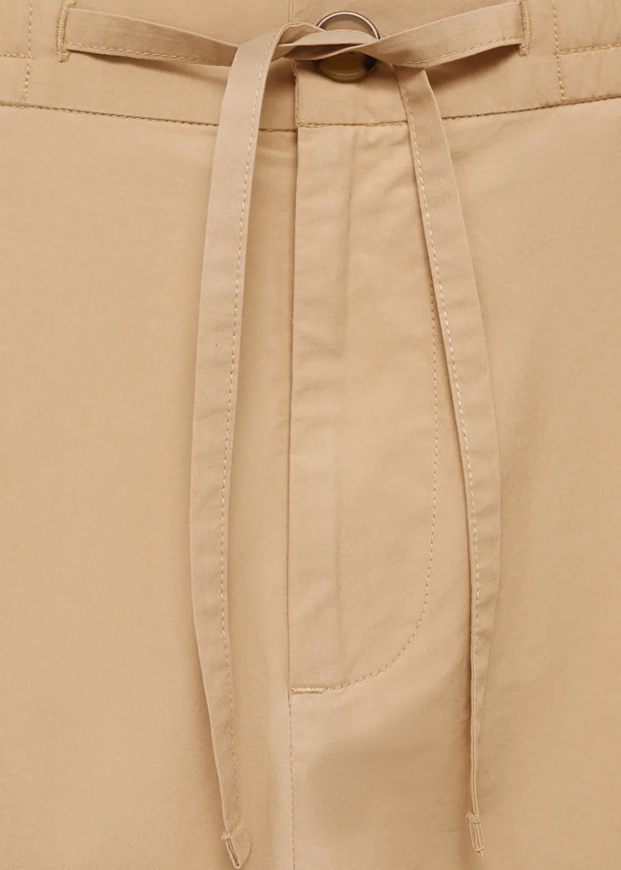 Elastyczne marszczenie w talii. Regulowany sznurek w pasie. Szlufki na pasek. Dwie kieszenie z przodu. Dwie kieszenie nakładane z tyłu. Model ma 185 cm wzrostu i nosi rozmiar 42. Zapięcie na zamek i guzik z przodu. Tkanina z 100% bawełny.