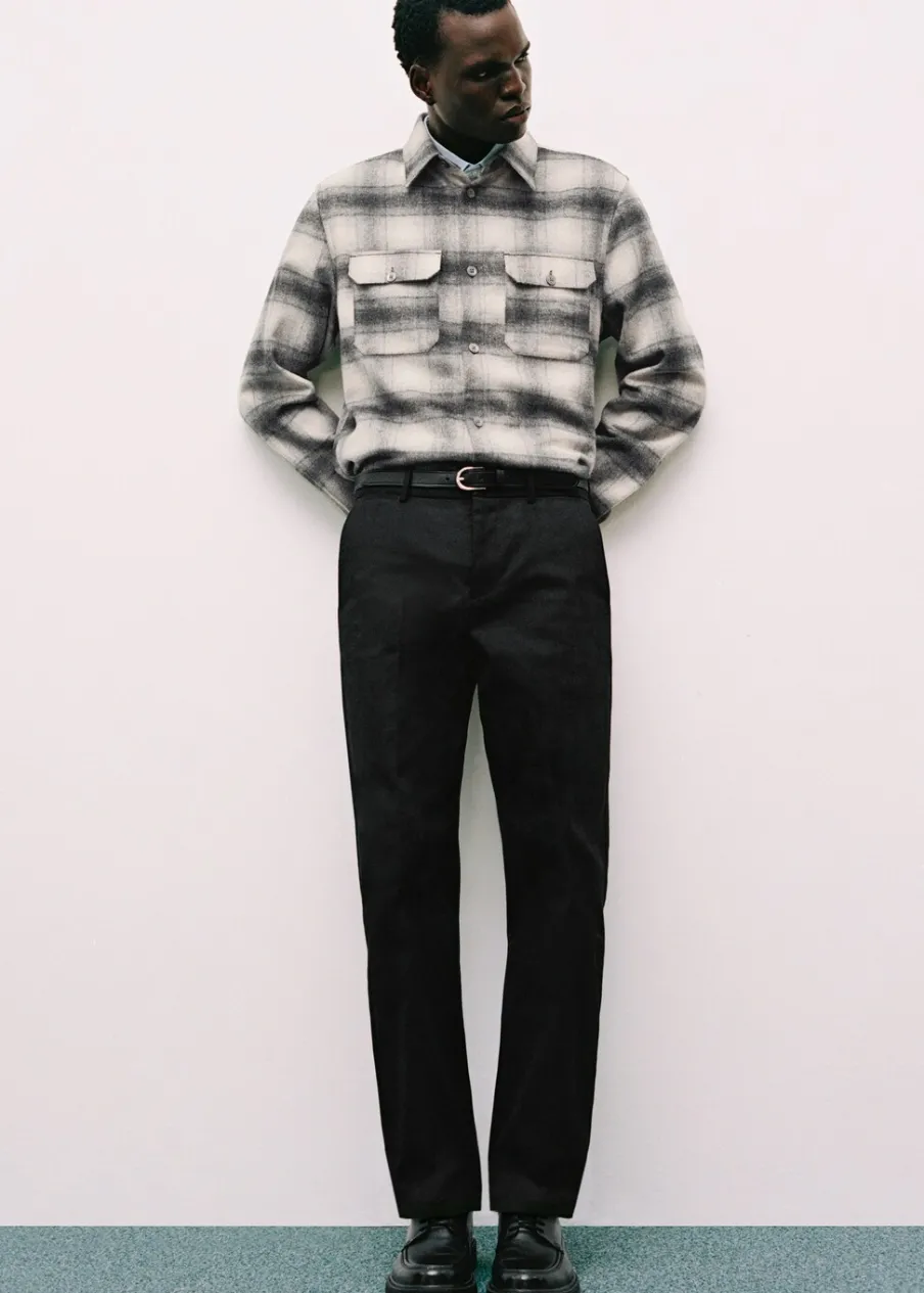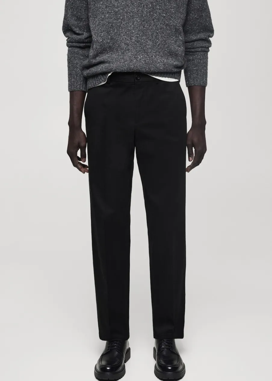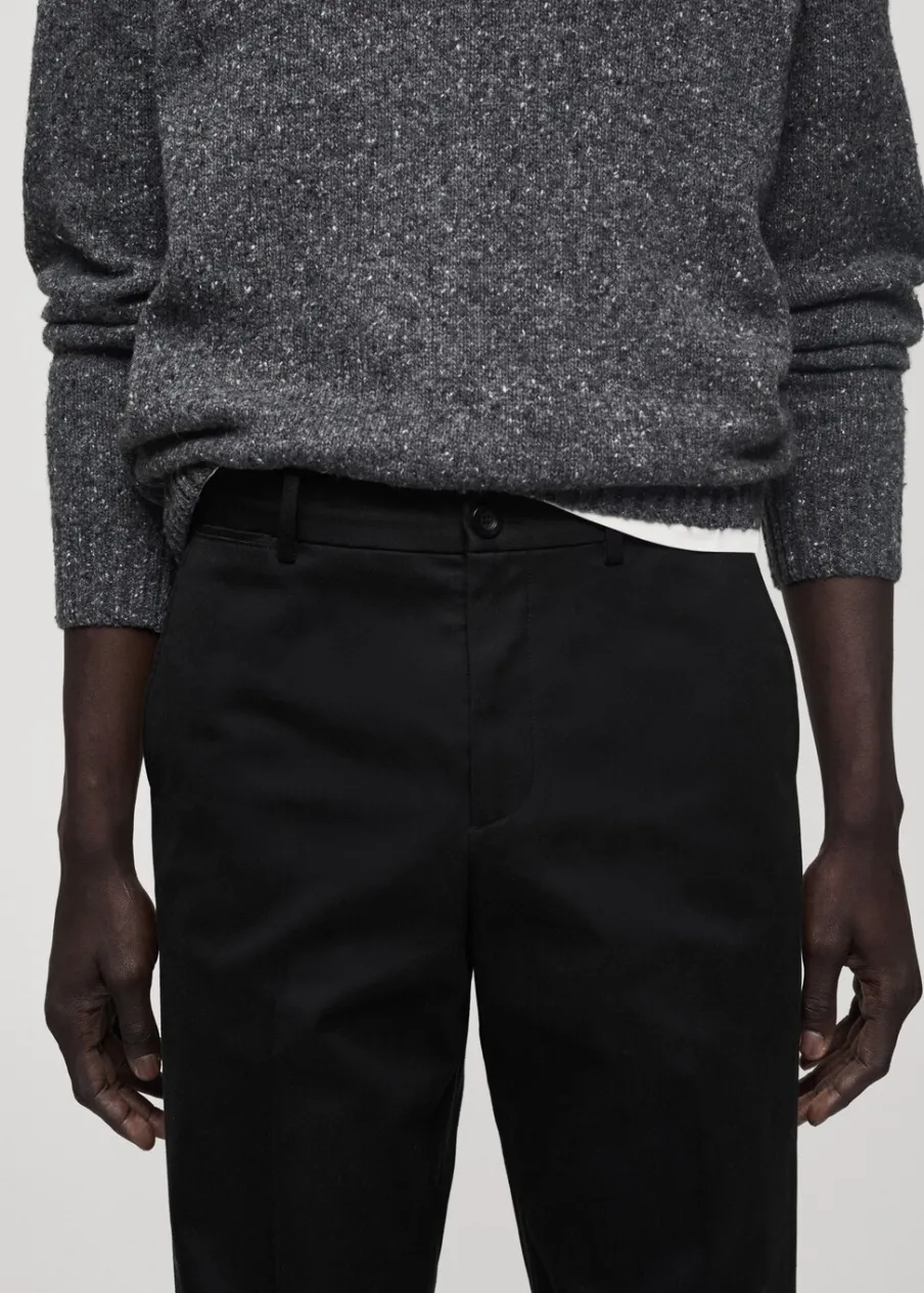 Straight-fit. Tkanina bawełniana. Pas z wewnętrznym, regulowanym sznurkiem. Zapięcie na suwak i guzik. Szlufki na pasek. Kieszenie boczne. Kieszeń na bilon. Dwie kieszenie z patką z tyłu. Prosty dół. Model ma 190 cm wzrostu i nosi rozmiar 42. Kampania z Antoinem Griezmannem. Tkanina z grubej dzianiny. Zaprasowany kant.