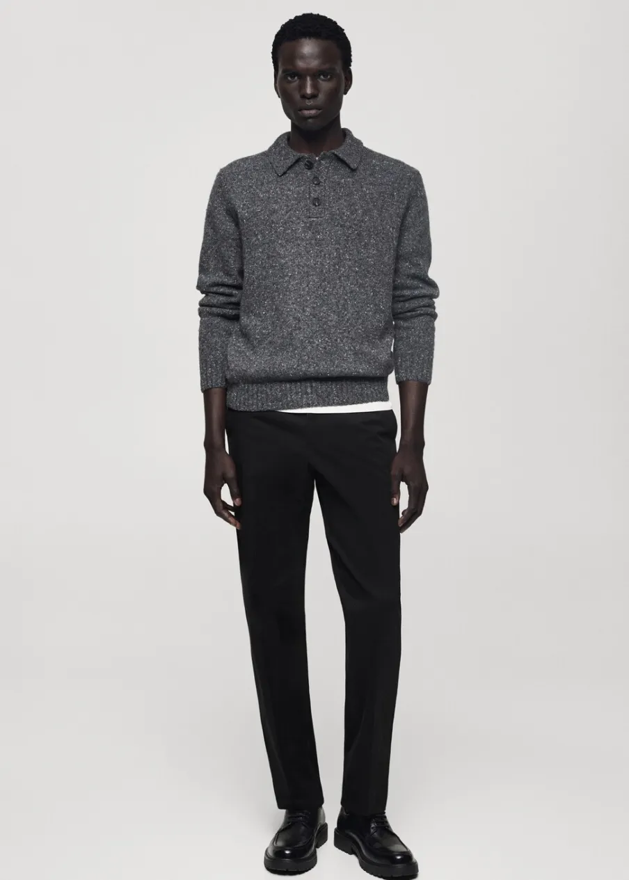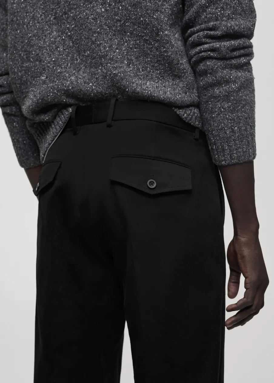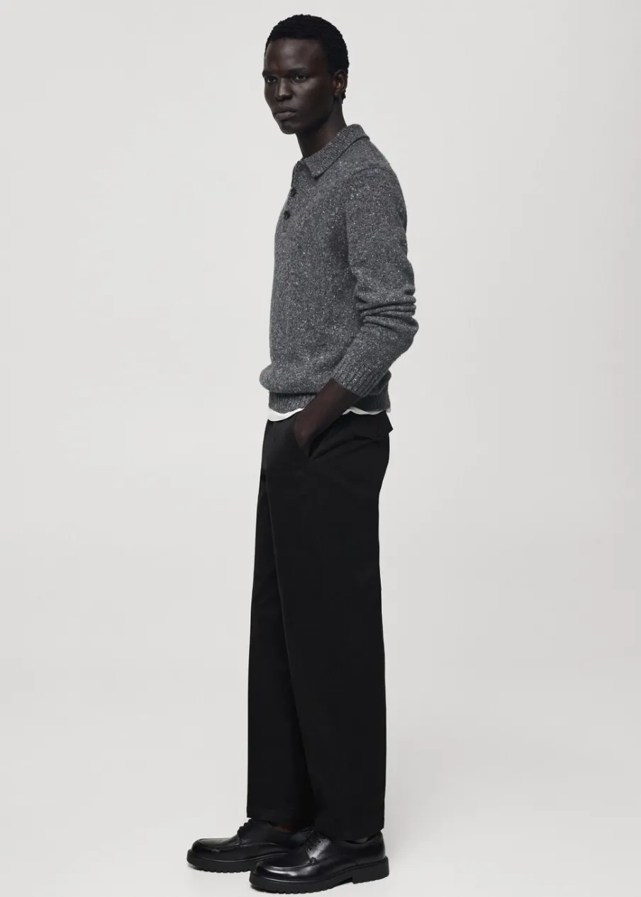 Straight-fit. Tkanina bawełniana. Pas z wewnętrznym, regulowanym sznurkiem. Zapięcie na suwak i guzik. Szlufki na pasek. Kieszenie boczne. Kieszeń na bilon. Dwie kieszenie z patką z tyłu. Prosty dół. Model ma 190 cm wzrostu i nosi rozmiar 42. Kampania z Antoinem Griezmannem. Tkanina z grubej dzianiny. Zaprasowany kant.