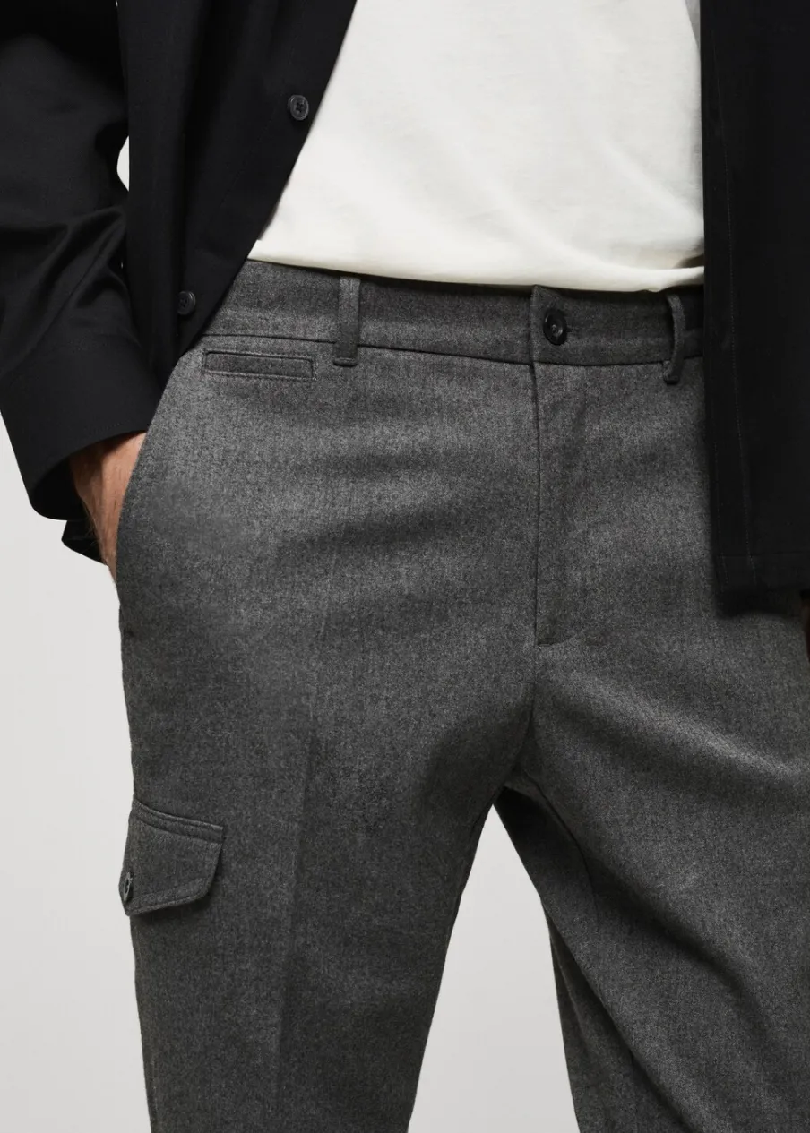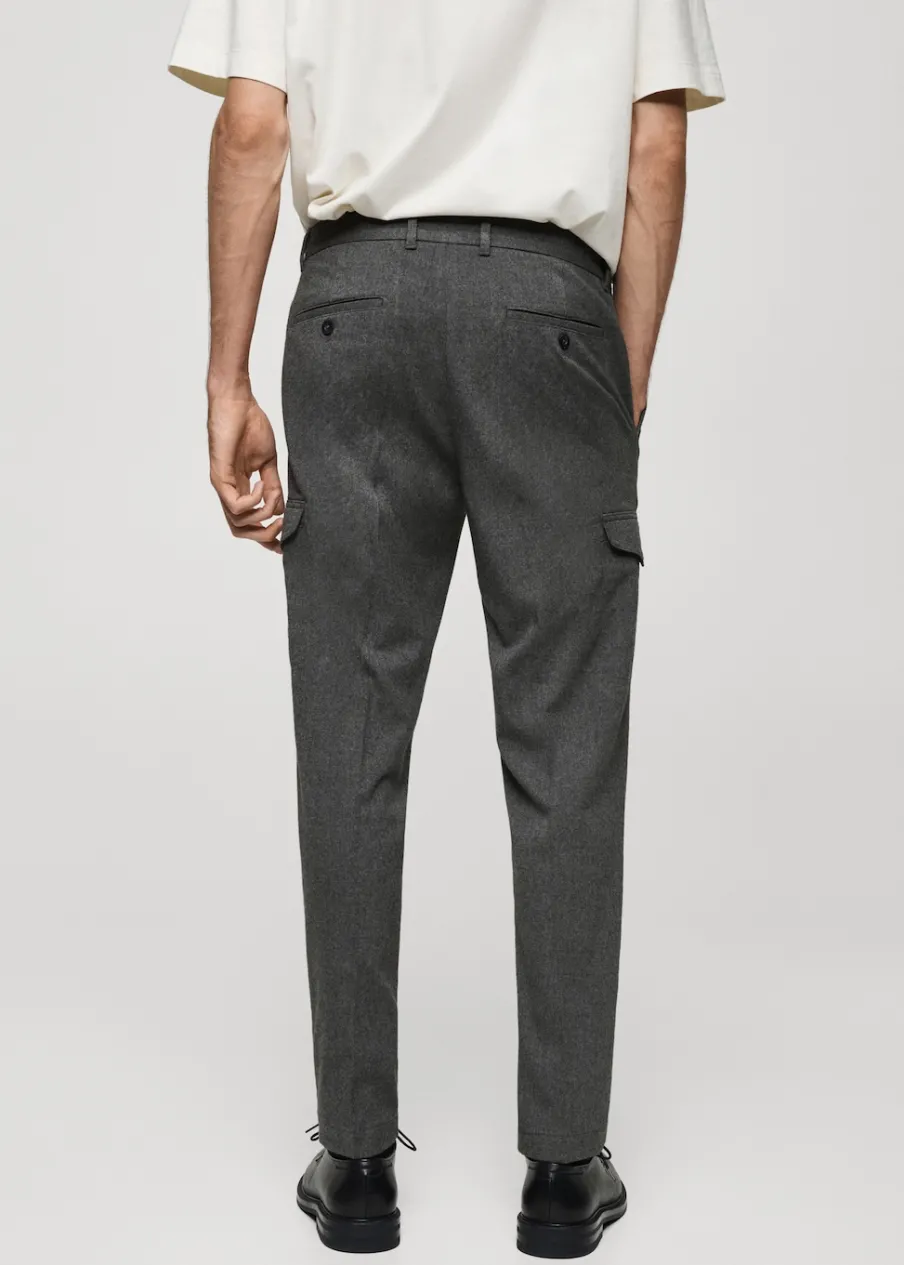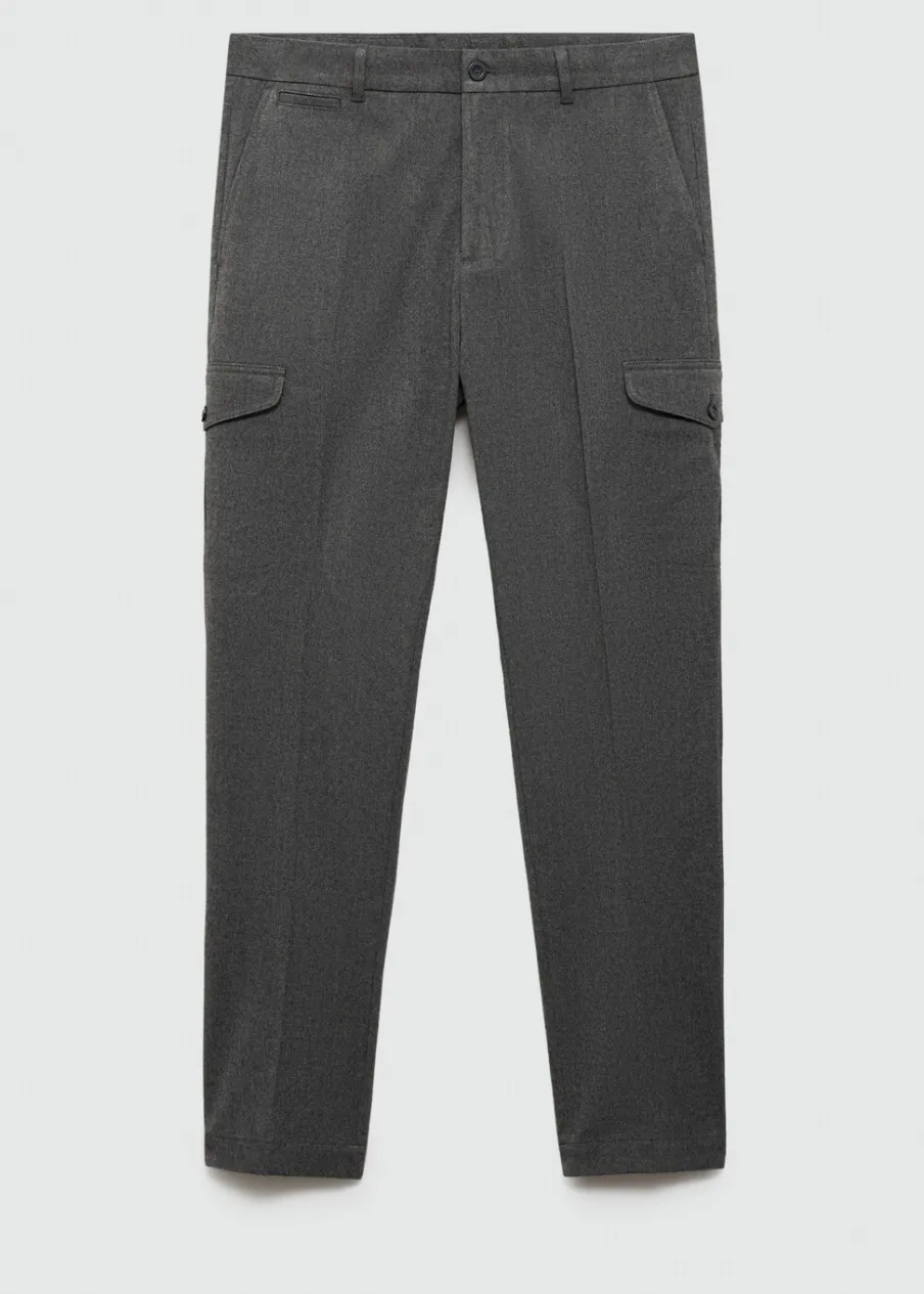 Tkanina poliestrowa z recyklingu. Krój regular. Zapięcie na suwak i guzik. Szlufki na pasek. Dwie kieszenie z przodu. Dwie naszywane kieszenie z patką na nogawce. Dwie wpuszczane kieszenie z guzikiem z tyłu. Model ma 190 cm wzrostu i nosi rozmiar 42.