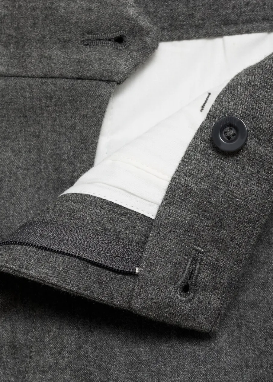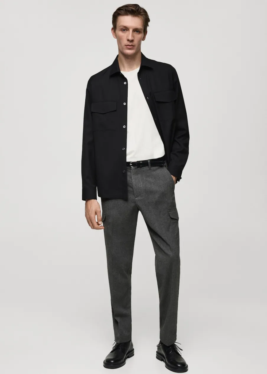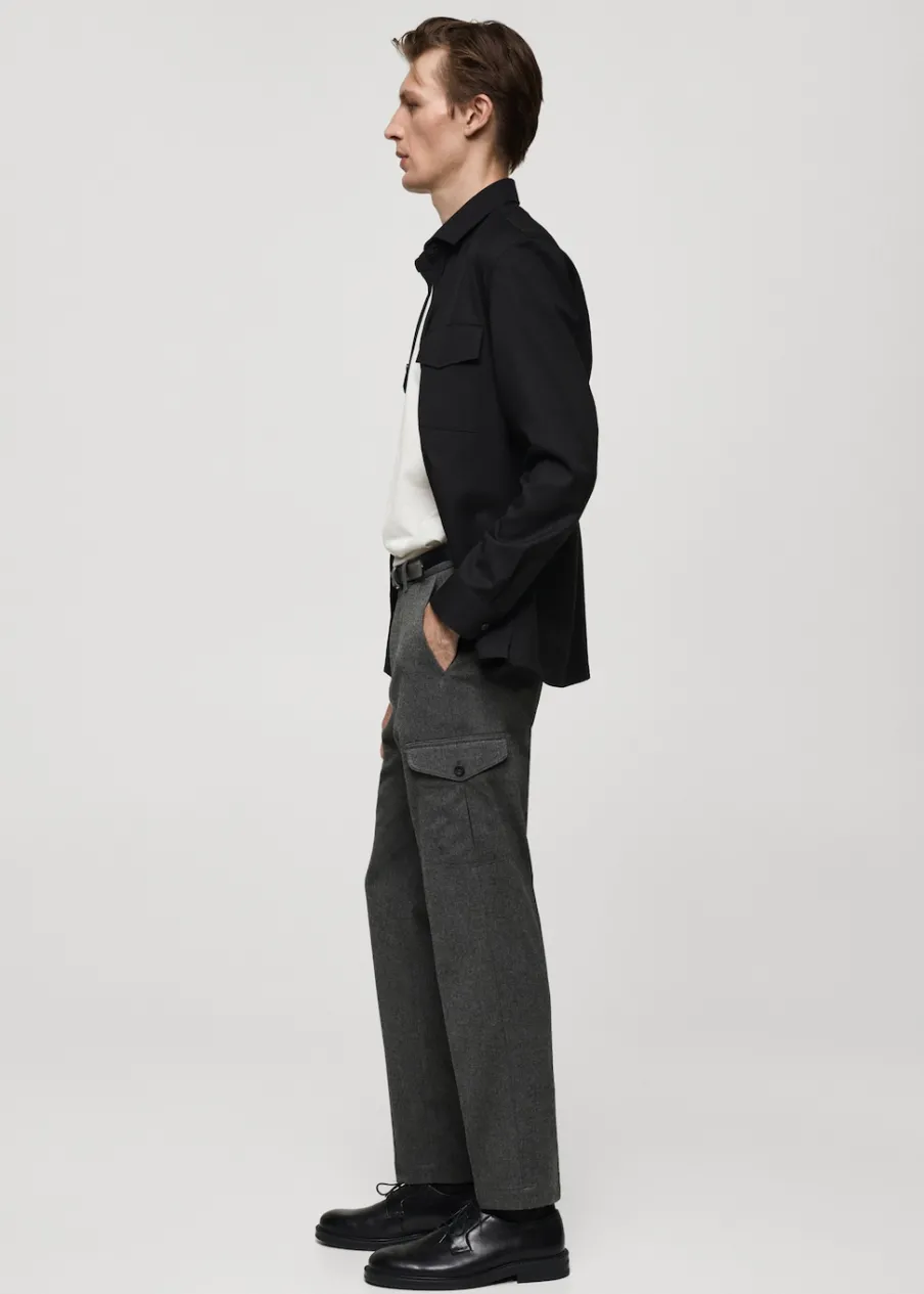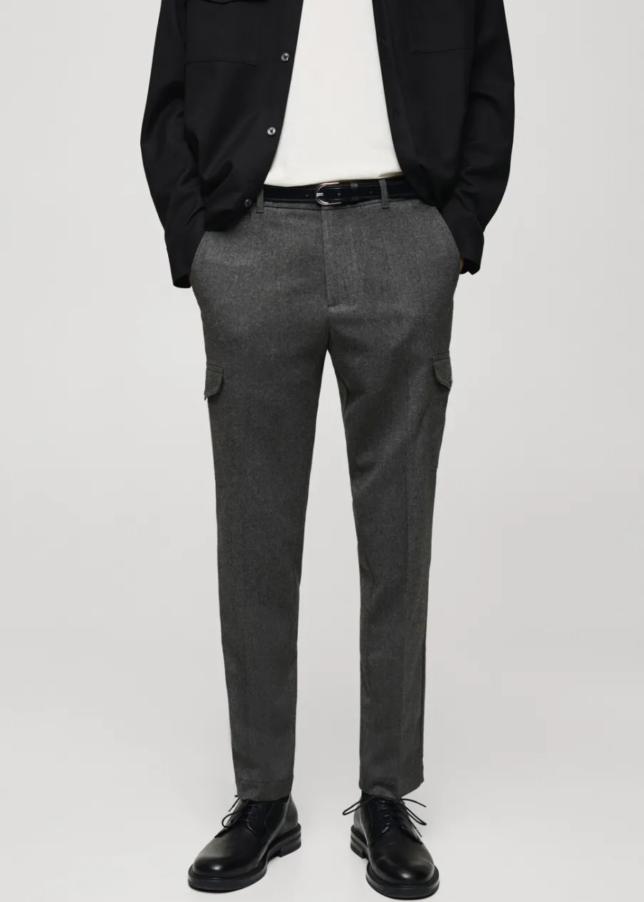 Tkanina poliestrowa z recyklingu. Krój regular. Zapięcie na suwak i guzik. Szlufki na pasek. Dwie kieszenie z przodu. Dwie naszywane kieszenie z patką na nogawce. Dwie wpuszczane kieszenie z guzikiem z tyłu. Model ma 190 cm wzrostu i nosi rozmiar 42.