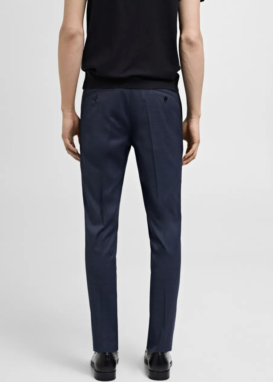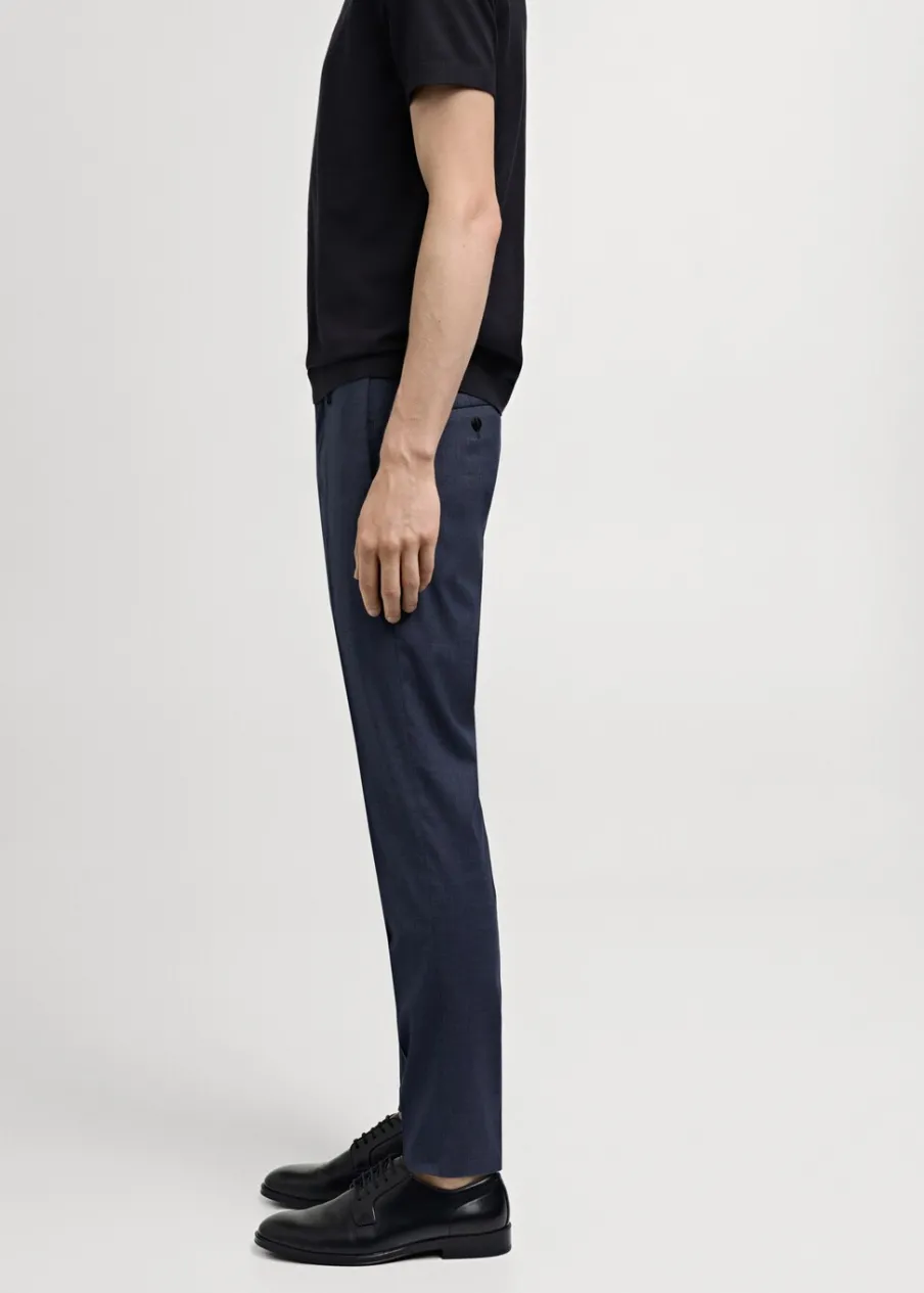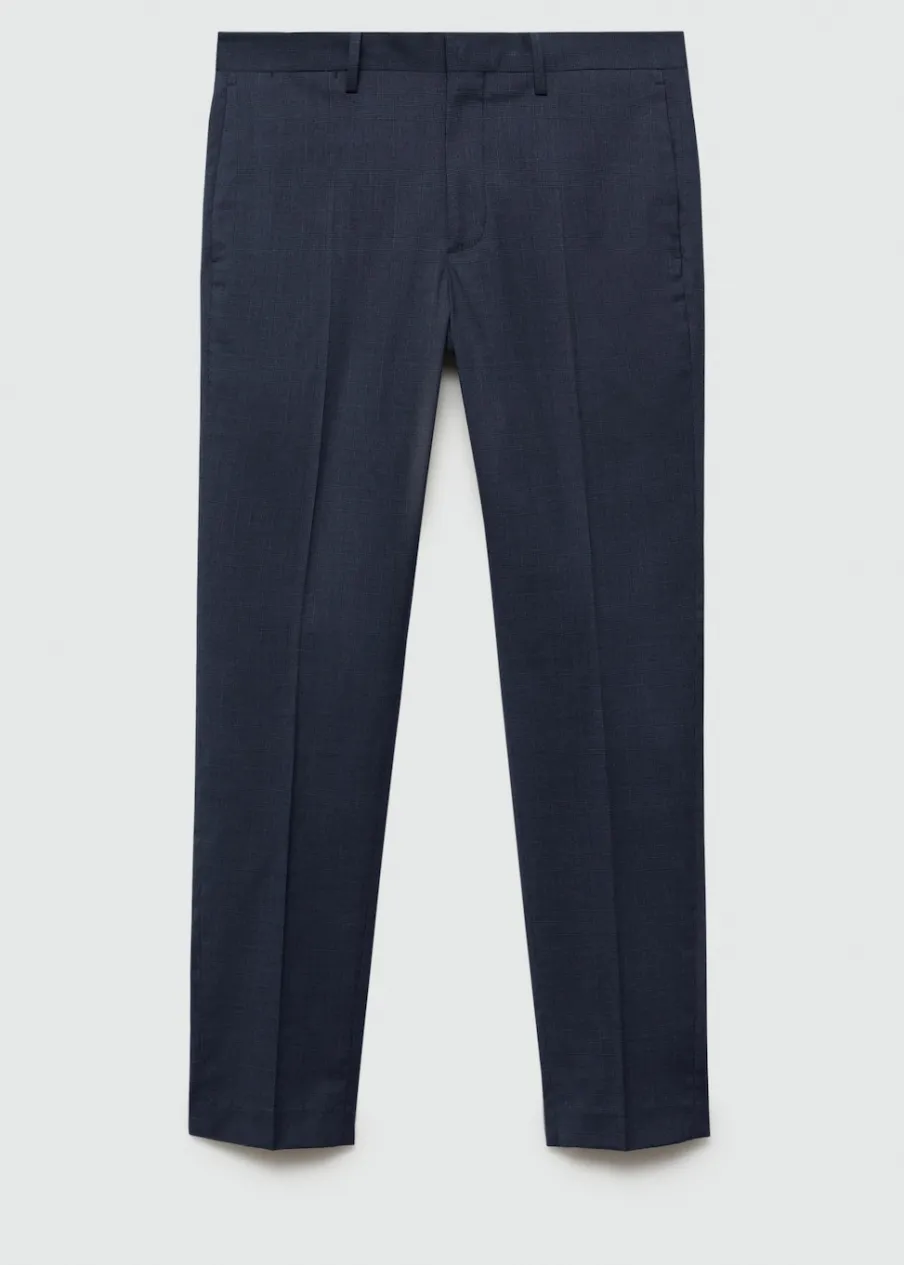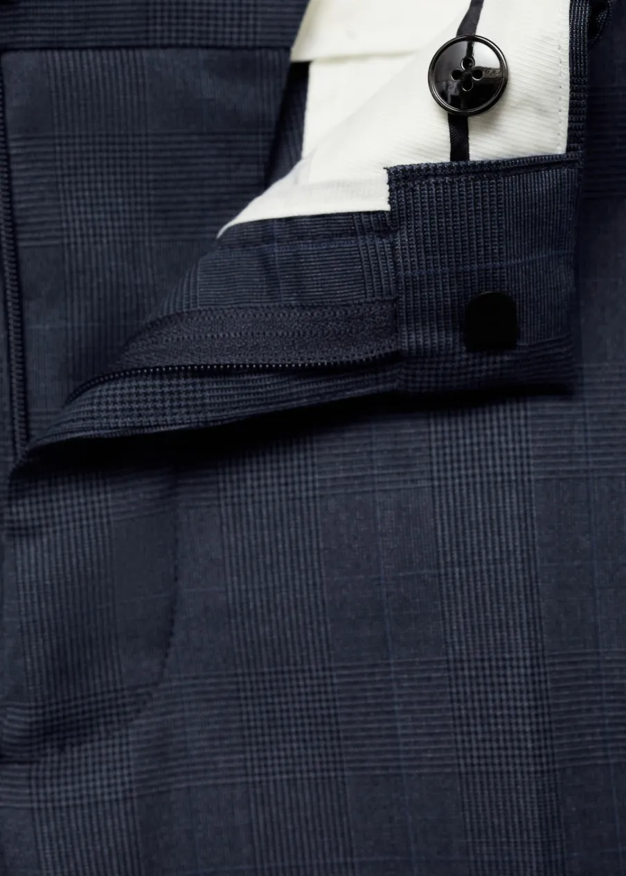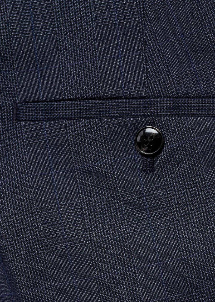Super slim-fit. Comfort stretch: elastyczna tkanina dla większego komfortu. Wzór w kratę Księcia Walii. Średni stan. Kryte zapięcie na guzik, haftkę i suwak. Szlufki na pasek. Dwie kieszenie boczne. Dwie wpuszczane kieszenie z guzikiem z tyłu. Model ma 185 cm wzrostu i nosi rozmiar 42. Zaprasowany kant z przodu i z tyłu. Komfort: to ubranie zapewnia pełną swobodę ruchu i odzyskuje swój pierwotny kształt.
