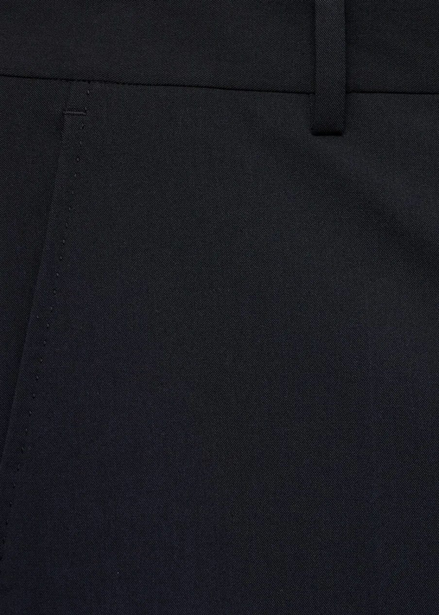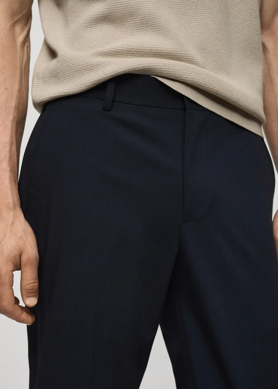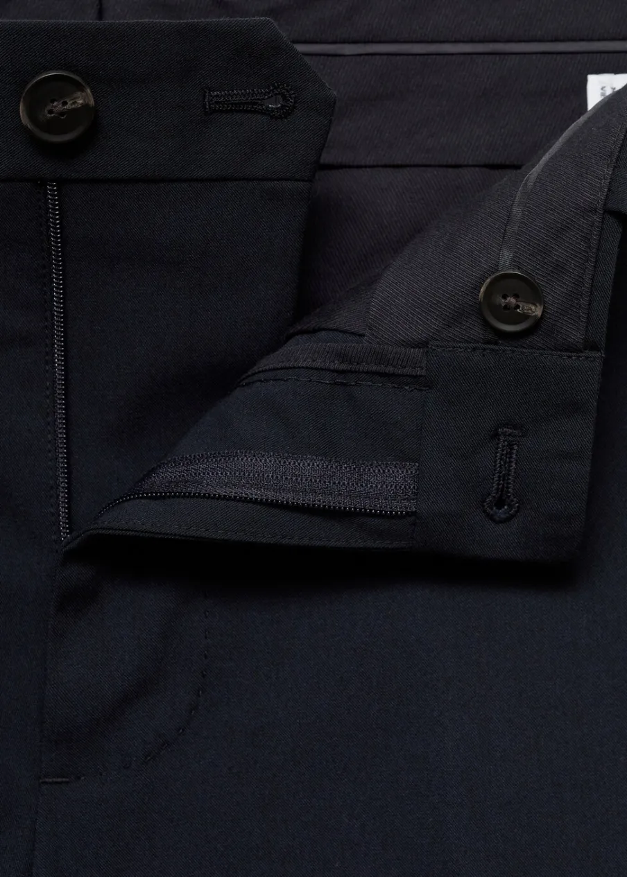 Slim-fit. Tkanina poliestrowa z recyklingu. Podwójne zapięcie na guzik i zamek. Szlufki na pasek. Dwie kieszenie boczne. Dwie wpuszczane kieszenie z guzikiem z tyłu. Zaprasowany kant z przodu i z tyłu.