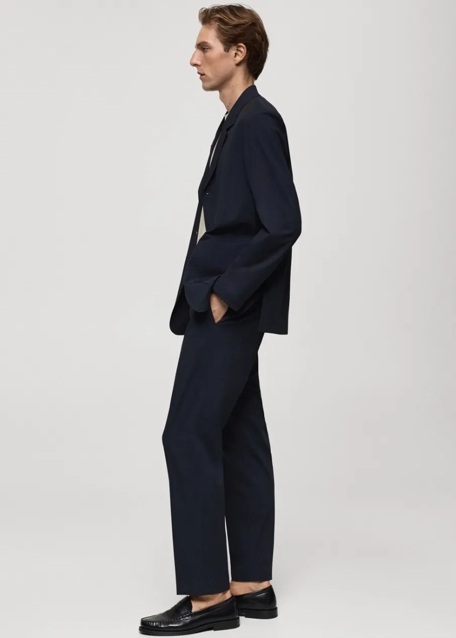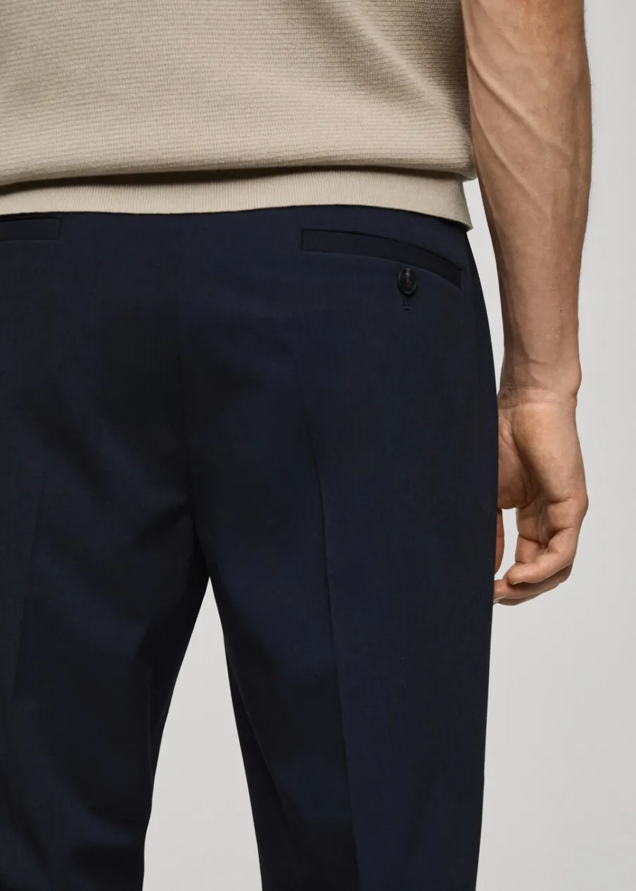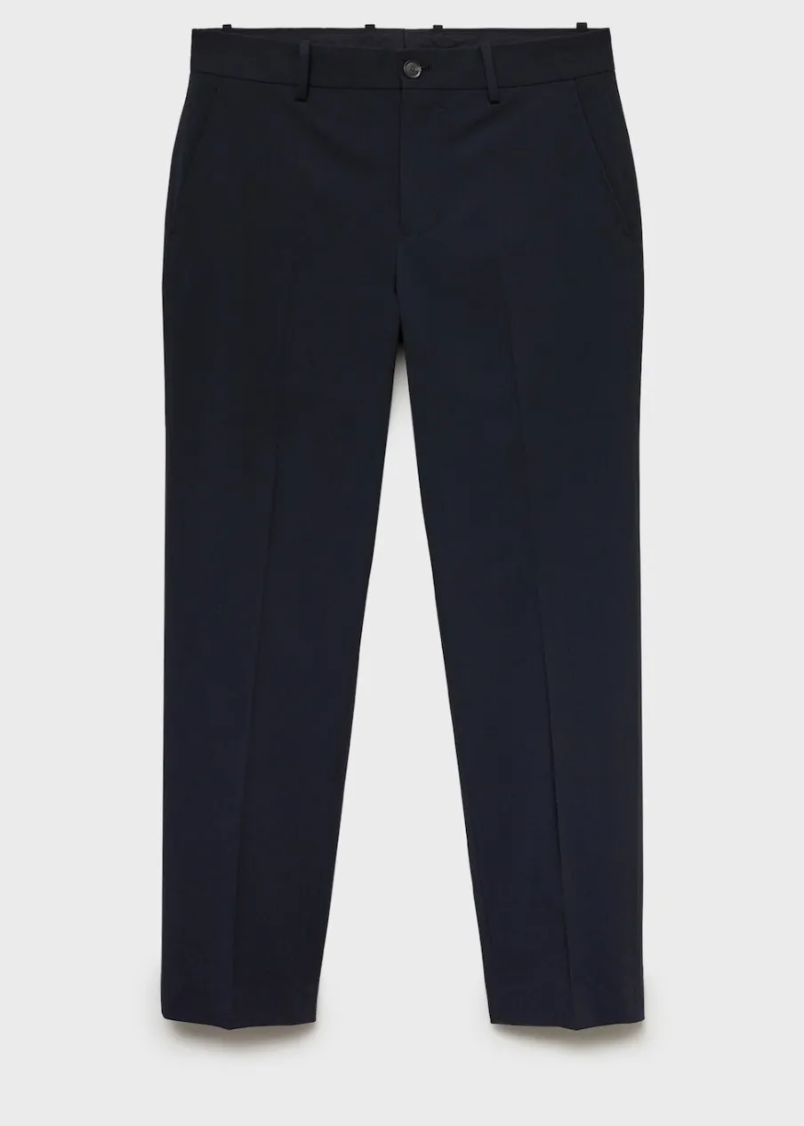 Slim-fit. Tkanina poliestrowa z recyklingu. Podwójne zapięcie na guzik i zamek. Szlufki na pasek. Dwie kieszenie boczne. Dwie wpuszczane kieszenie z guzikiem z tyłu. Zaprasowany kant z przodu i z tyłu.