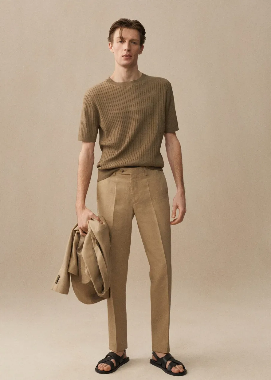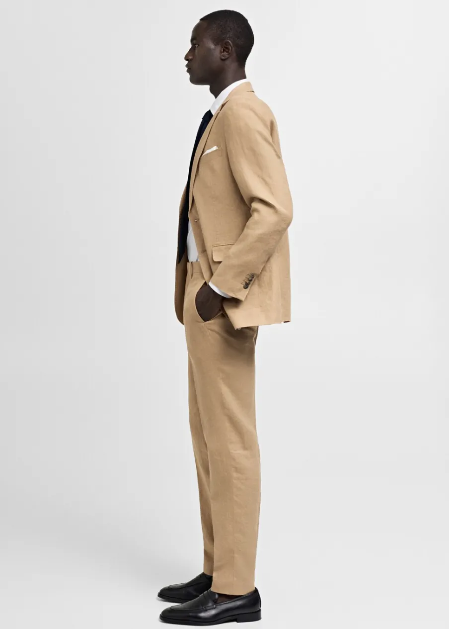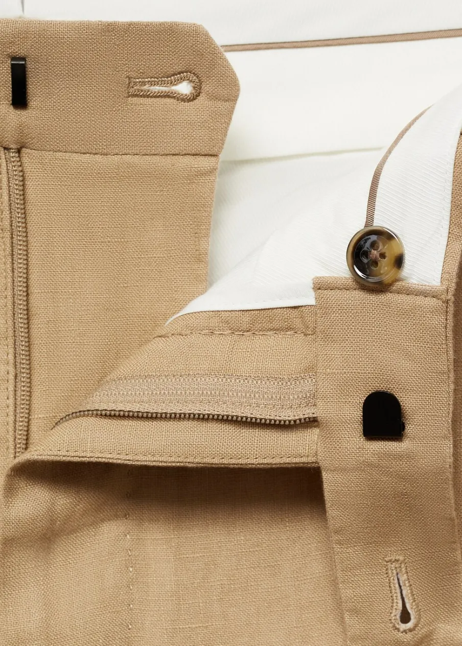 Slim-fit. Tkanina z 100% lnu. Średni stan. Zapięcie z przodu na guzik, haftkę i zamek. Dwie kieszenie z przodu. Dwie wpuszczane kieszenie z tyłu. Model ma 185 cm wzrostu i nosi rozmiar 42. Zaprasowany kant z przodu i z tyłu.