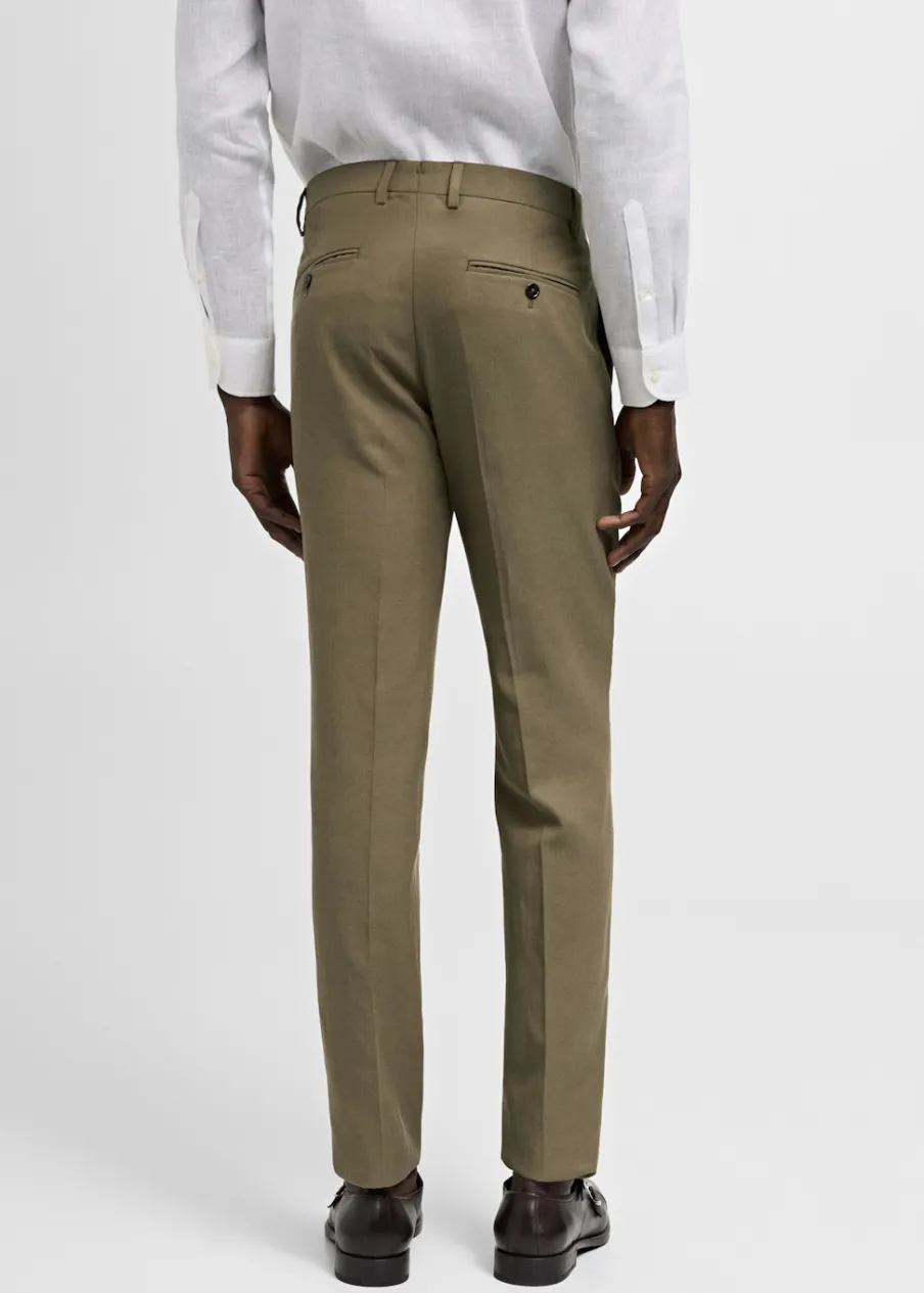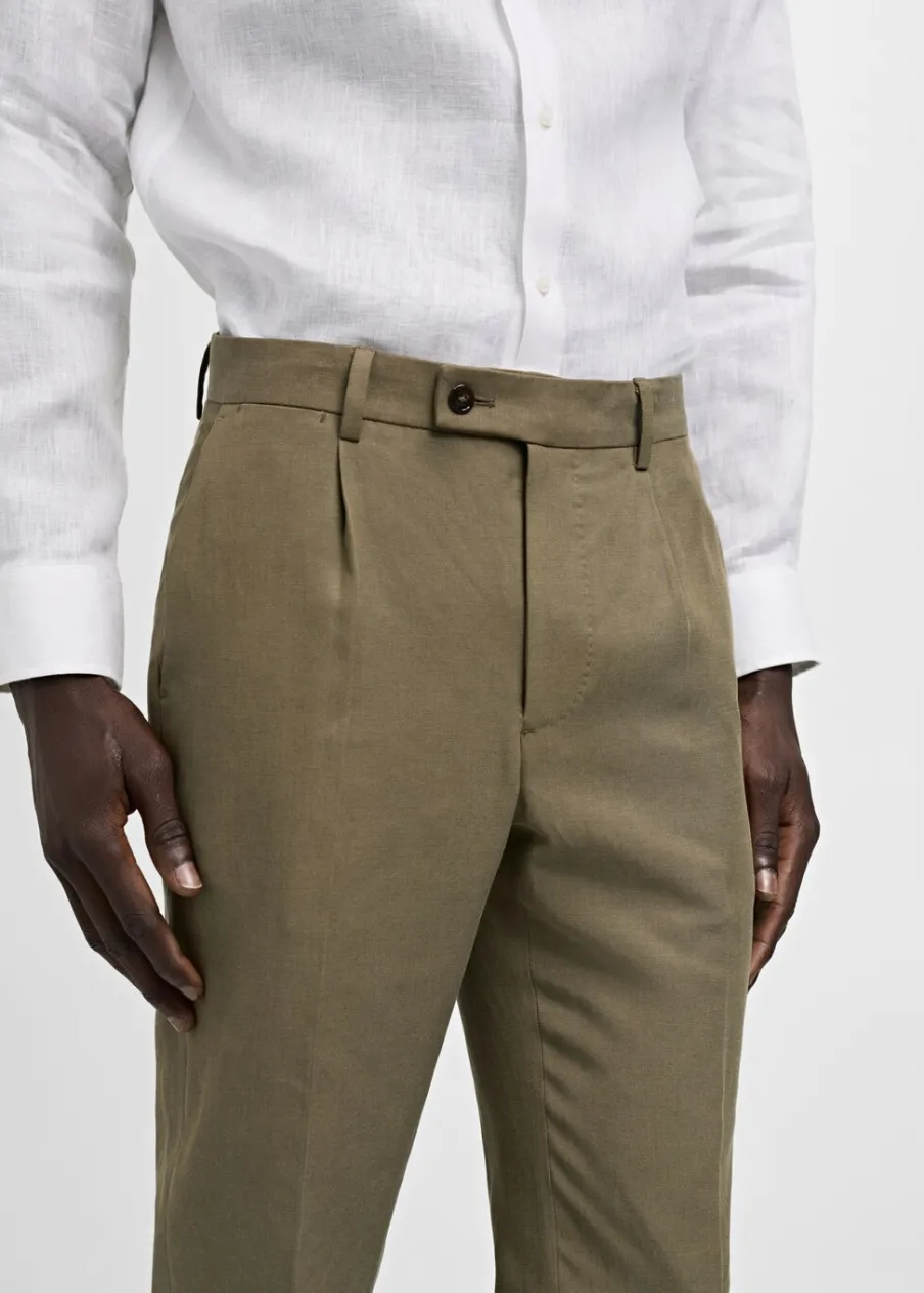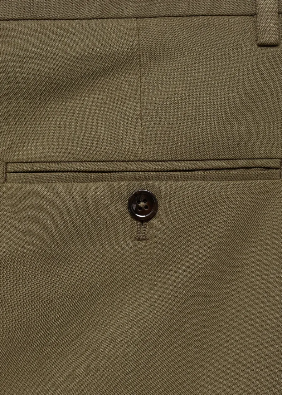 Slim-fit. Średni stan. Szlufki na pasek. Zapięcie na guziki, zamek i haftkę. Zaszewki z przodu. Dwie kieszenie z przodu. Tylna kieszeń wpuszczana zapinana na guzik. Model ma 185 cm wzrostu i nosi rozmiar 42. Tkanina mieszana z lyocellu, bawełny i lnu. Zaprasowany kant z przodu i z tyłu.