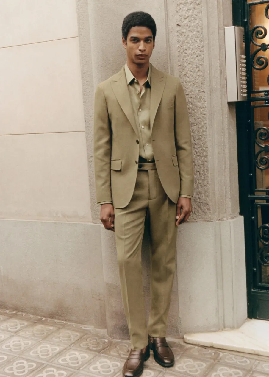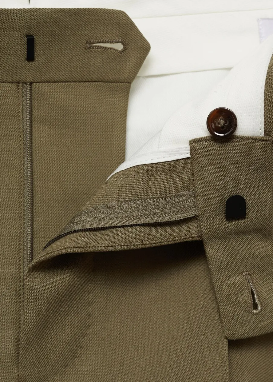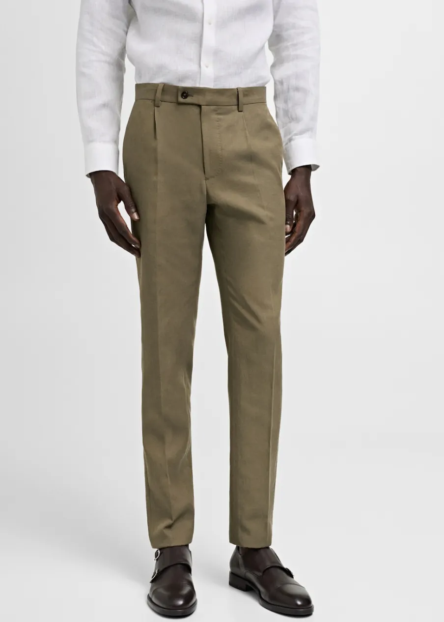 Slim-fit. Średni stan. Szlufki na pasek. Zapięcie na guziki, zamek i haftkę. Zaszewki z przodu. Dwie kieszenie z przodu. Tylna kieszeń wpuszczana zapinana na guzik. Model ma 185 cm wzrostu i nosi rozmiar 42. Tkanina mieszana z lyocellu, bawełny i lnu. Zaprasowany kant z przodu i z tyłu.