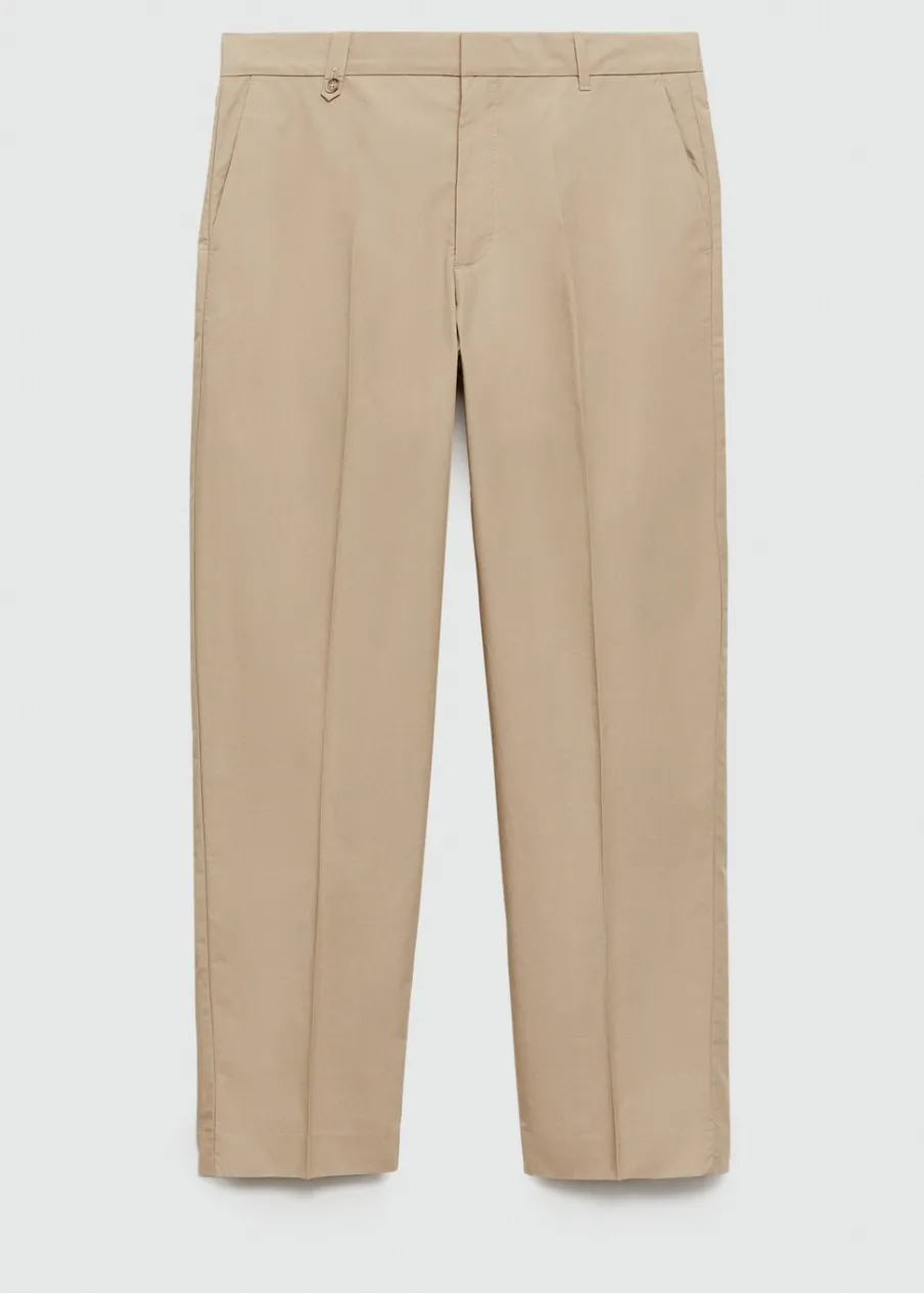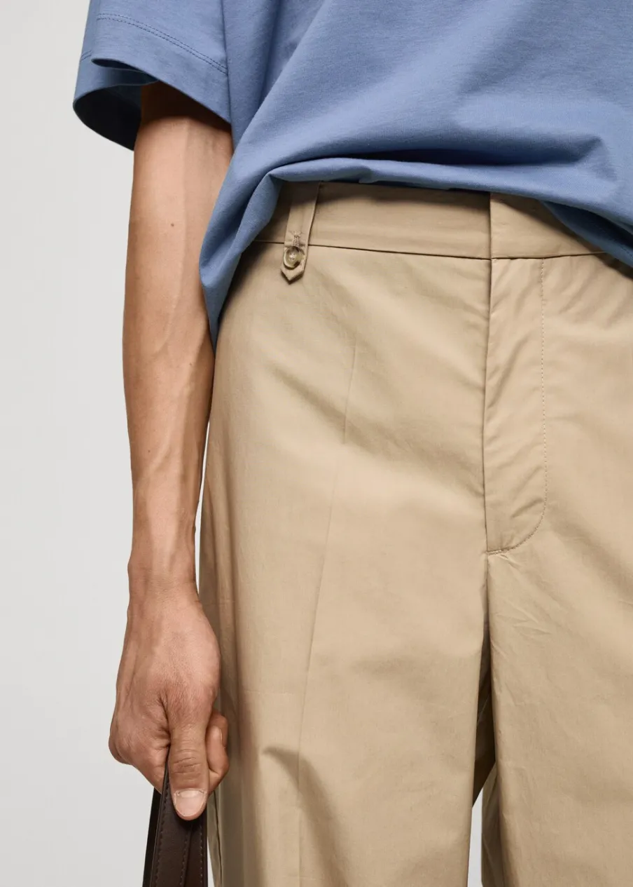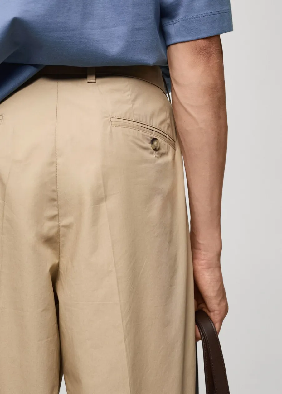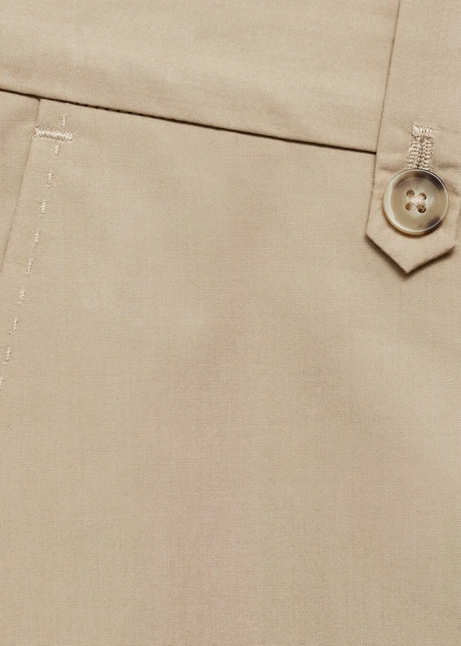 Krój regular. Patka z guzikiem w pasie. Dwie kieszenie z przodu. Zapięcie z przodu na guzik, haftkę i zamek. Dwie wpuszczane kieszenie z guzikiem z tyłu. Model ma 185 cm wzrostu i nosi rozmiar 42. Zaprasowany kant z przodu i z tyłu. Tkanina z 100% bawełny.