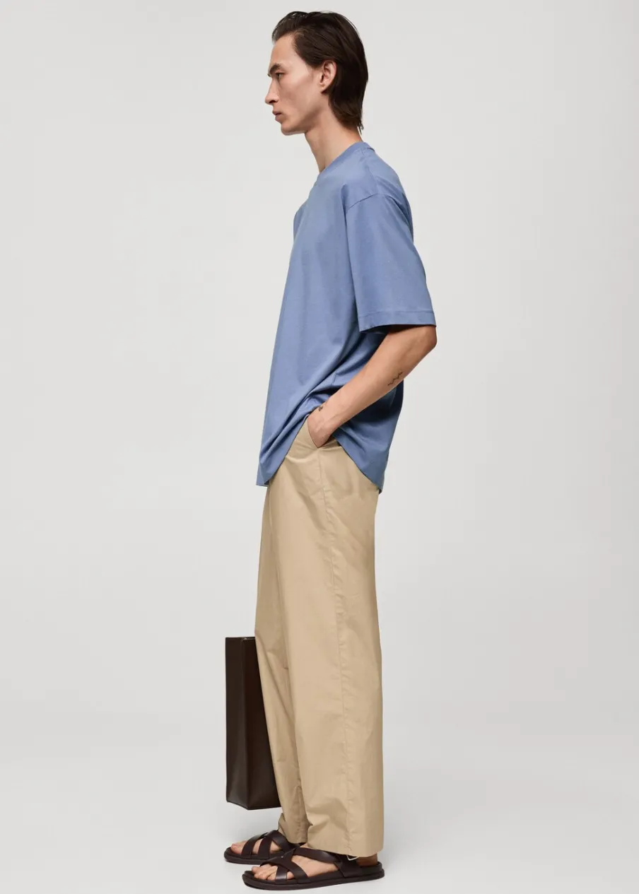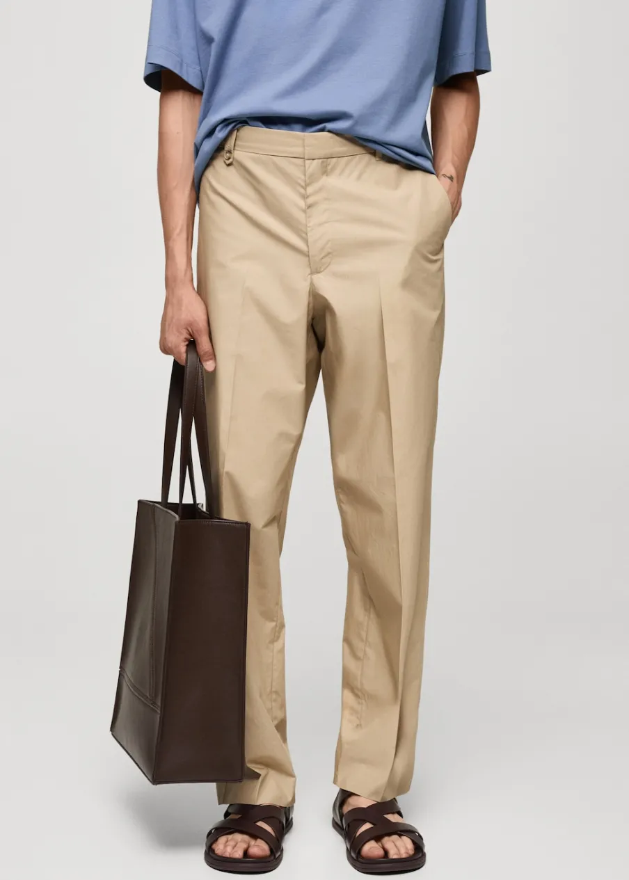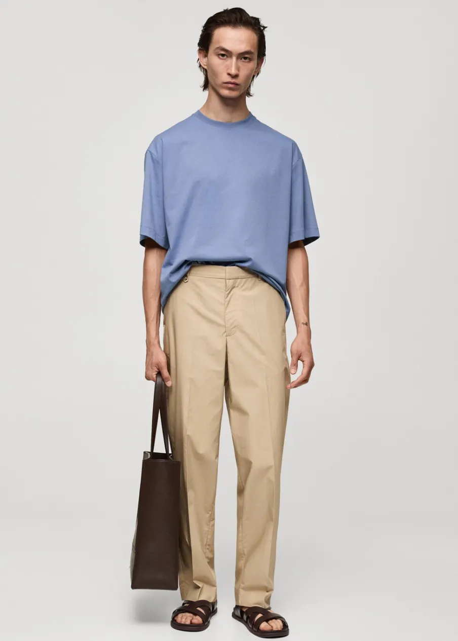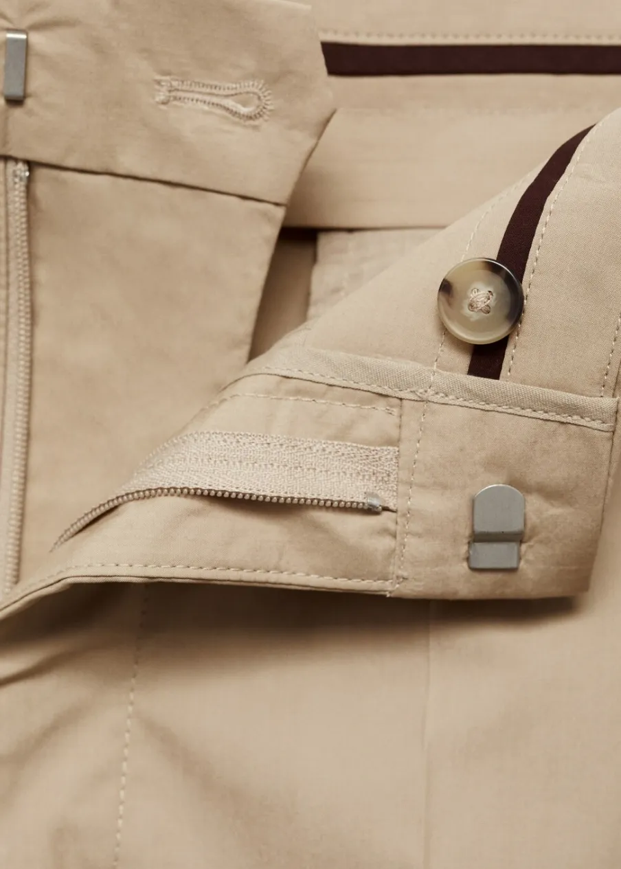 Krój regular. Patka z guzikiem w pasie. Dwie kieszenie z przodu. Zapięcie z przodu na guzik, haftkę i zamek. Dwie wpuszczane kieszenie z guzikiem z tyłu. Model ma 185 cm wzrostu i nosi rozmiar 42. Zaprasowany kant z przodu i z tyłu. Tkanina z 100% bawełny.