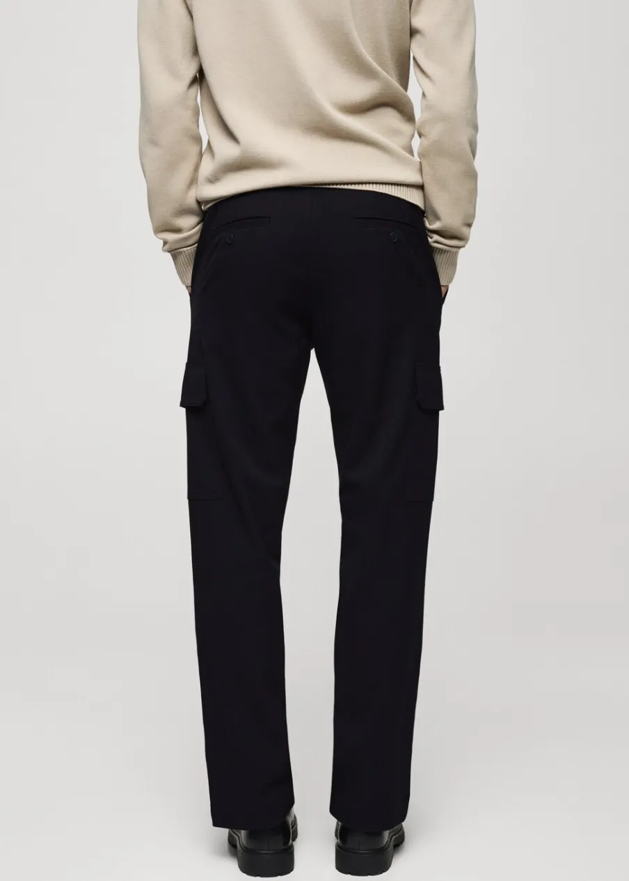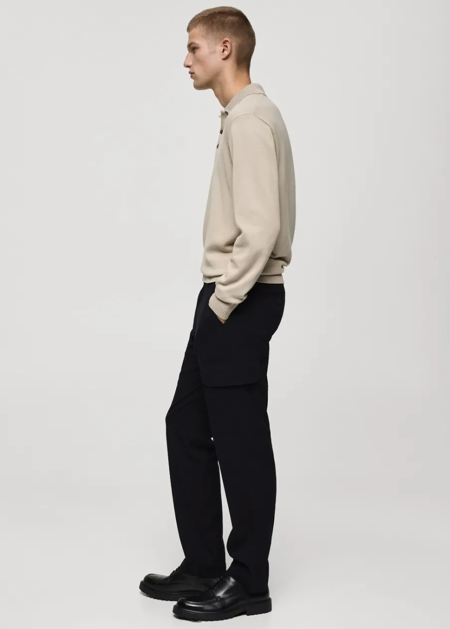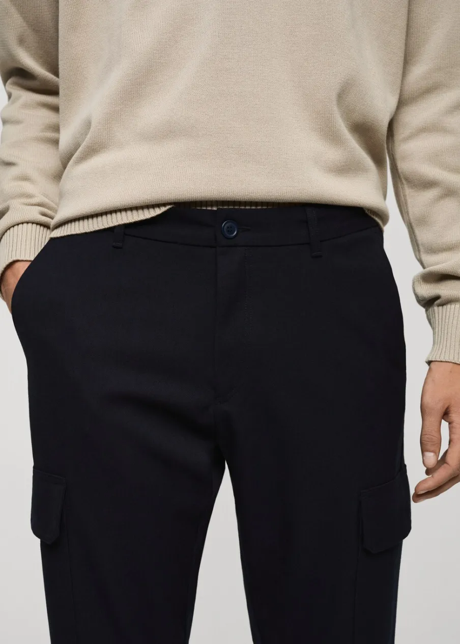 Fason cargo. Tkanina o skośnym splocie. Krój regular. Średni stan. Podwójne zapięcie na guzik i zamek. Szlufki na pasek. Dwie kieszenie z przodu. Dwie naszywane kieszenie z patką na nogawce. Dwie wpuszczane kieszenie z guzikiem z tyłu. Model ma 190 cm wzrostu i nosi rozmiar 42.