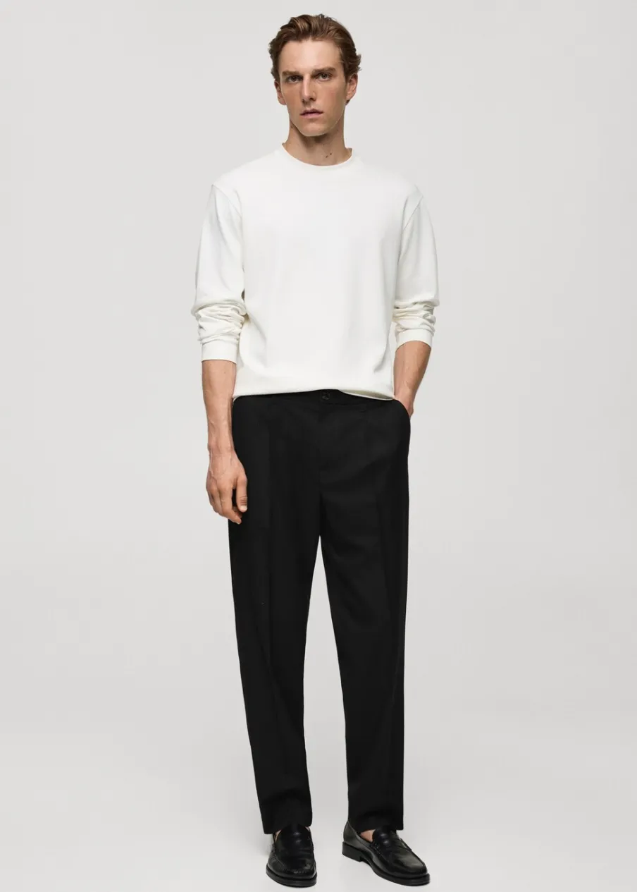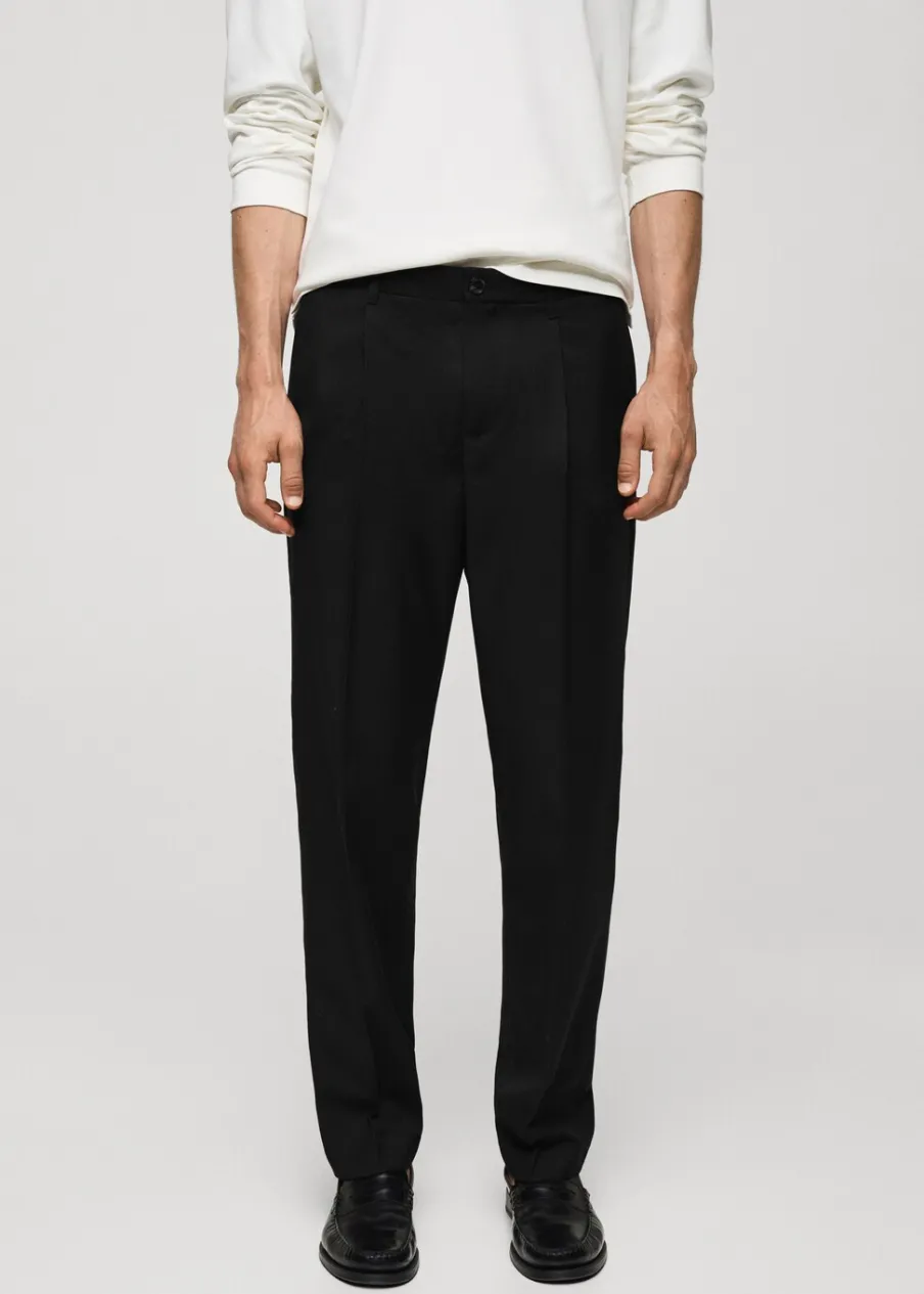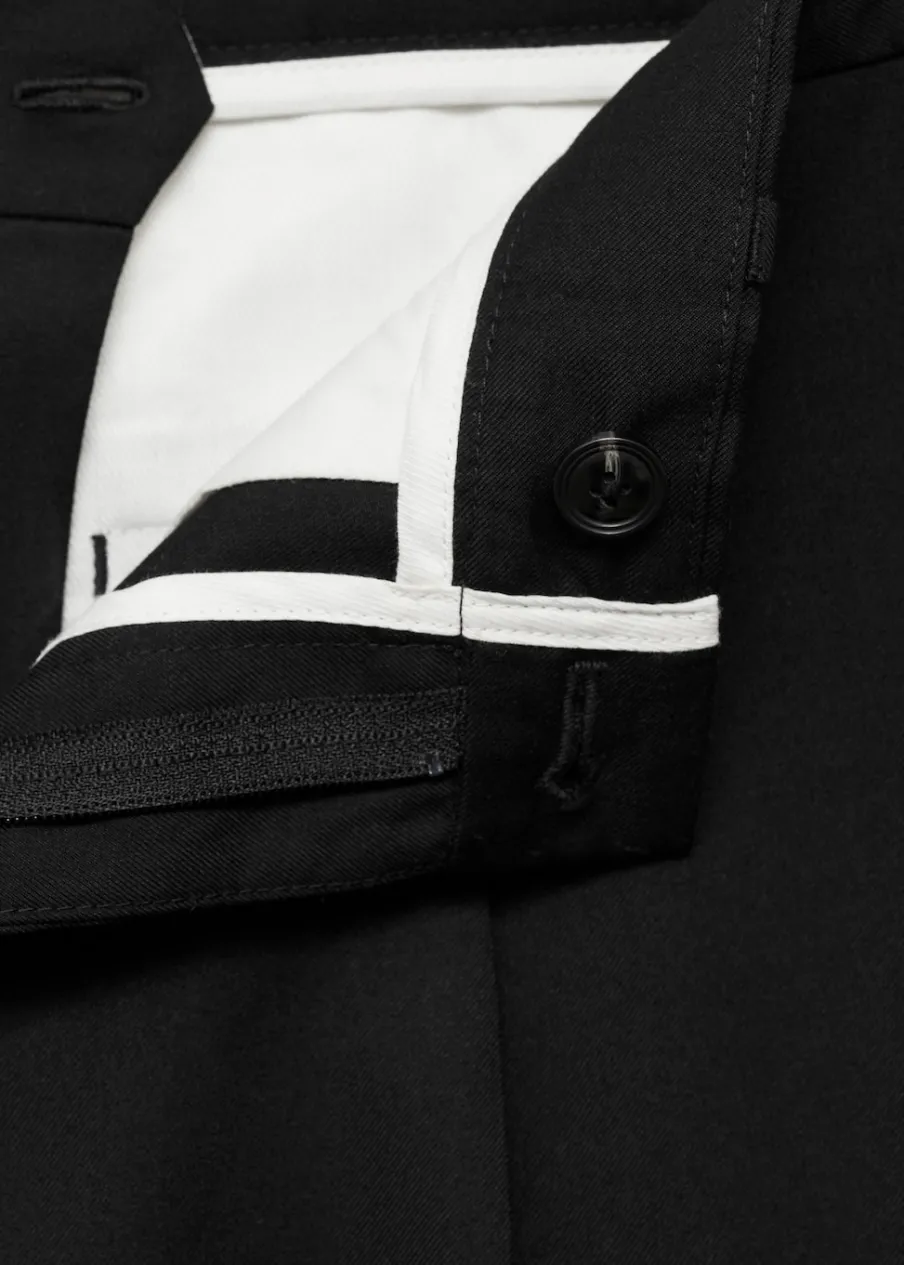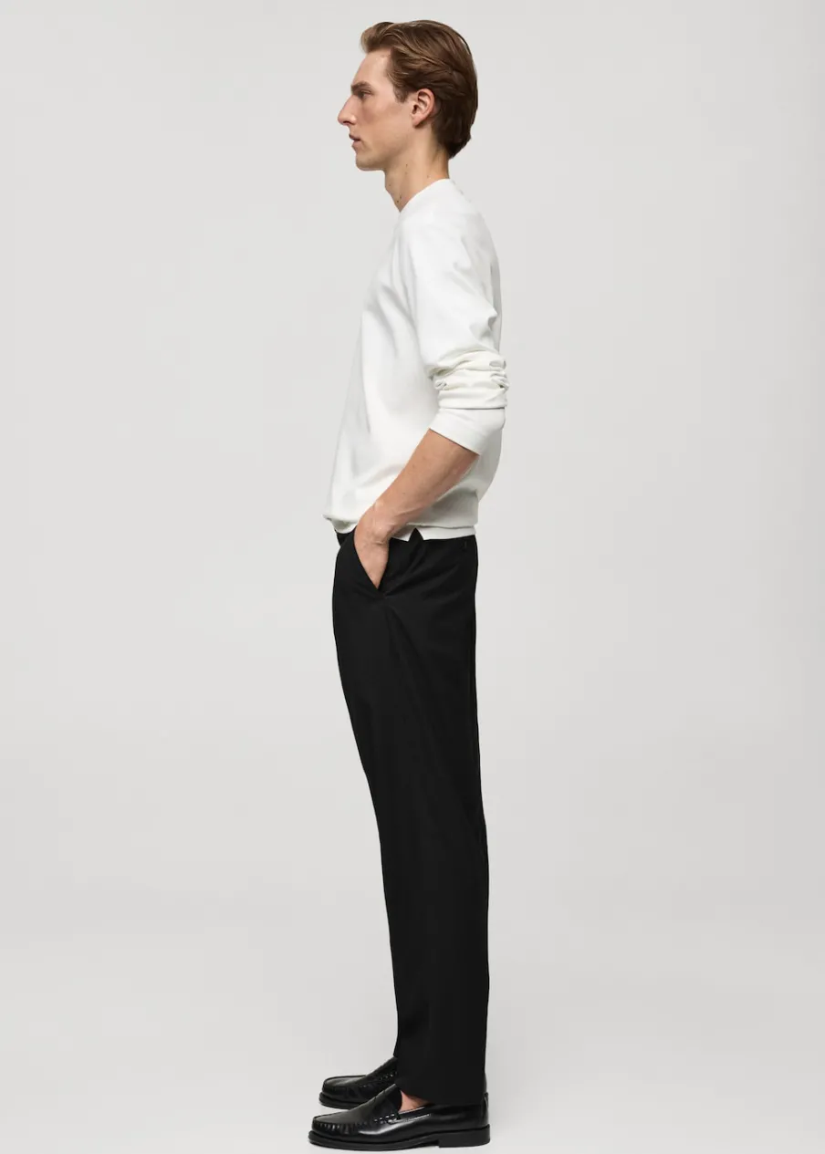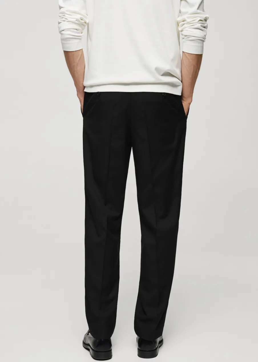 Krój regular. Średni stan. Dwurzędowe zapięcie z przodu na guziki i zamek. Szlufki na pasek. Elastyczna gumka z tyłu. Dwie kieszenie z przodu. Zaszewki z przodu. Model ma 190 cm wzrostu i nosi rozmiar 42. Dostępny zestaw total look. Zaprasowany kant z przodu i z tyłu.