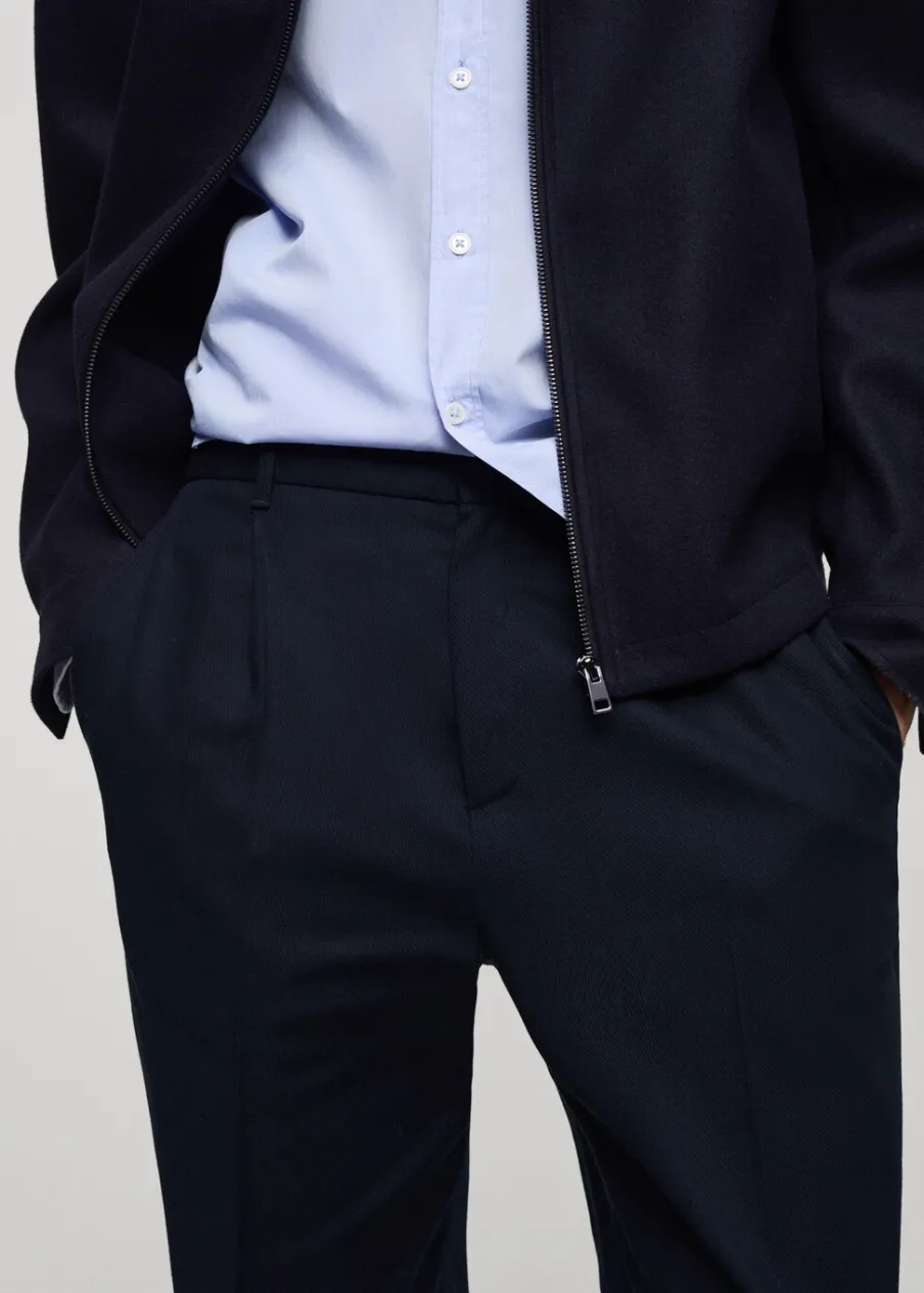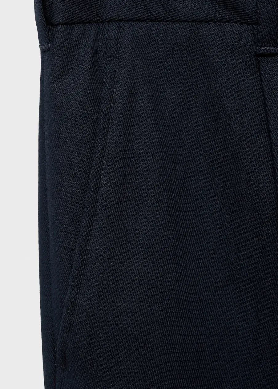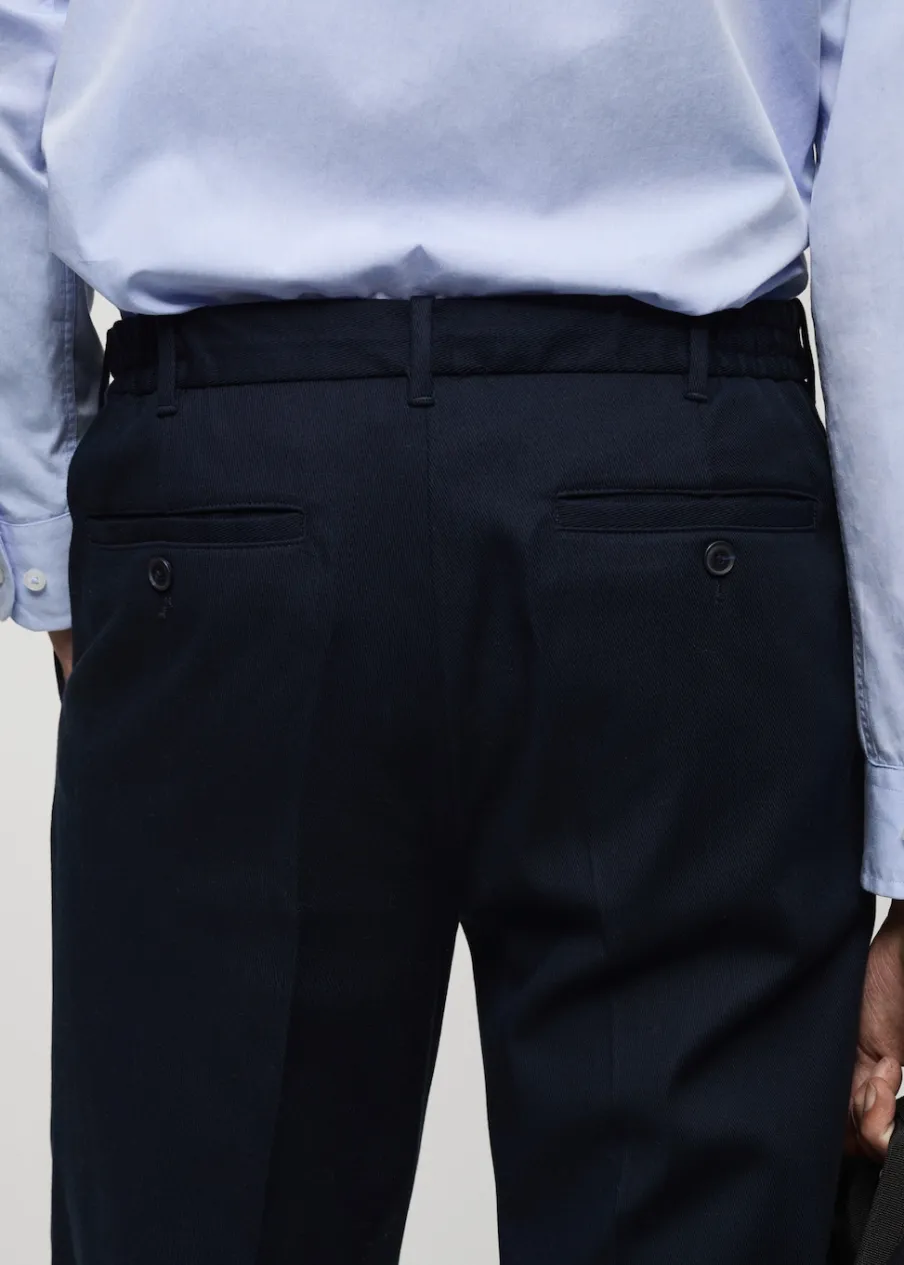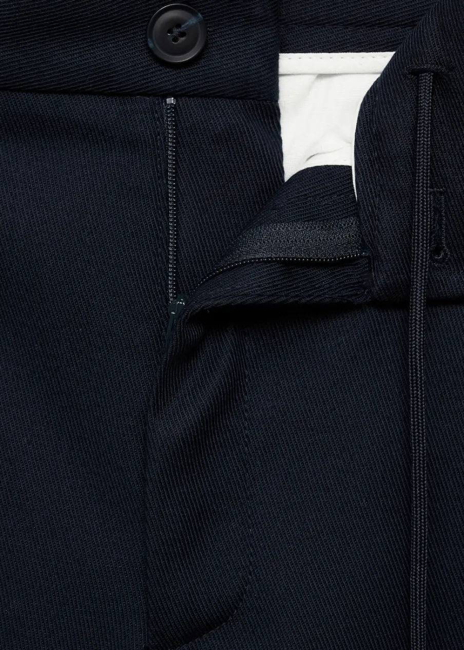 Prosty krój. Tkanina mieszana z bawełny i tencelu. Zapięcie na guzik i zamek. Wewnętrzny sznurek regulowany w pasie. Szlufki na pasek. Zaprasowany kant z przodu i z tyłu. Zaszewki z przodu. Dwie kieszenie z przodu. Dwie wpuszczane kieszenie z tyłu. Model ma 190 cm wzrostu i nosi rozmiar 42.