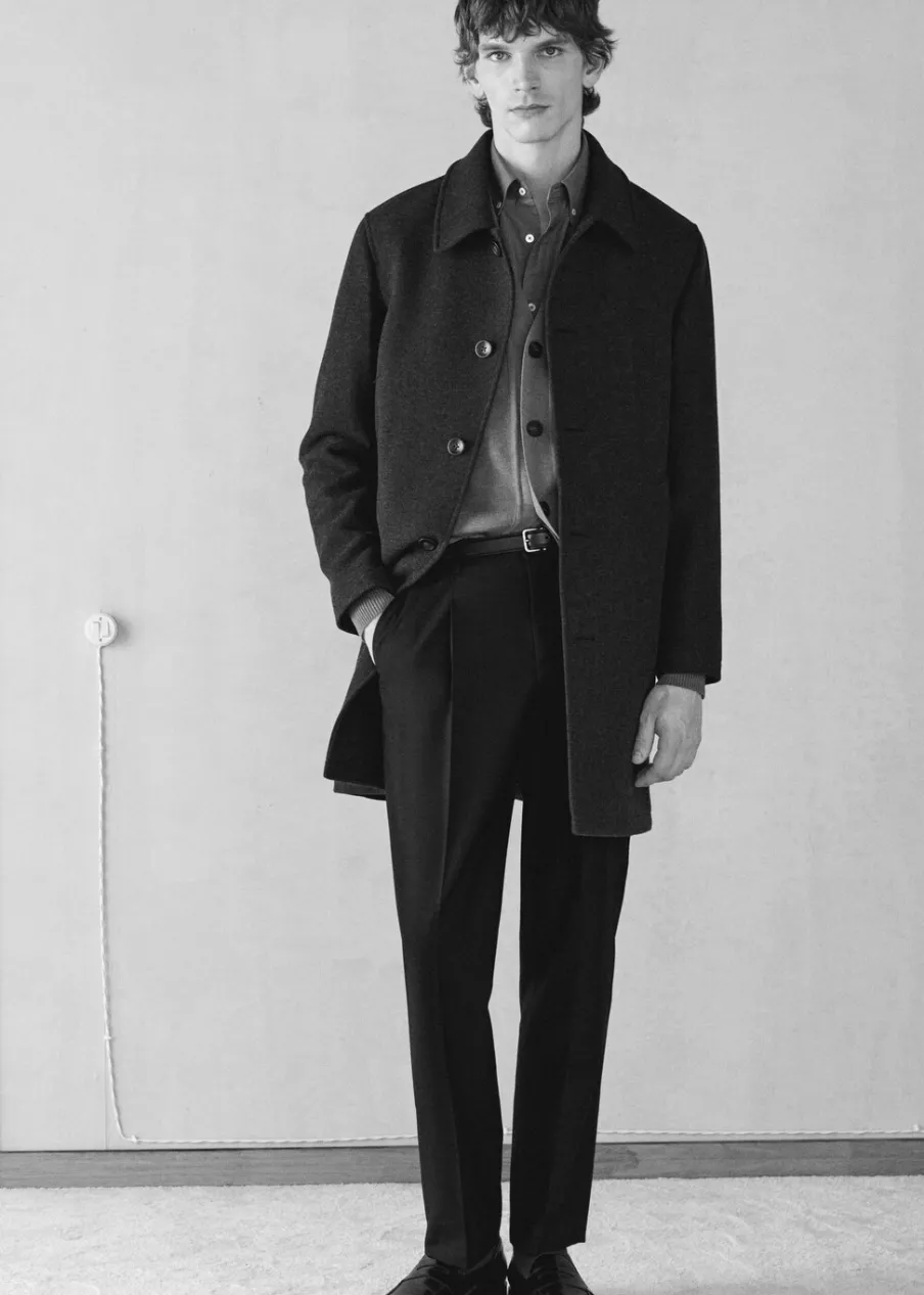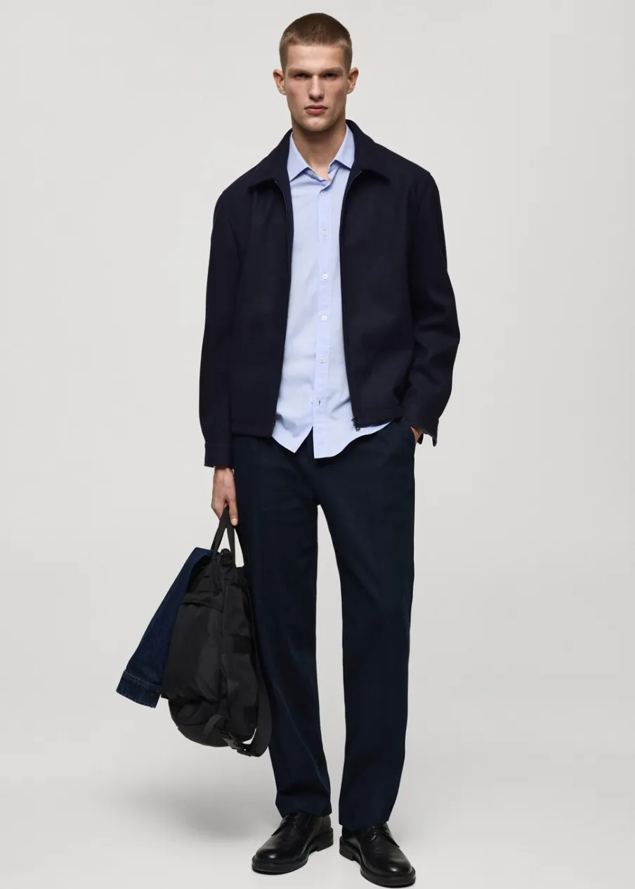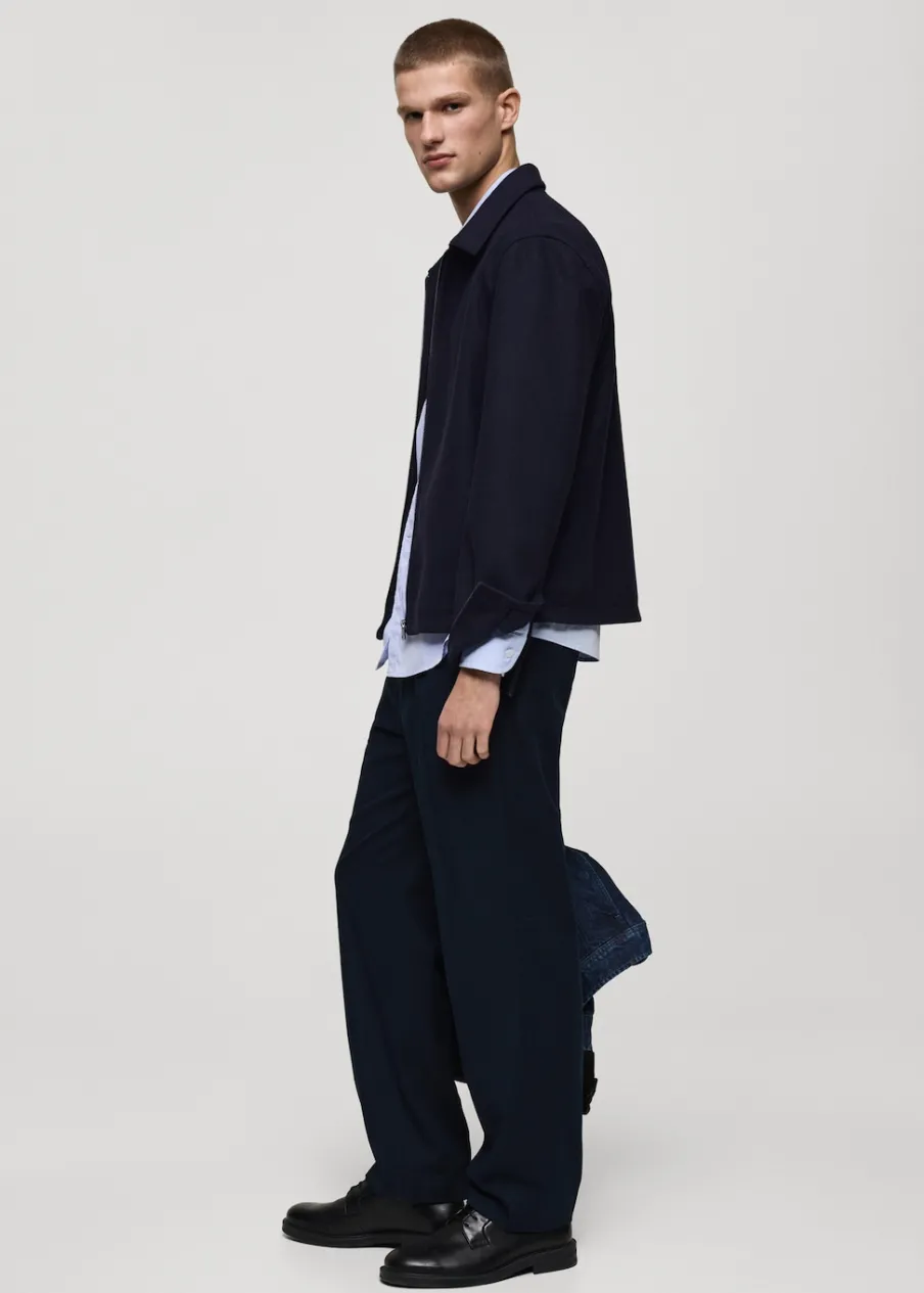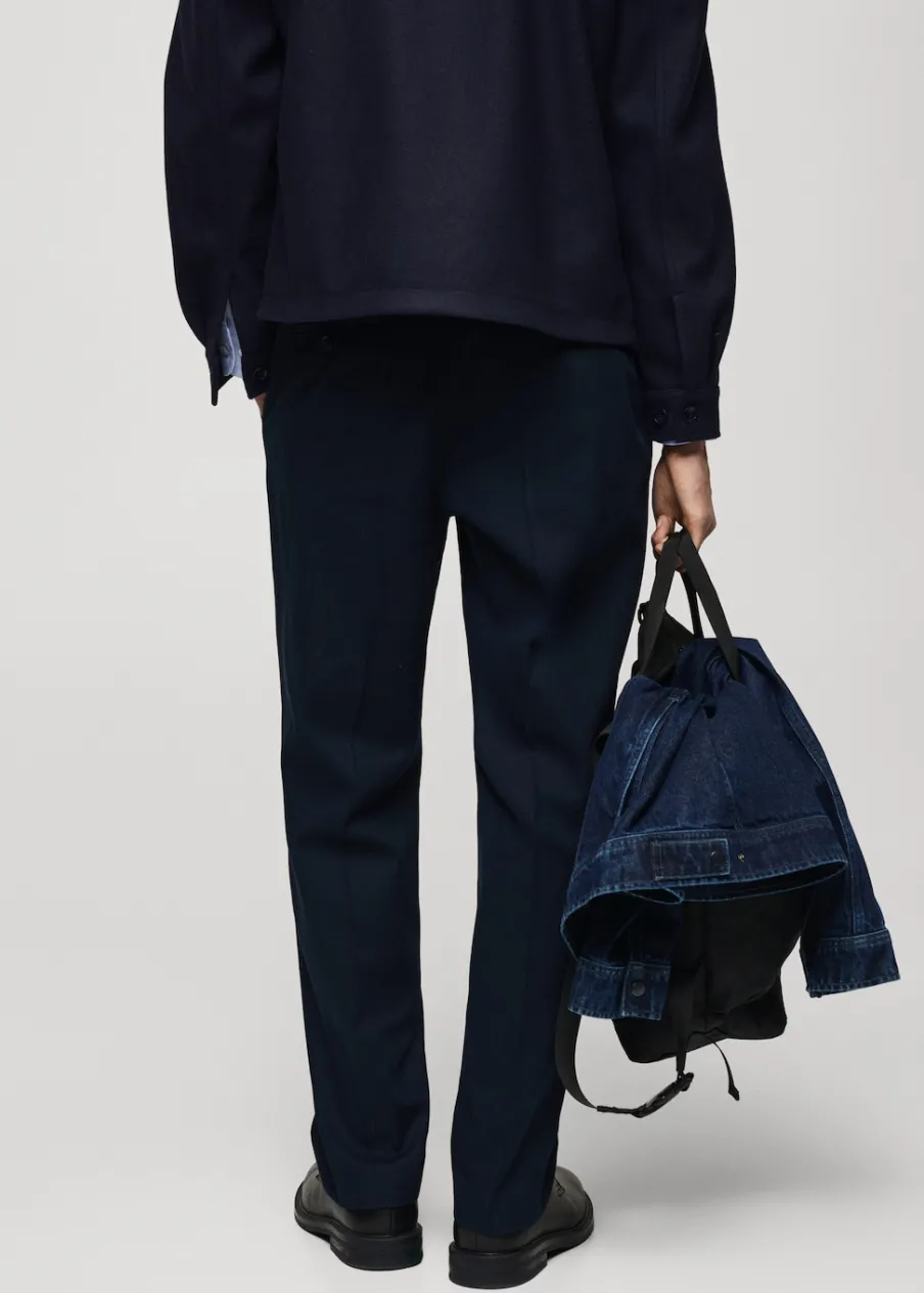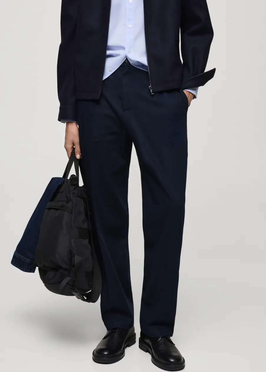 Prosty krój. Tkanina mieszana z bawełny i tencelu. Zapięcie na guzik i zamek. Wewnętrzny sznurek regulowany w pasie. Szlufki na pasek. Zaprasowany kant z przodu i z tyłu. Zaszewki z przodu. Dwie kieszenie z przodu. Dwie wpuszczane kieszenie z tyłu. Model ma 190 cm wzrostu i nosi rozmiar 42.