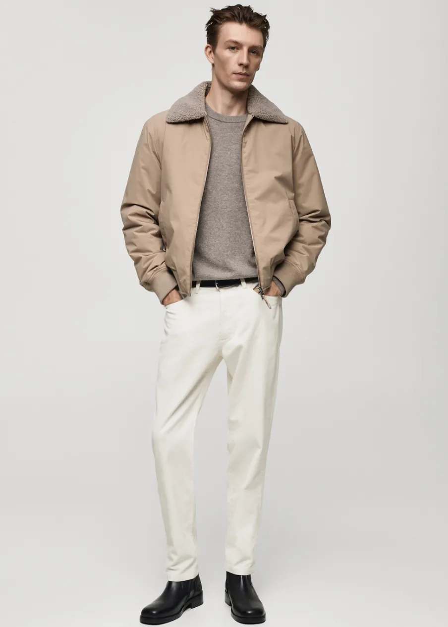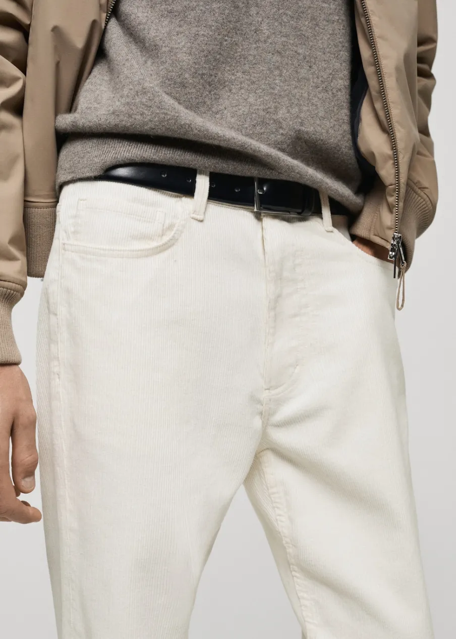 Sztruksowa tkanina. Zapięcie na suwak i guzik. Kieszeń na bilon. Dwie kieszenie boczne. Dwie kieszenie nakładane z tyłu. Szlufki na pasek. Model ma 185 cm wzrostu i nosi rozmiar 42. Krój regular.
