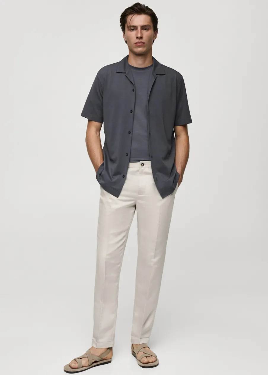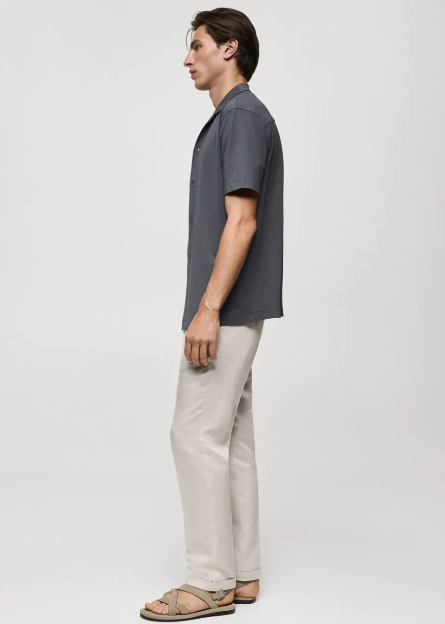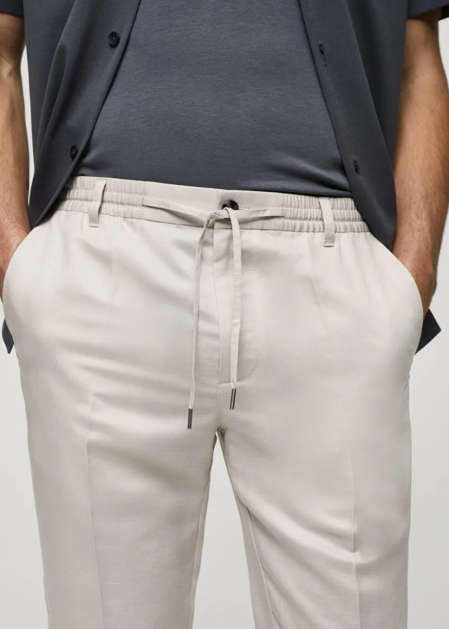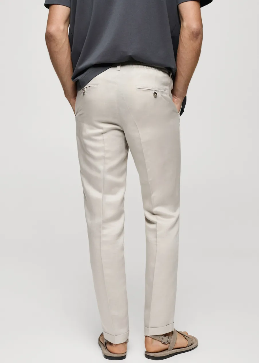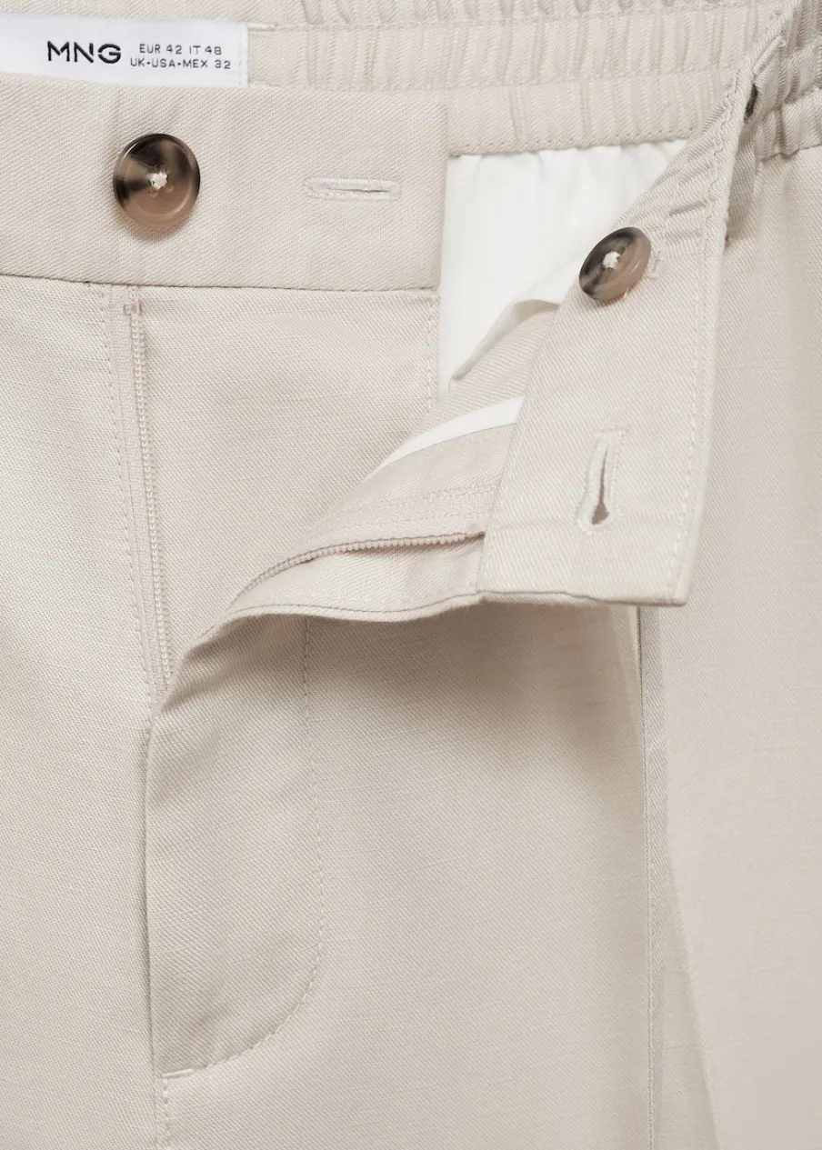 Tkanina mieszana z lnu i lyocellu. Elastyczny pas z regulowanym sznurkiem. Szlufki na pasek. Dwie kieszenie z przodu. Dwie wpuszczane kieszenie z guzikiem z tyłu. Wywinięte nogawki. Model ma 187 cm wzrostu i nosi rozmiar 42. Zapięcie na zamek i guzik z przodu. Zaprasowany kant z przodu i z tyłu.