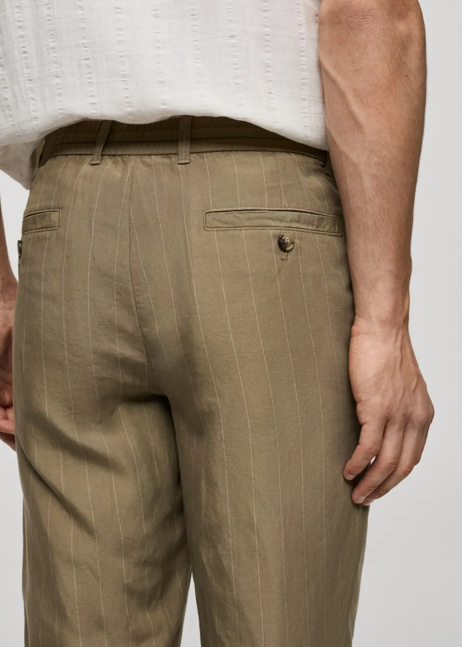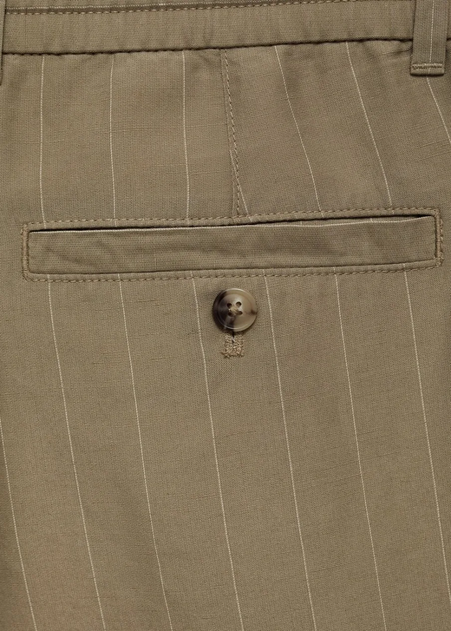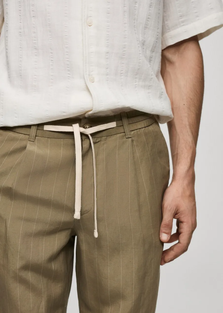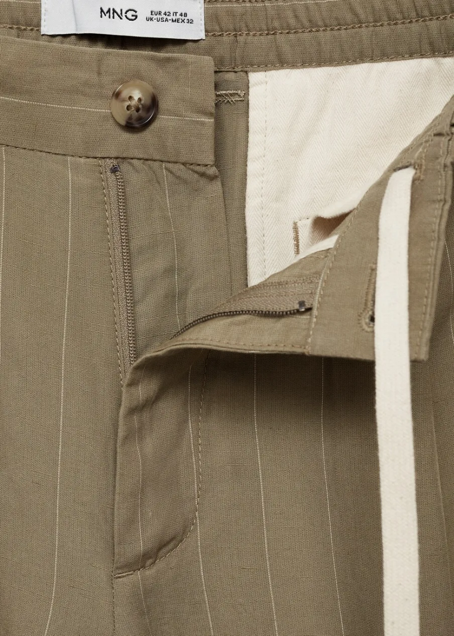 Tkanina mieszana z lnu i lyocellu. Wzór w pasy. Zaszewki z przodu. Szlufki na pasek. Elastyczny pas z regulowanym sznurkiem. Dwie kieszenie z przodu. Dwie wpuszczane kieszenie z guzikiem z tyłu. Model ma 187 cm wzrostu i nosi rozmiar 42. Zapięcie na zamek i guzik z przodu.
