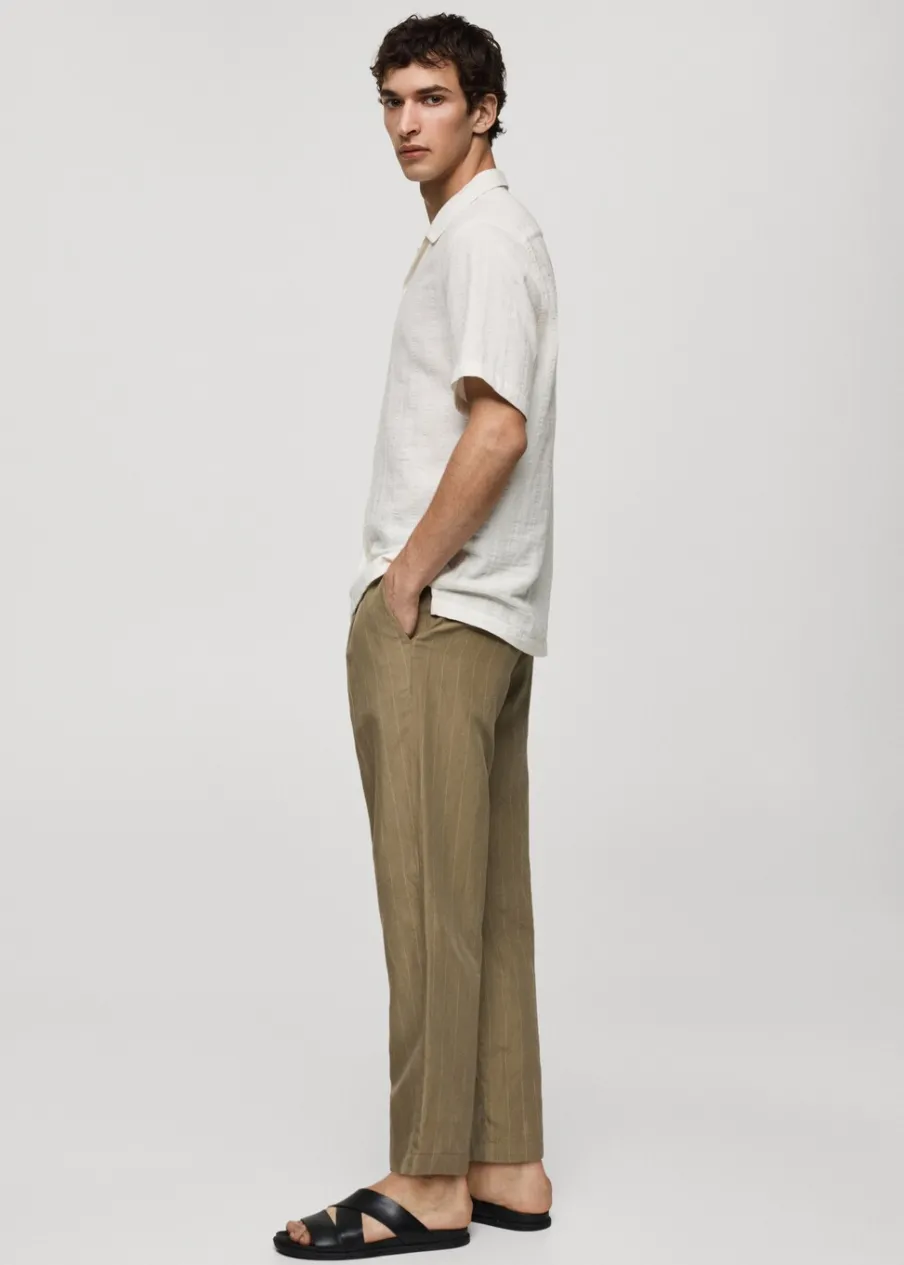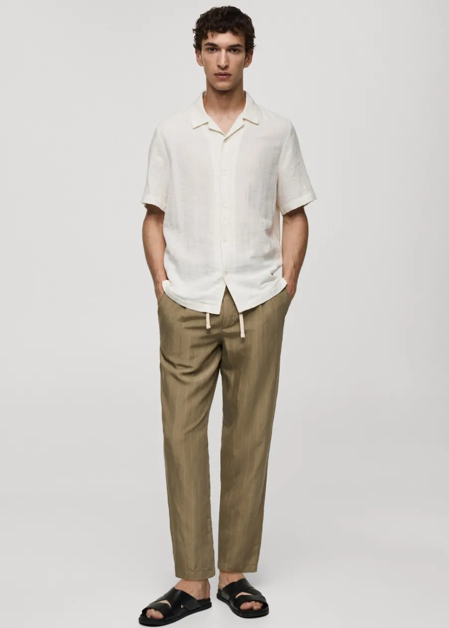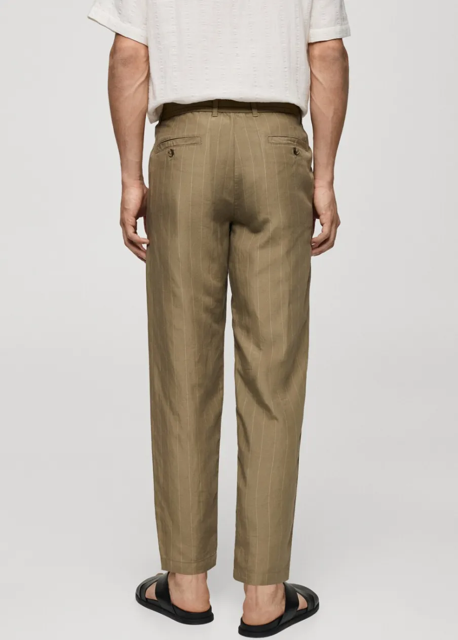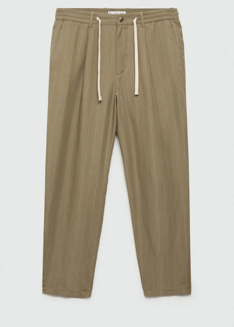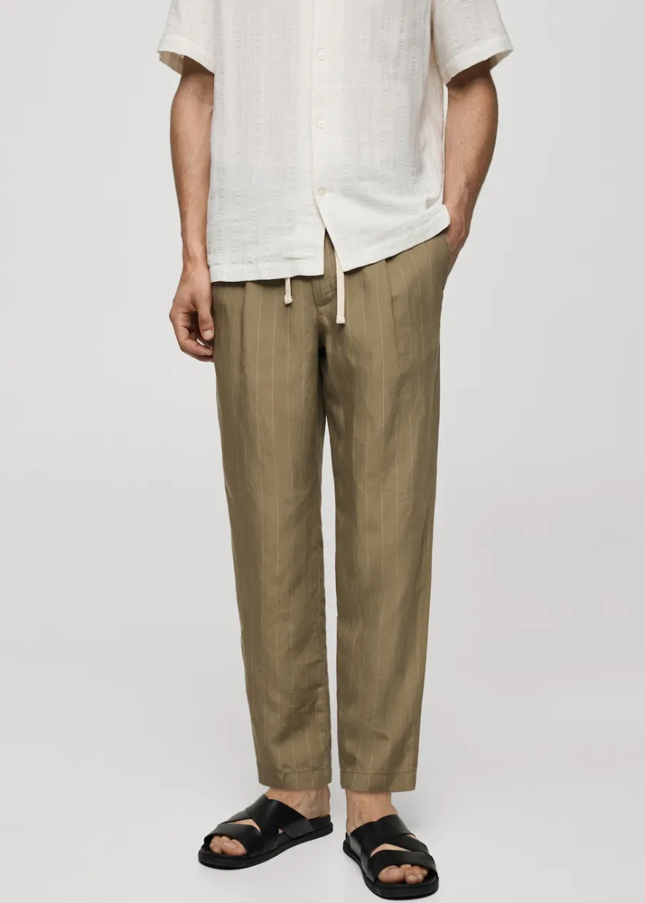 Tkanina mieszana z lnu i lyocellu. Wzór w pasy. Zaszewki z przodu. Szlufki na pasek. Elastyczny pas z regulowanym sznurkiem. Dwie kieszenie z przodu. Dwie wpuszczane kieszenie z guzikiem z tyłu. Model ma 187 cm wzrostu i nosi rozmiar 42. Zapięcie na zamek i guzik z przodu.