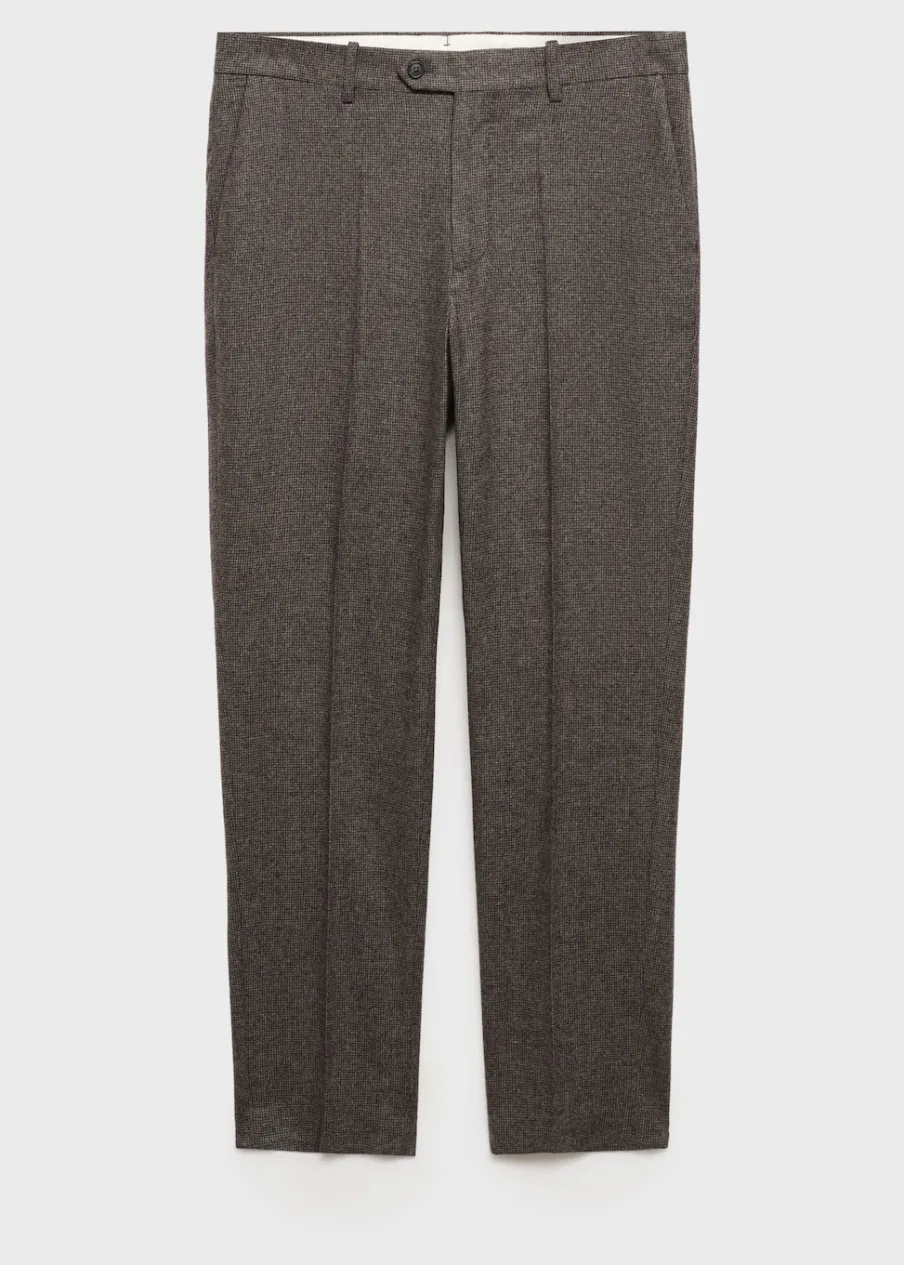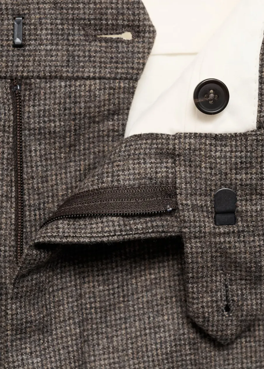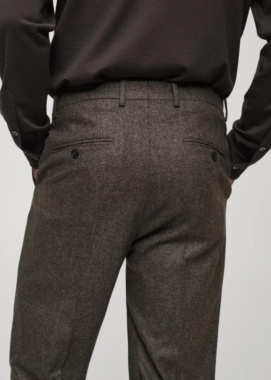 Kolekcja Selection. Tkanina z mieszanki wełny dziewiczej. Slim Fit. Wzór w drobną kurzą stopkę. Zaprasowany kant z przodu i z tyłu. Zapięcie z przodu na guzik, haftkę i zamek. Szlufki na pasek. Dwie kieszenie z przodu. Dwie kieszenie z obszyciem i guzikiem z tyłu. Model ma 190 cm wzrostu i nosi rozmiar 42.