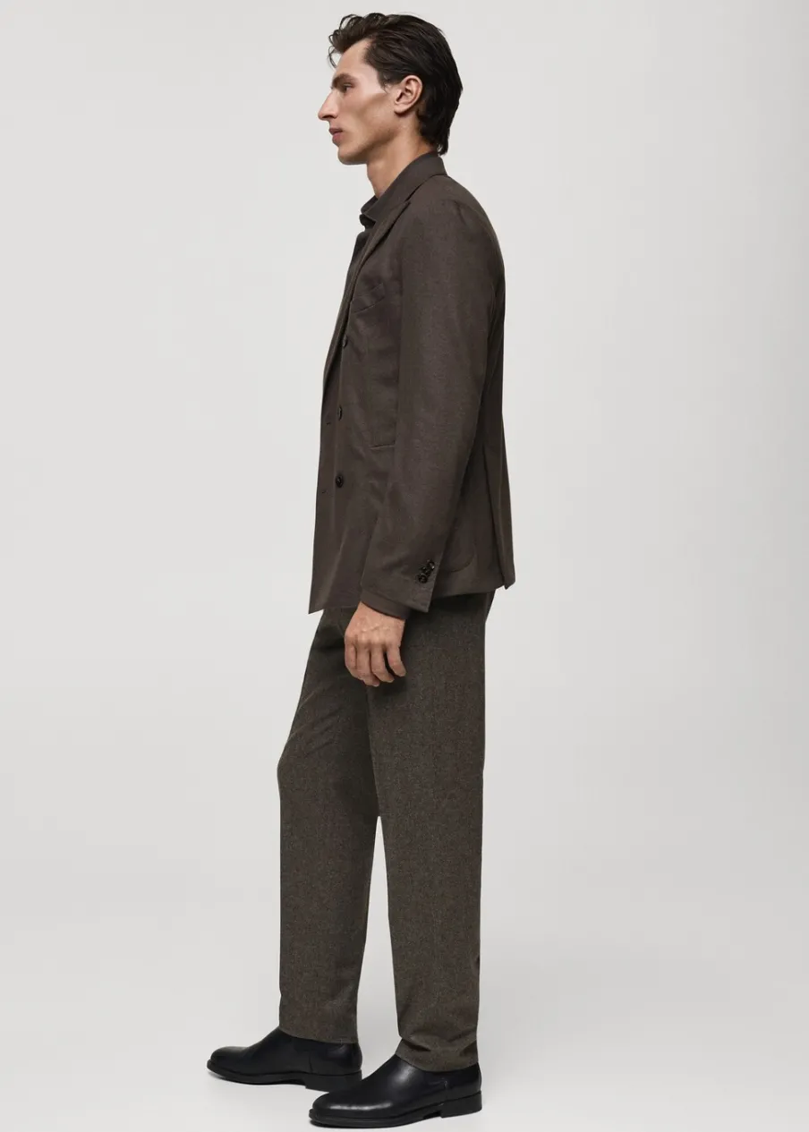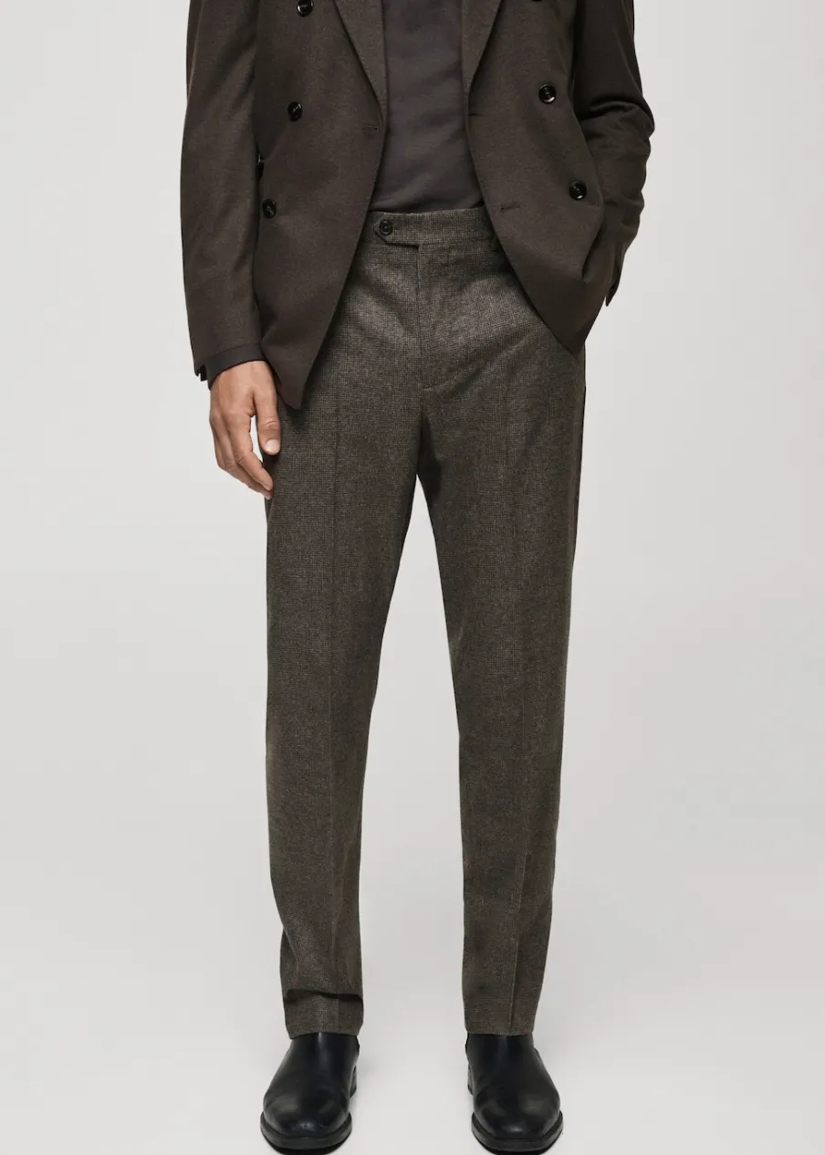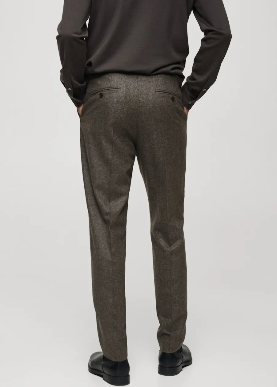 Kolekcja Selection. Tkanina z mieszanki wełny dziewiczej. Slim Fit. Wzór w drobną kurzą stopkę. Zaprasowany kant z przodu i z tyłu. Zapięcie z przodu na guzik, haftkę i zamek. Szlufki na pasek. Dwie kieszenie z przodu. Dwie kieszenie z obszyciem i guzikiem z tyłu. Model ma 190 cm wzrostu i nosi rozmiar 42.