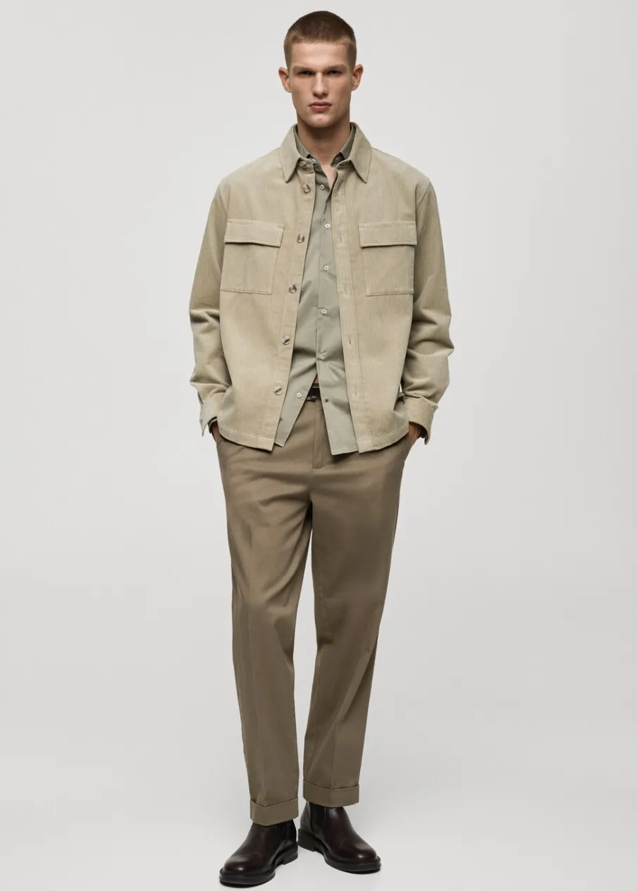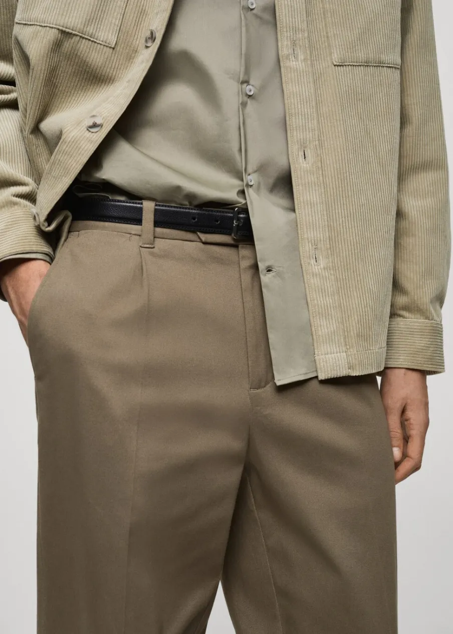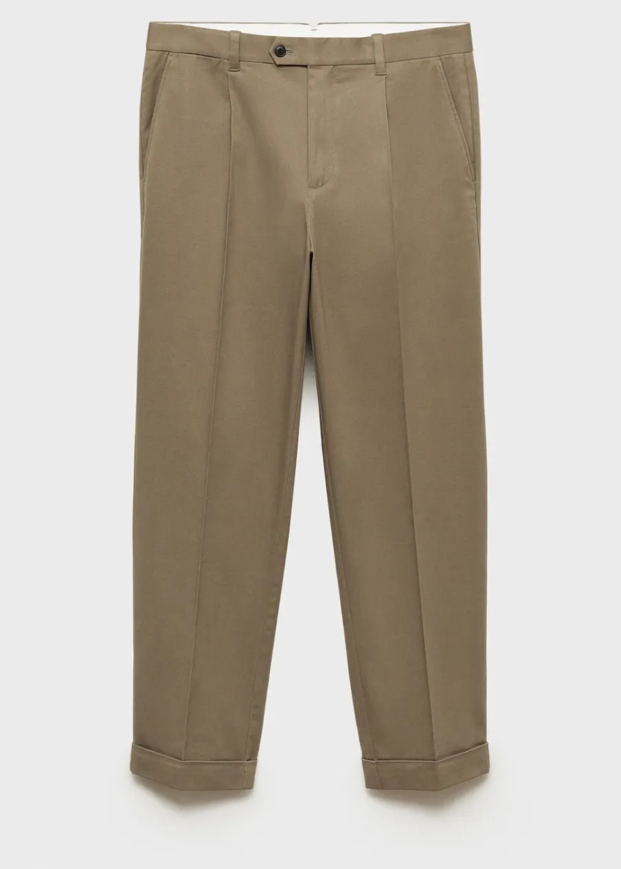 Krój regular. Tkanina bawełniana. Zaprasowany kant z przodu i z tyłu. Szlufki na pasek. Dwurzędowe zapięcie. Wywinięte nogawki. Model ma 185 cm wzrostu i nosi rozmiar 42. Dwie wpuszczane kieszenie z guzikiem z tyłu.