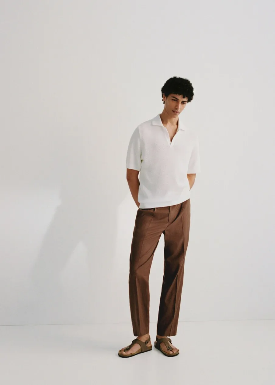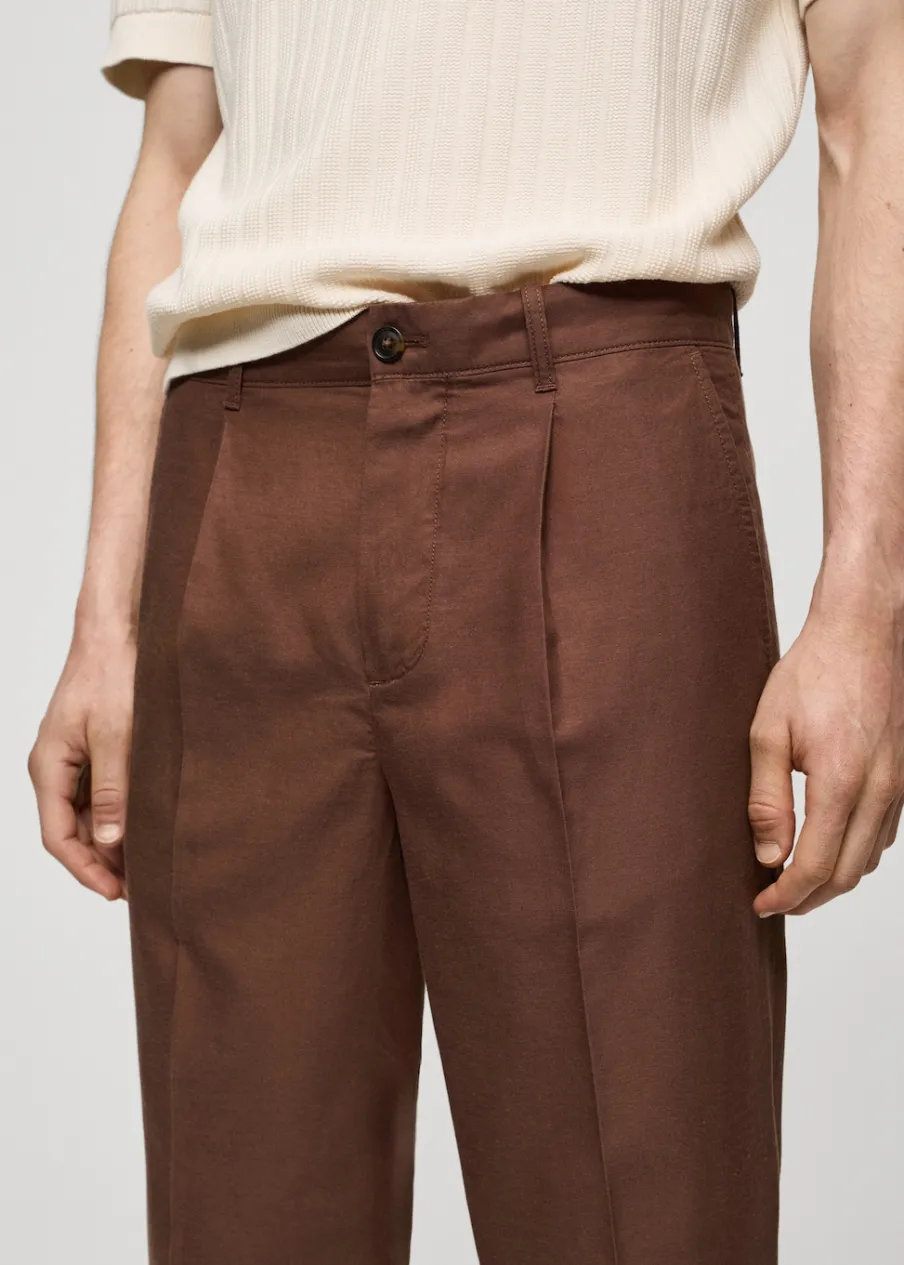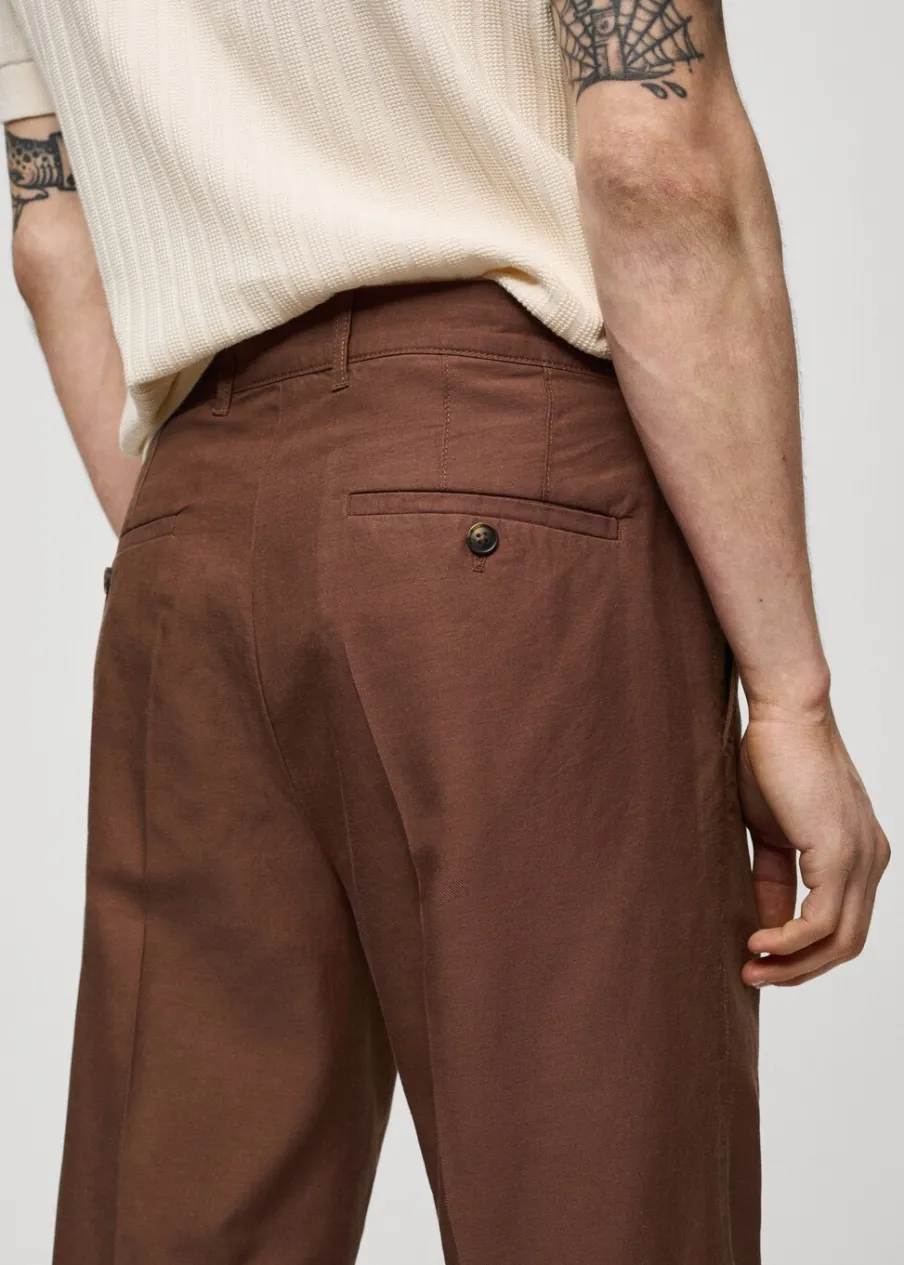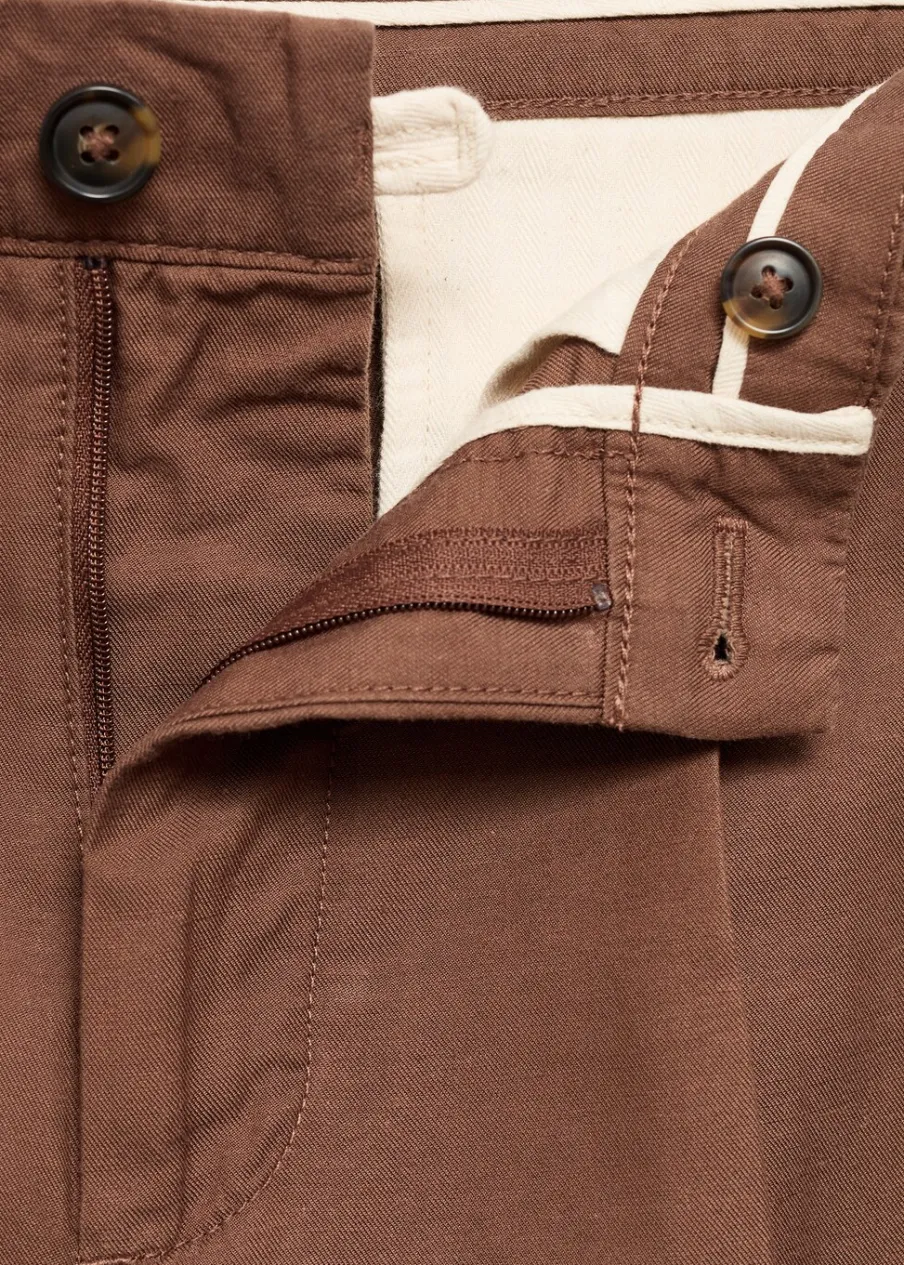 Zaszewki z przodu. Szlufki na pasek. Dwurzędowe zapięcie z przodu na guziki i zamek. Dwie kieszenie z przodu. Dwie wpuszczane kieszenie z guzikiem z tyłu. Model ma 187 cm wzrostu i nosi rozmiar 42. Tkanina mieszana z lyocellu, bawełny i lnu. Zaprasowany kant z przodu i z tyłu.