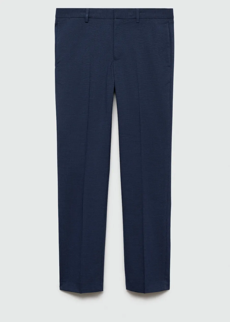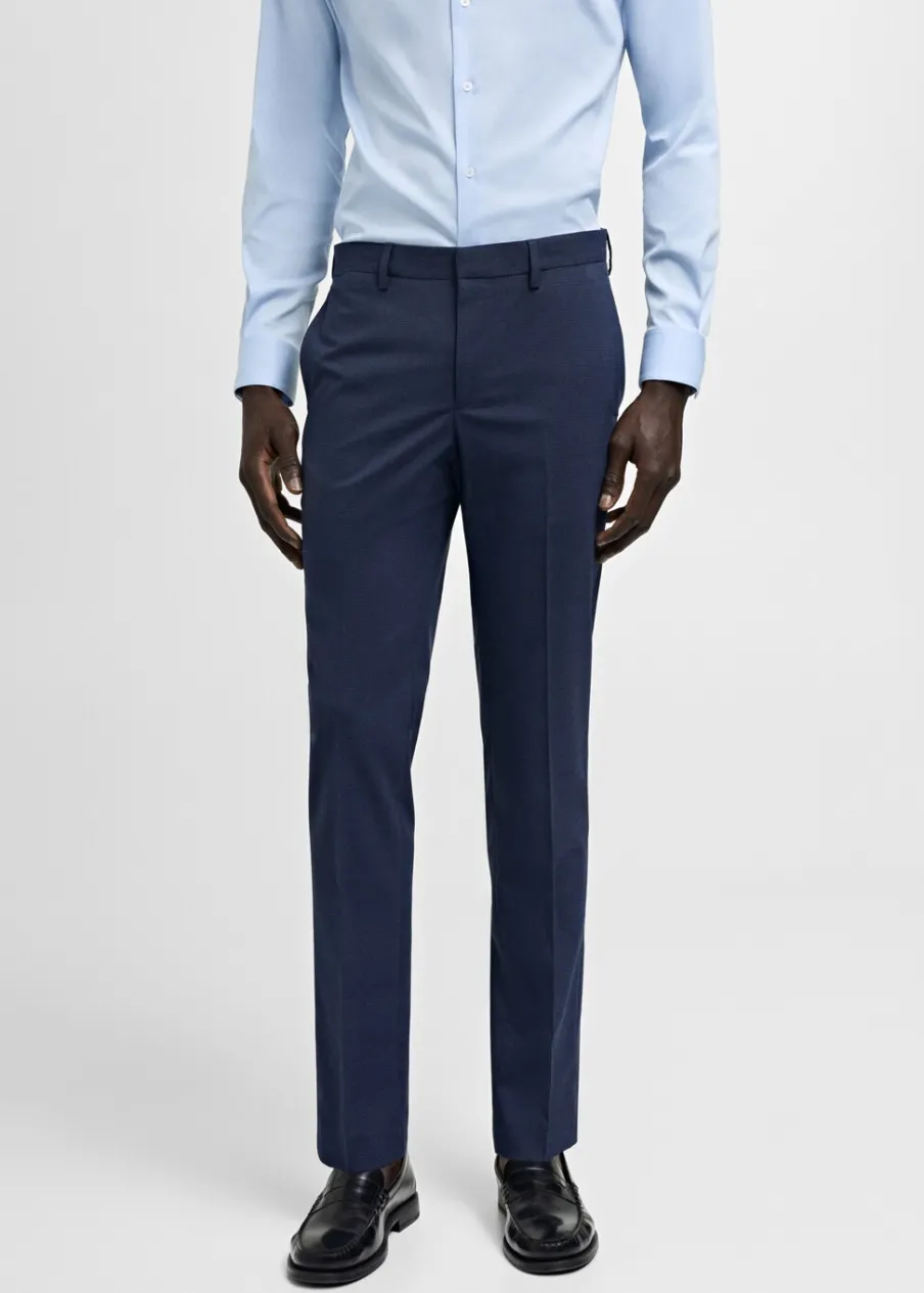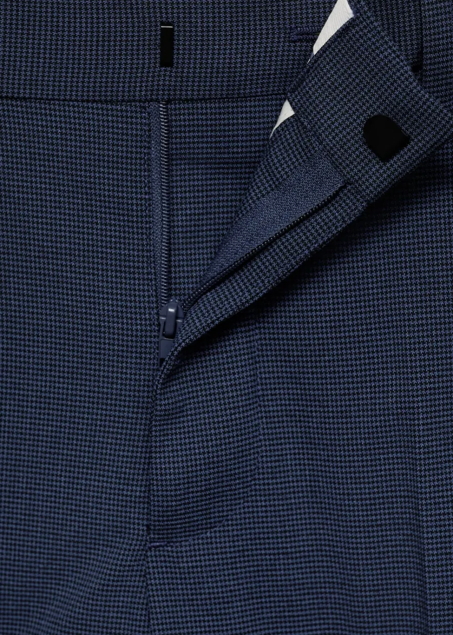 Super slim-fit. Comfort stretch: elastyczna tkanina dla większego komfortu. Wykonano z poliestru z recyklingu: wytrzymałego, oddychającego i łatwego w pielęgnacji materiału, dzięki czemu ubranie jest wygodne w użytkowaniu. Wzór w drobną kurzą stopkę. Średni stan. Kryte zapięcie na guzik, haftkę i suwak. Szlufki na pasek. Dwie kieszenie boczne. Ukryta kieszonka na monety na wysokości biodra. Dwie wpuszczane kieszenie z guzikiem z tyłu. Model ma 185 cm wzrostu i nosi rozmiar 42. Zaprasowany kant z przodu i z tyłu. Komfort: to ubranie zapewnia pełną swobodę ruchu i odzyskuje swój pierwotny kształt.