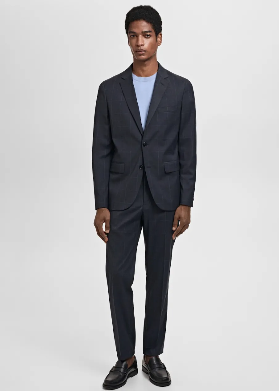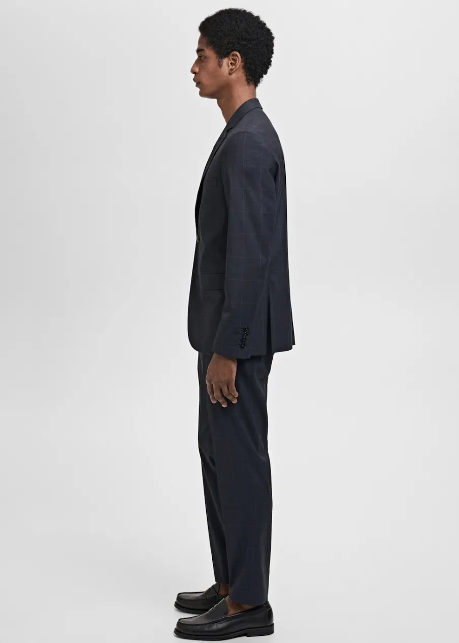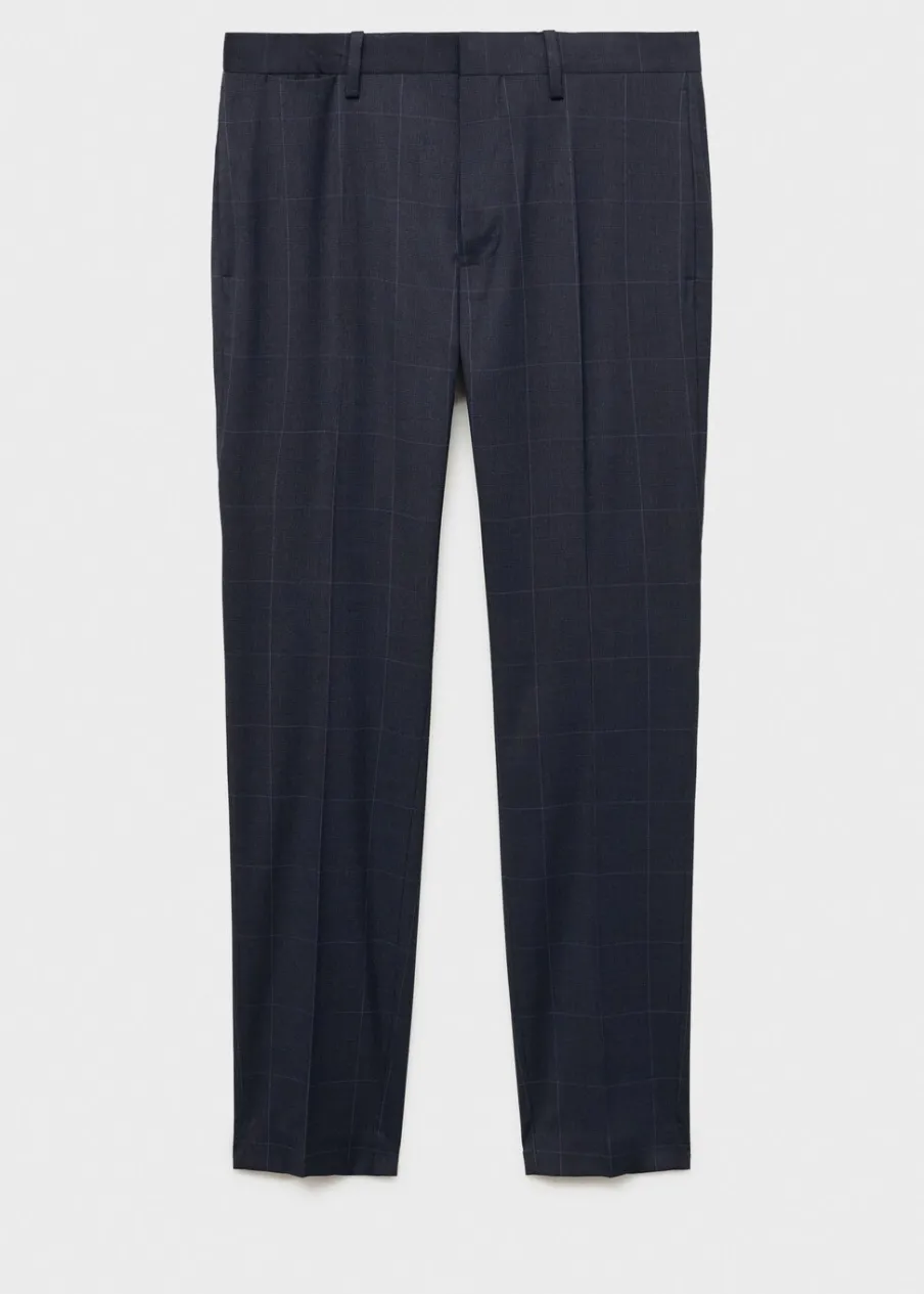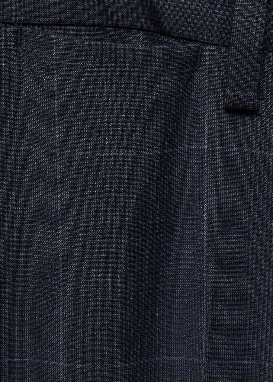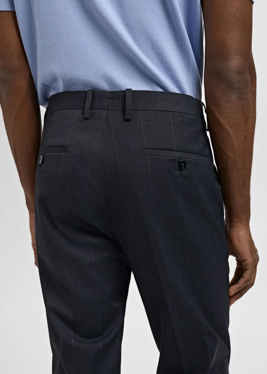 Super slim-fit. Wzór w kratę Księcia Walii. Zapięcie na zamek, haftkę i dwa guziki z przodu. Szlufki na pasek. Kieszonka biletowa. Dwie kieszenie z przodu. Dwie kieszenie z obszyciem i guzikiem z tyłu. Zaprasowany kant z przodu i z tyłu. Model ma 190 cm wzrostu i nosi rozmiar 42.