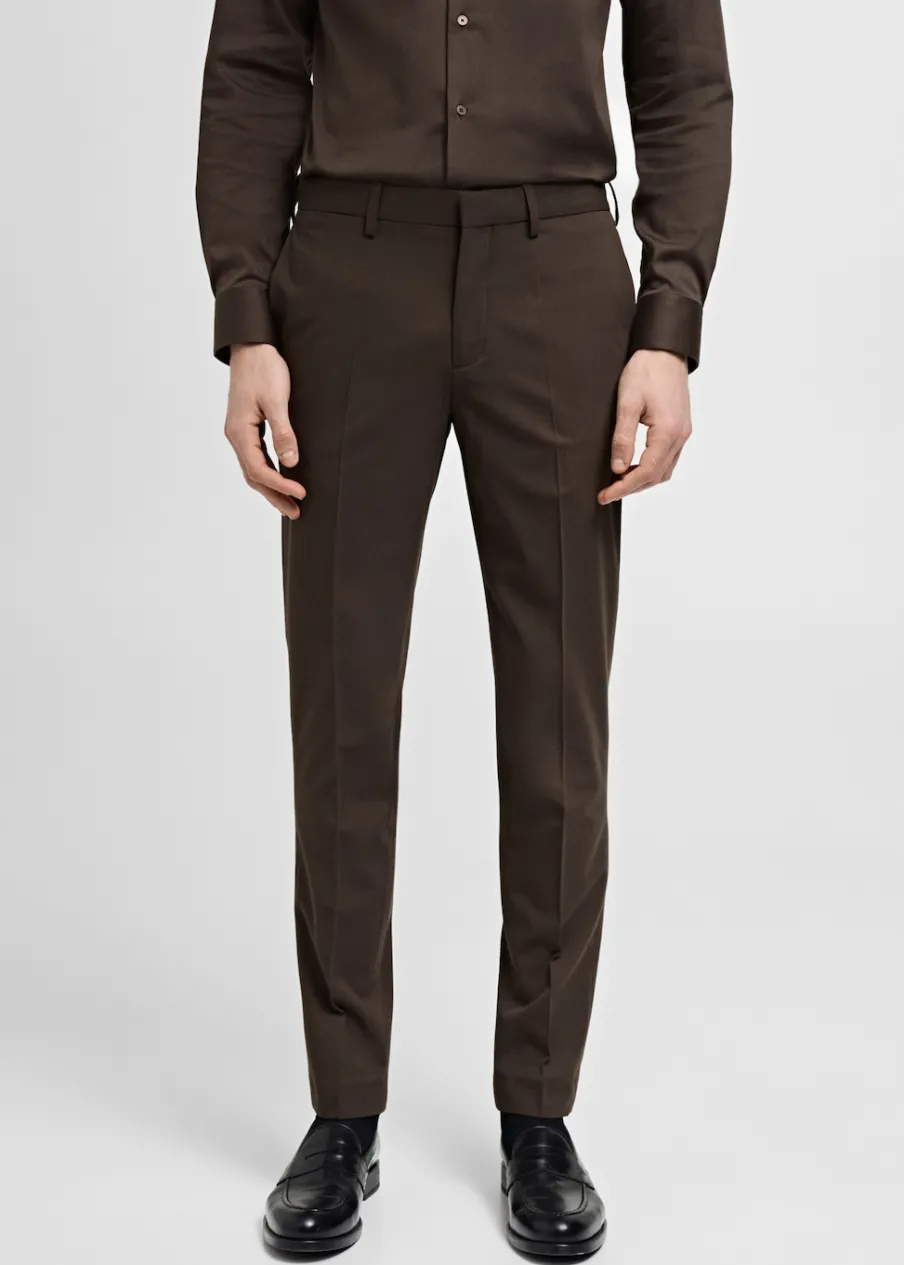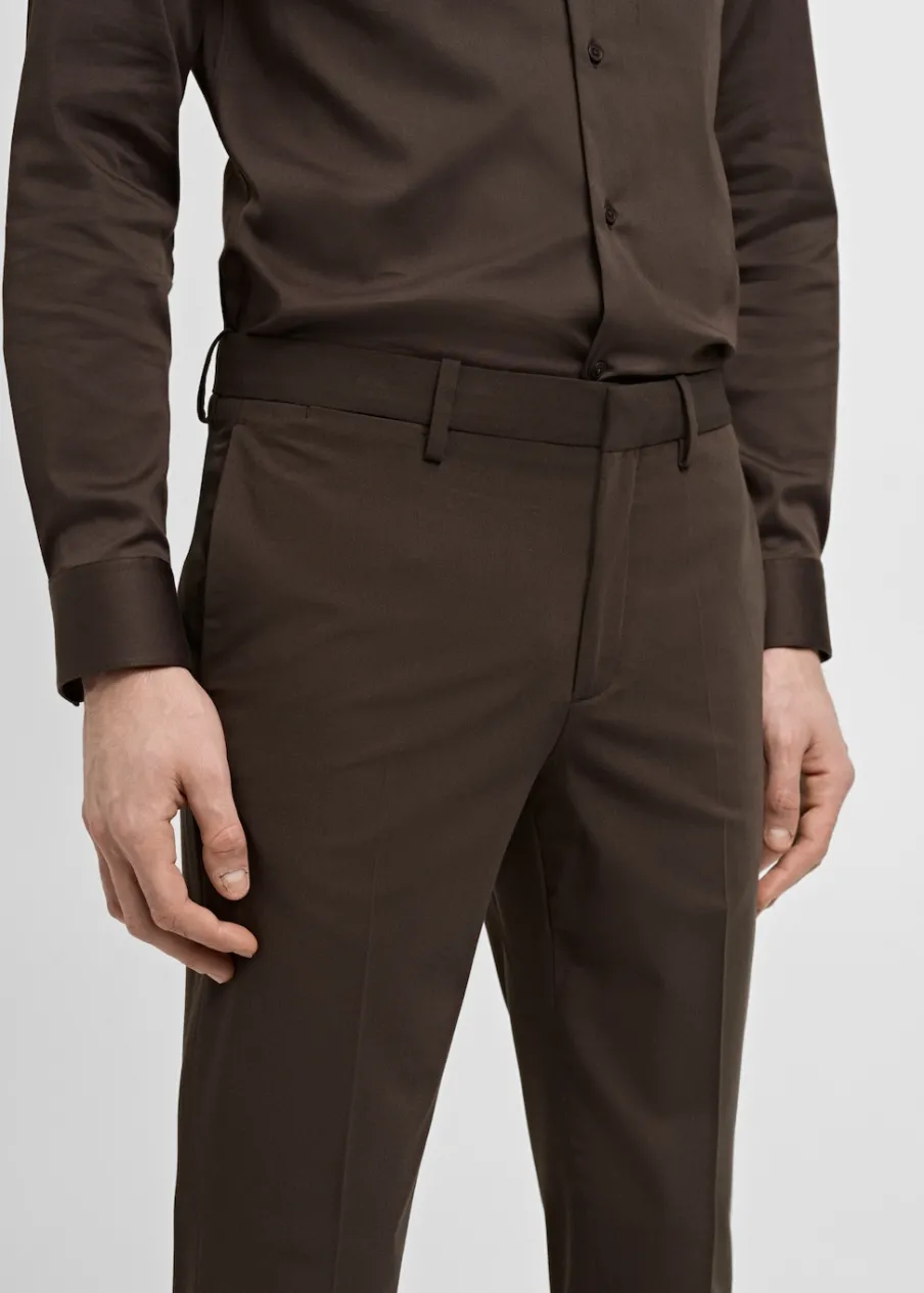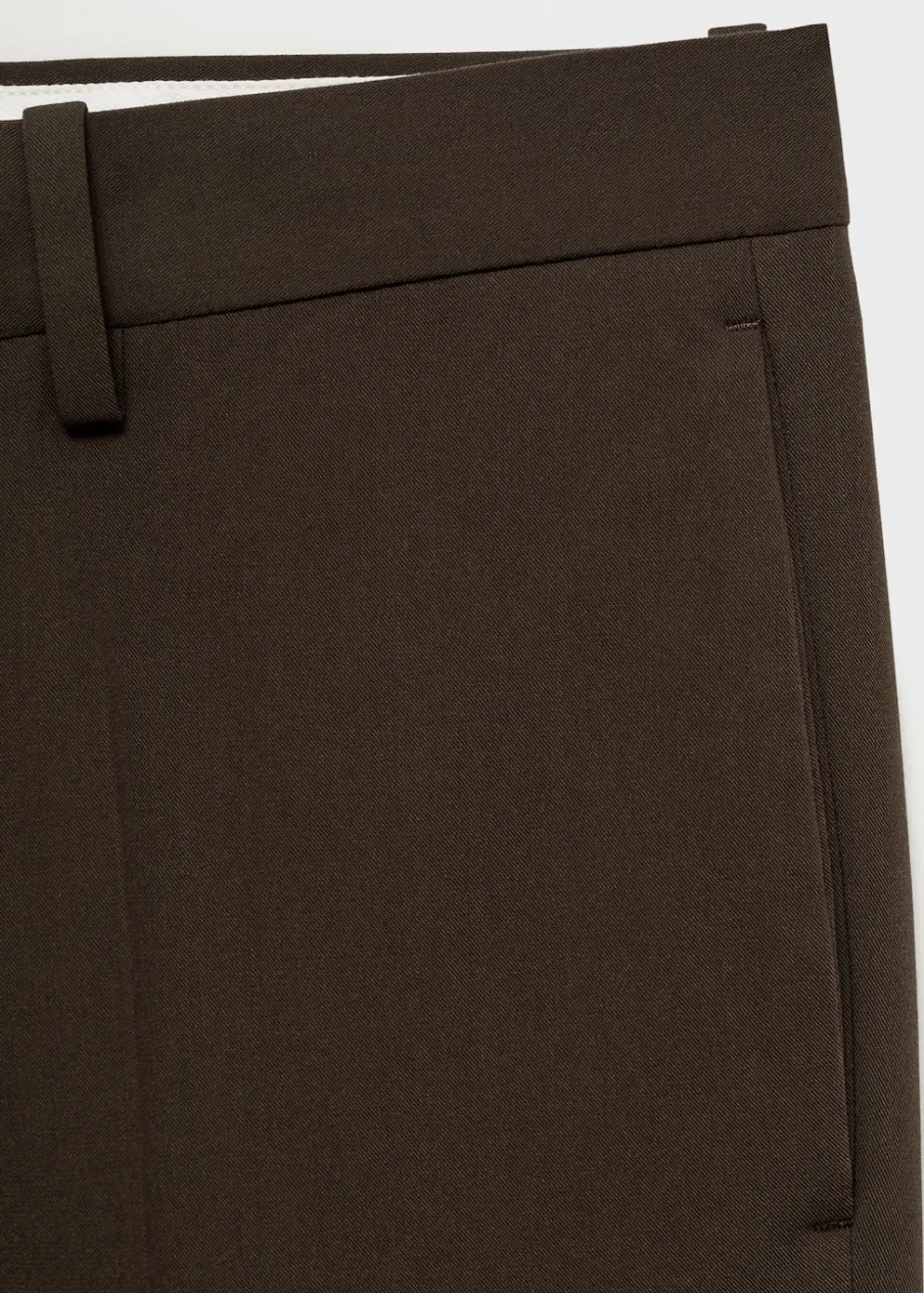 Slim-fit. Zaprasowany kant. Kryte zapięcie na guzik, haftkę i suwak. Kieszonka biletowa. Szlufki na pasek. Dwie kieszenie boczne. Dwie wpuszczane kieszenie z tyłu. Model ma 185 cm wzrostu i nosi rozmiar 42.