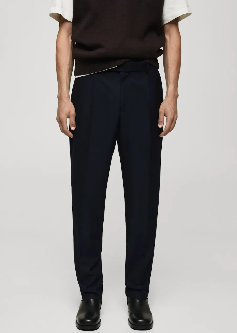 Slim-fit. Detal z zakładkami. Zaprasowany kant z przodu i z tyłu. Zapięcie z przodu na guzik, haftkę i zamek. Szlufki na pasek. Tylna kieszeń wpuszczana zapinana na guzik. Model ma 185 cm wzrostu i nosi rozmiar 42. Tkanina gładka. Materiały z recyklingu. Dwie wpuszczane kieszenie boczne.