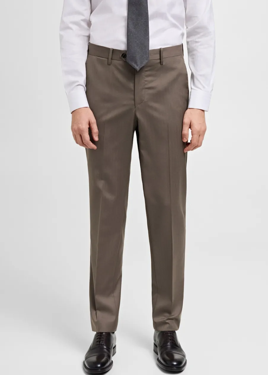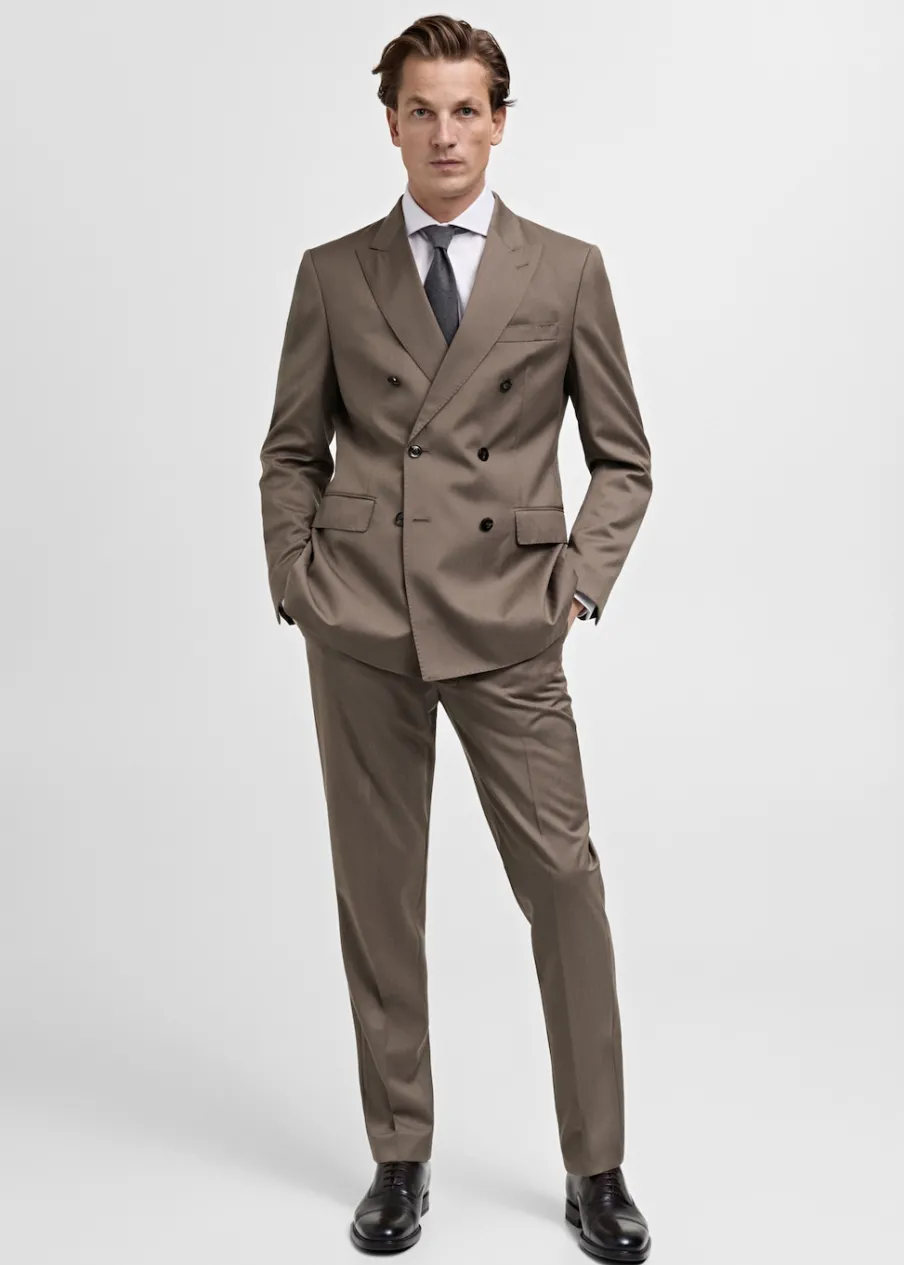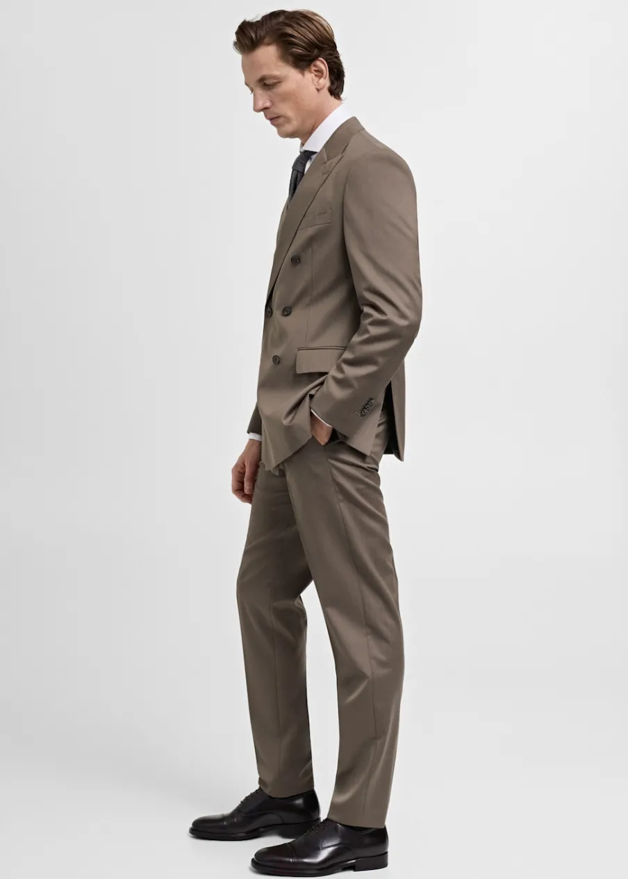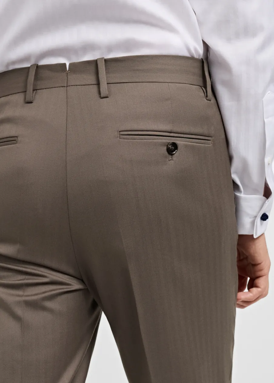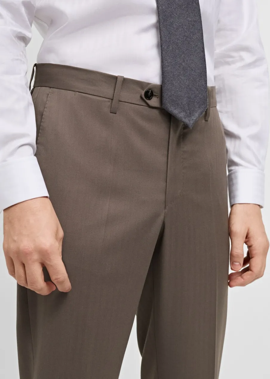 Slim-fit. Tkanina z 100% wełny dziewiczej. Struktura w jodełkę. Dwurzędowe zapięcie z przodu na guziki i zamek. Szlufki na pasek. Zaprasowany kant z przodu i z tyłu. Kieszonka biletowa. Guziki na szelki po wewnętrznej stronie pasa. Dwie kieszenie boczne. Dwie wpuszczane kieszenie z guzikiem z tyłu. Model ma 190 cm wzrostu i nosi rozmiar 42.
