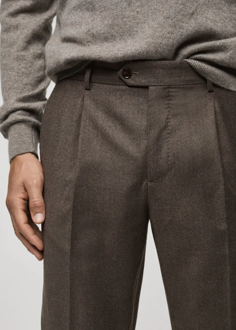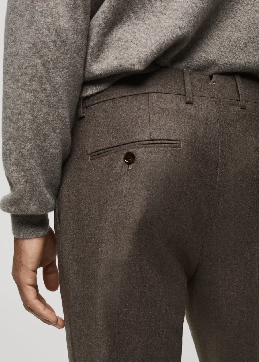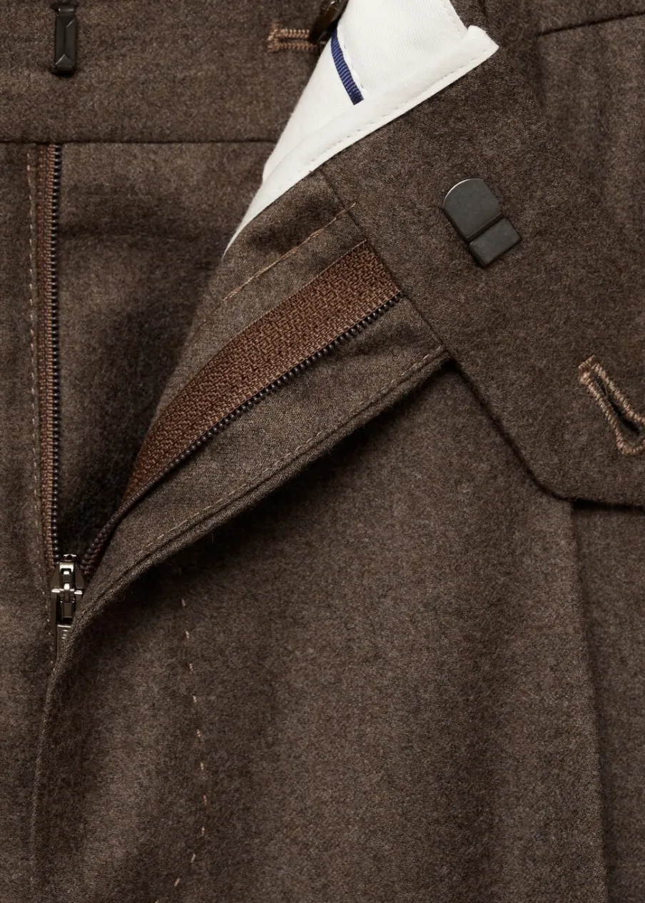 Kolekcja Selection. Tkanina z 100% włoskiej wełny dziewiczej marki LANEROSSI BY MARZOTTO. Wyprodukowano w Portugalii. Zakładki z przodu. Zaprasowany kant z przodu i z tyłu. Zapięcie z przodu na guzik, haftkę i zamek. Guziki na szelki po wewnętrznej stronie pasa. Szlufki na pasek. Dwie wpuszczane kieszenie boczne. Dwie kieszenie z obszyciem i guzikiem z tyłu. Model ma 185 cm wzrostu i nosi rozmiar 42.