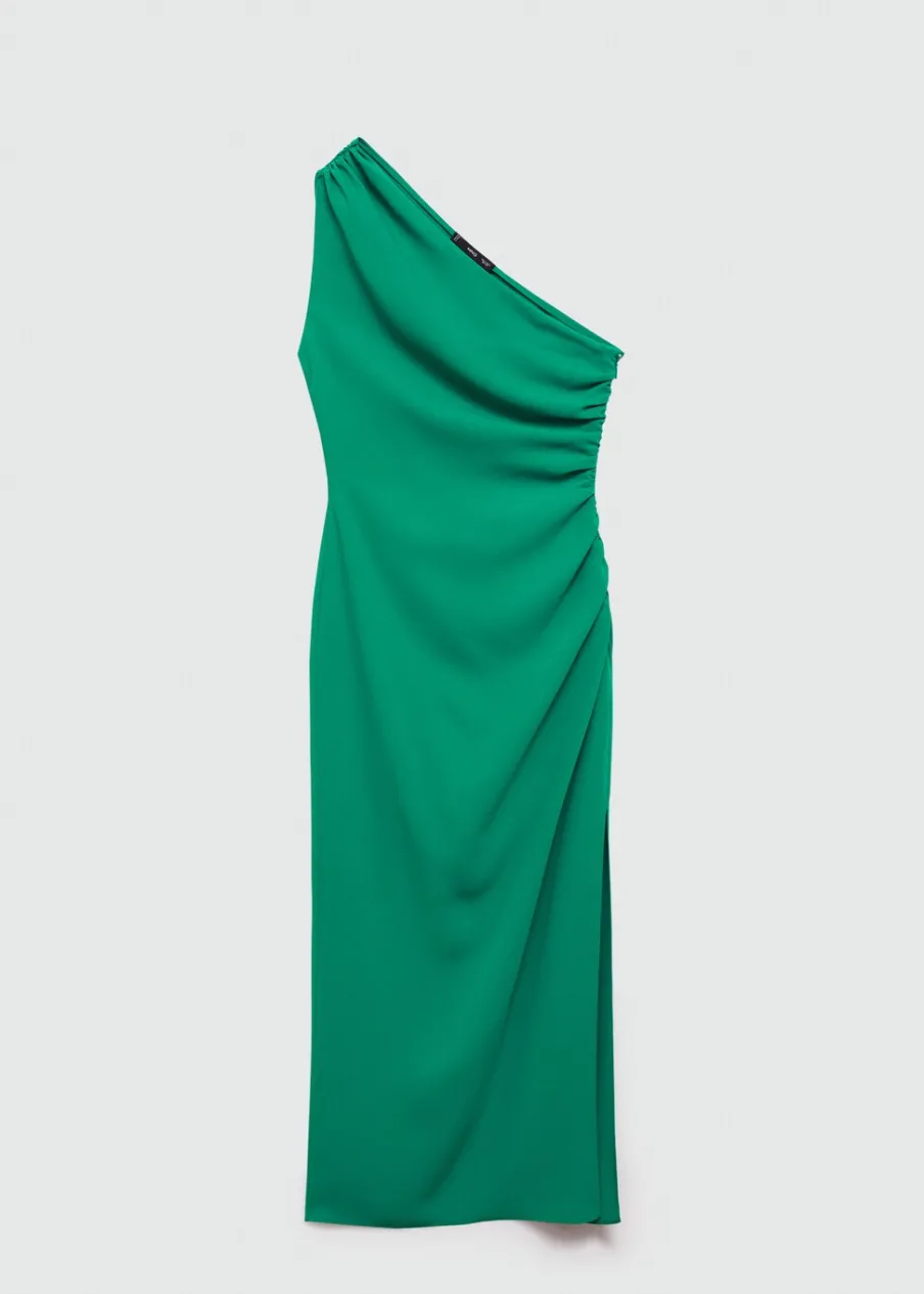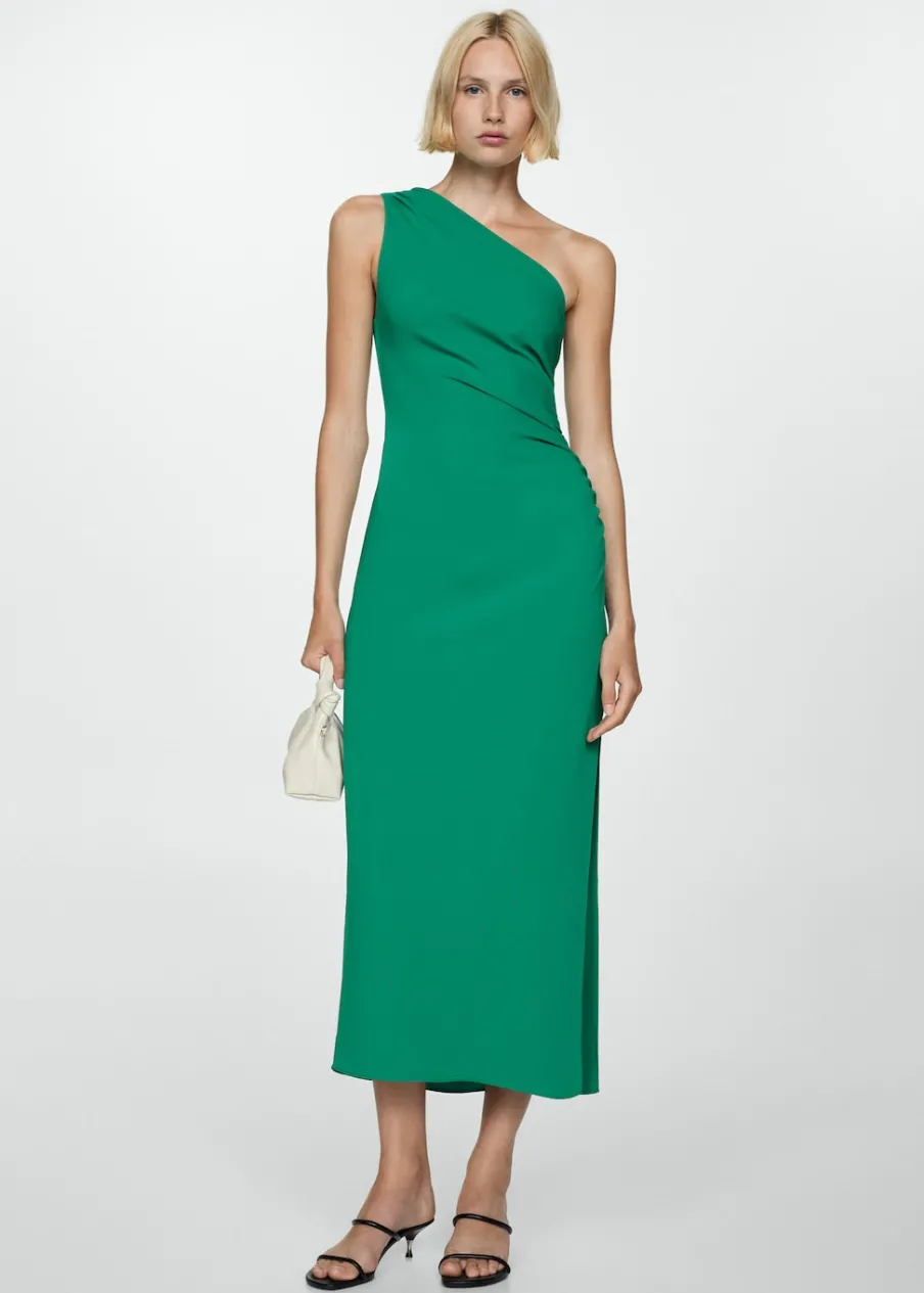 Lejąca tkanina. Krój do kolan. Model z drapowaniem. Asymetryczny dekolt. Kryte zapięcie na zamek z boku. Rozcięcie boczne. Kolekcja wizytowa. Model wcięty.