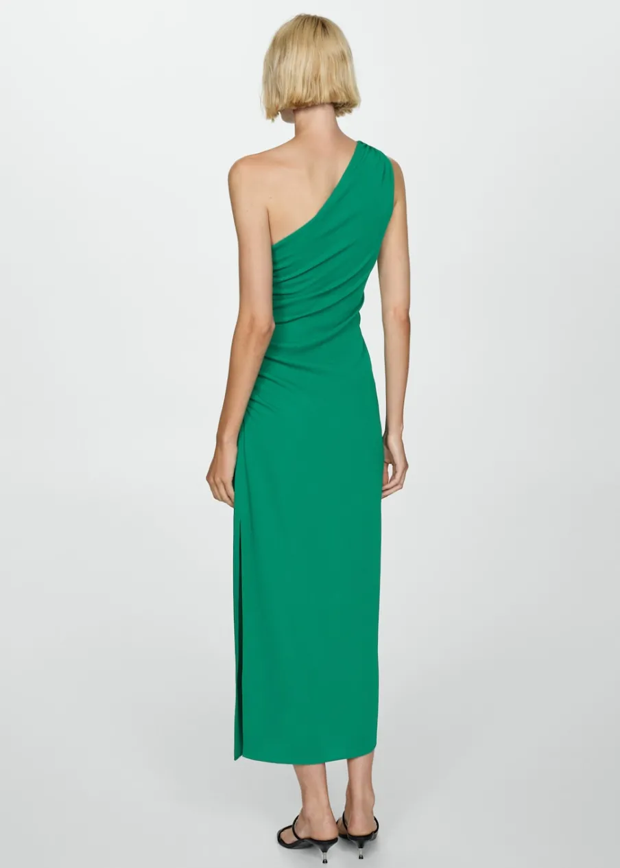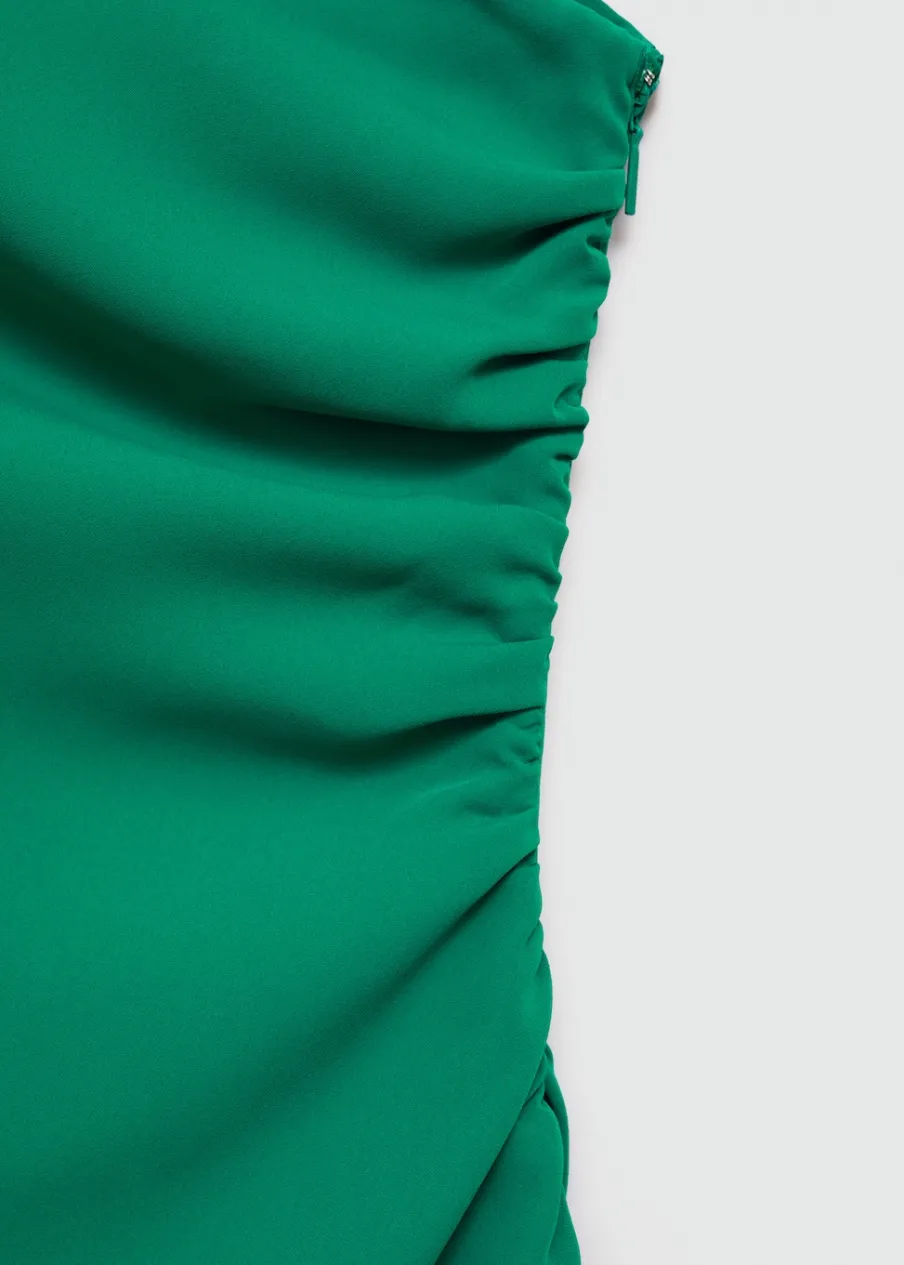 OpisLejąca tkanina. Krój do kolan. Model z drapowaniem. Asymetryczny dekolt. Kryte zapięcie na zamek z boku. Rozcięc…