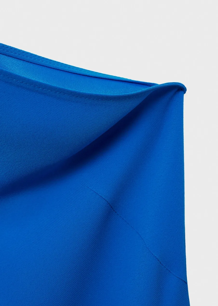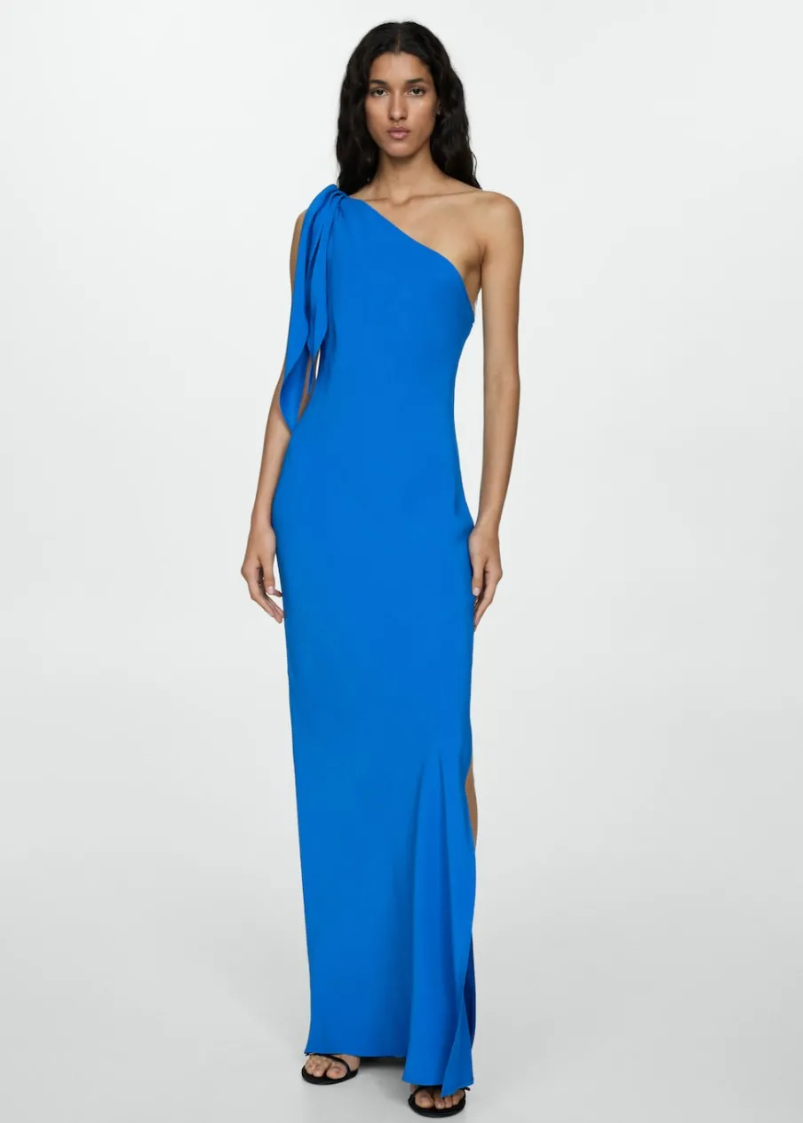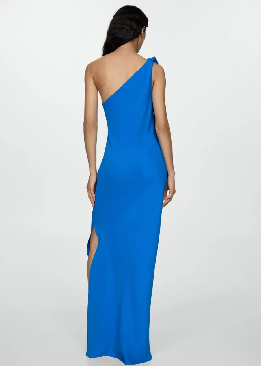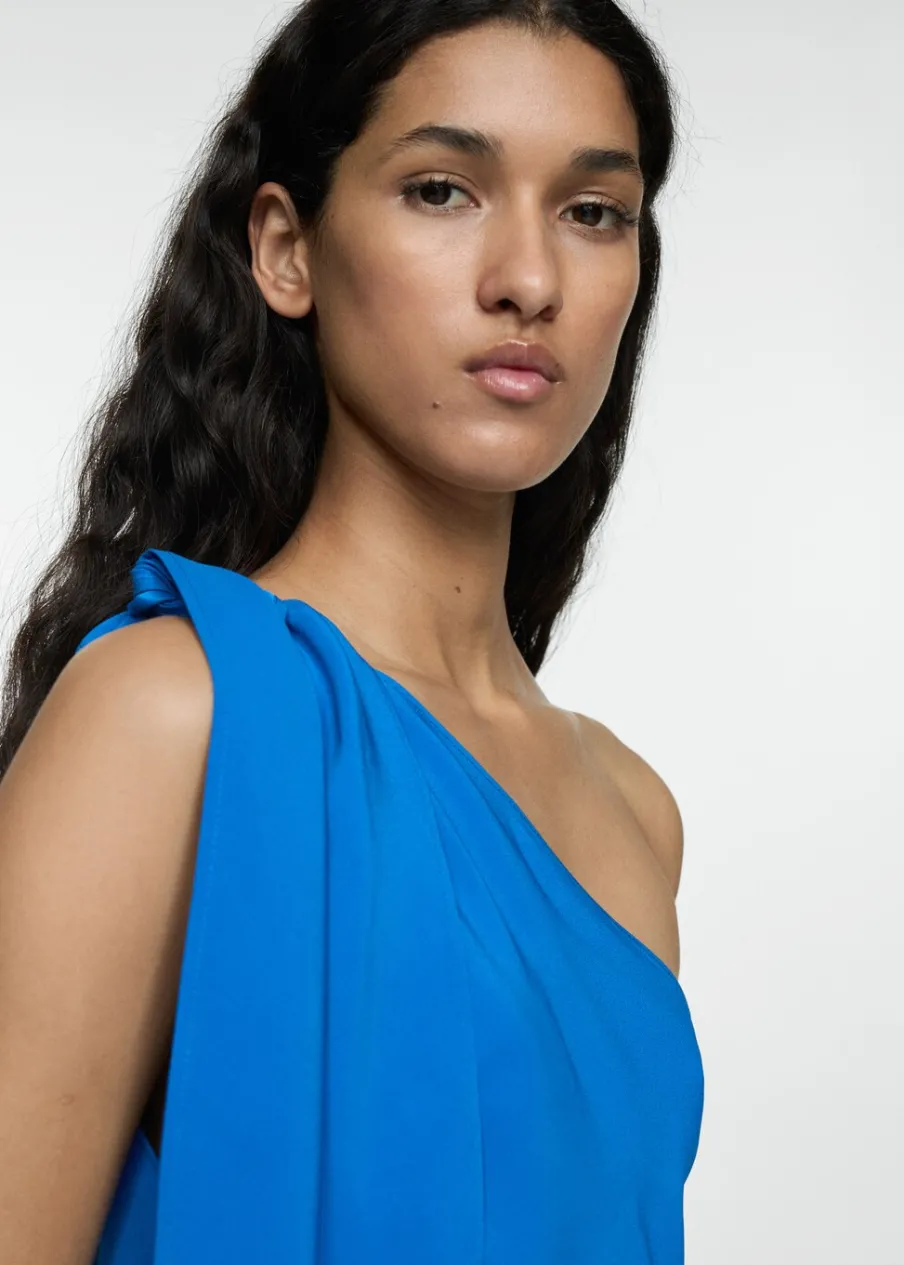 Lejąca tkanina. Model długi. Asymetryczny dekolt. Bez rękawów. Szerokie ramiączko. Bez zapięcia. Ramiączka z ozdobnym węzłem. Bez podszewki. Kolekcja wizytowa. Wyłącznie online. Model wcięty.
