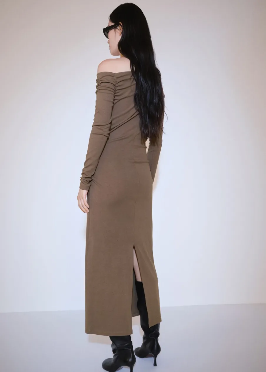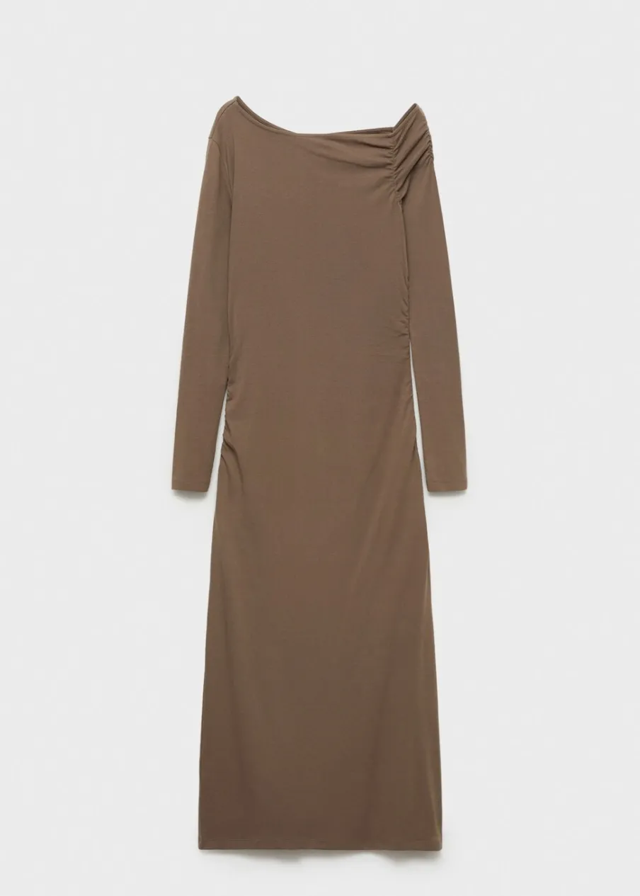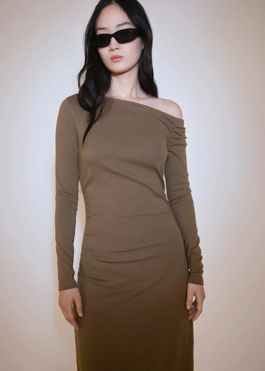 Tkanina mieszanka bawełny. Asymetryczny krój. Fason z odkrytymi ramionami. Model wcięty. Model długi. Asymetryczny dekolt. Długi rękaw. Bez zapięcia. Detal z rozcięciem z tyłu. Marszczona tekstura. Modelka ma 177 cm wzrostu i nosi rozmiar S/36. Modelka ma 178 cm wzrostu i nosi rozmiar S/36.