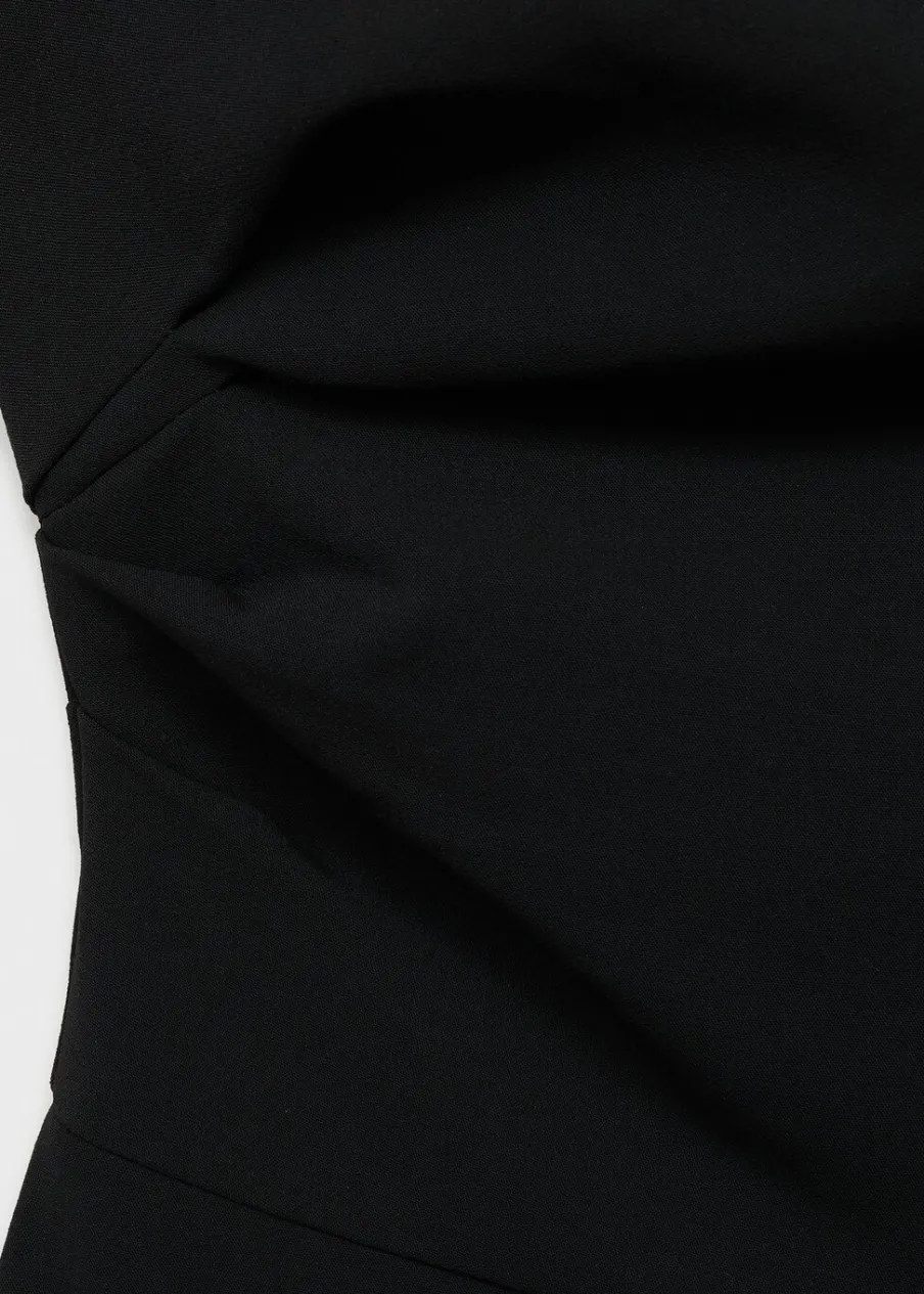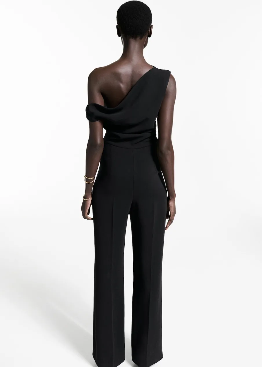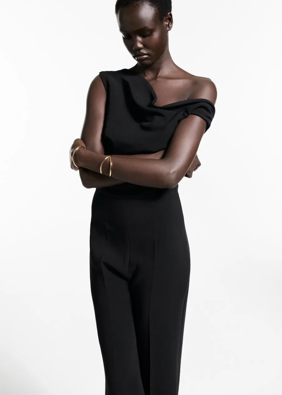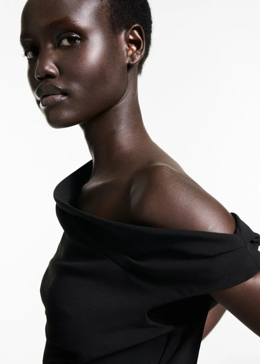 Asymetryczny krój. Fason z odkrytymi ramionami. Model prosty. Model długi. Asymetryczny dekolt. Szerokie ramiączka. Zapięcie z przodu na suwak. Modelka ma 178 cm wzrostu i nosi rozmiar S/36.