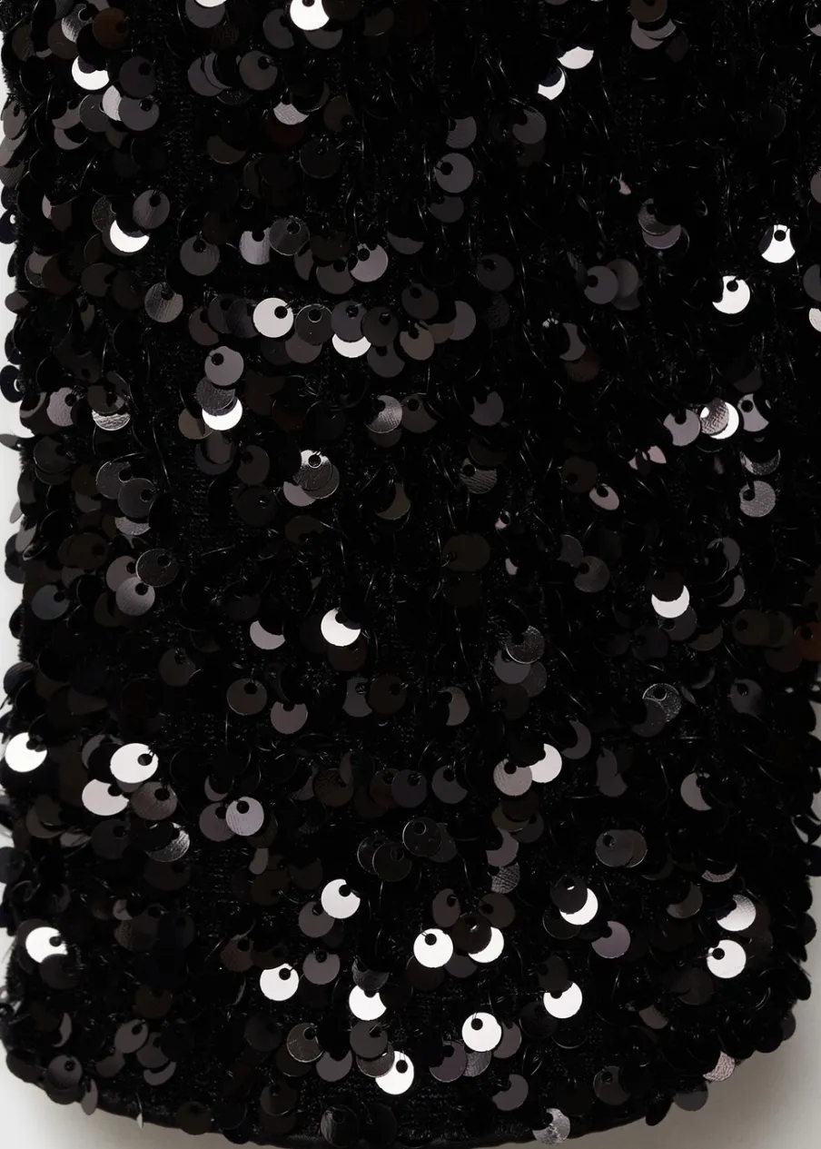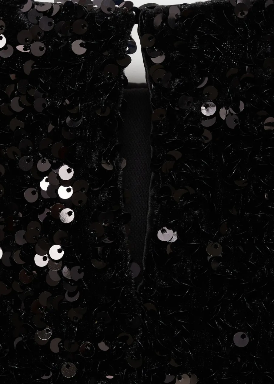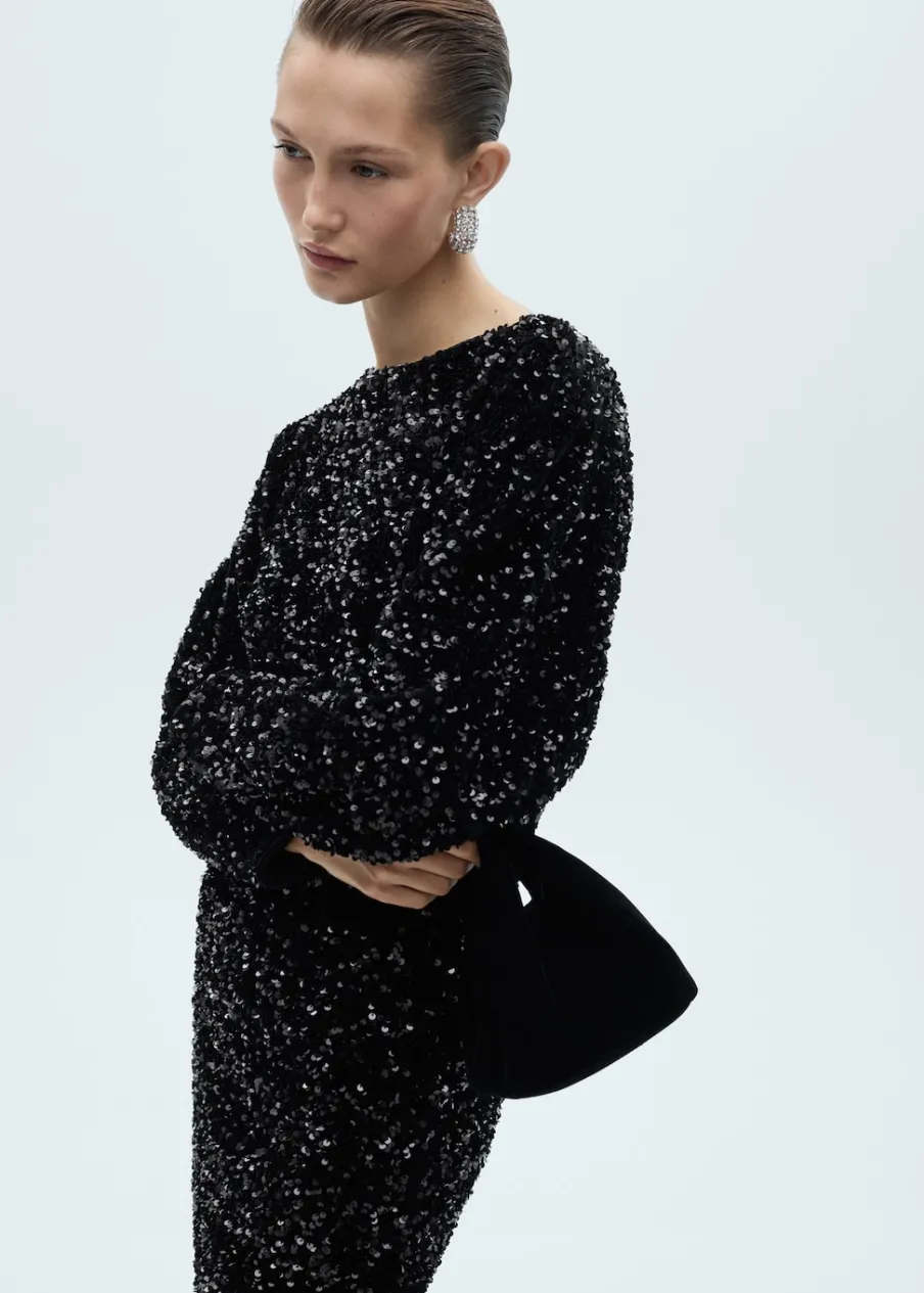 OpisTkanina z cekinami. Model wcięty. Krótki krój. Okrągły dekolt. Długi bufiasty rękaw. Rozcięcie na plecach z …
