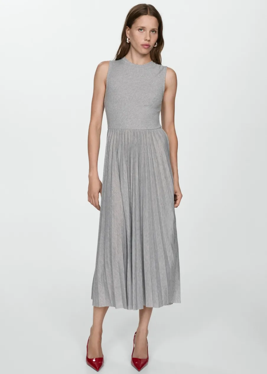 Lejąca tkanina. Model długi. Plisowanie. Okrągły dekolt. Bez rękawów.