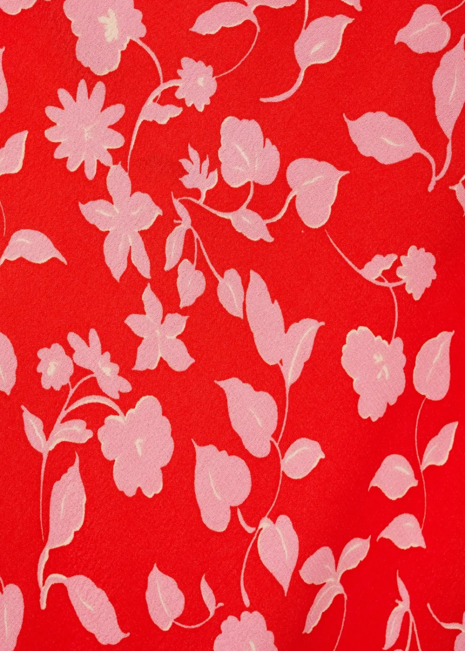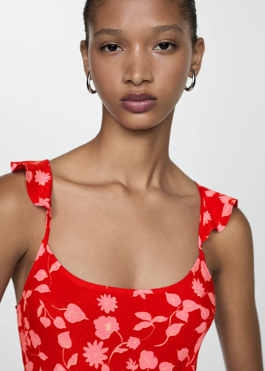 OpisLejąca tkanina. Model długi. Model prosty. Kwiatowy wzór. Okrągły dekolt. Bez rękawów. Cienkie paski skrzyżo…
