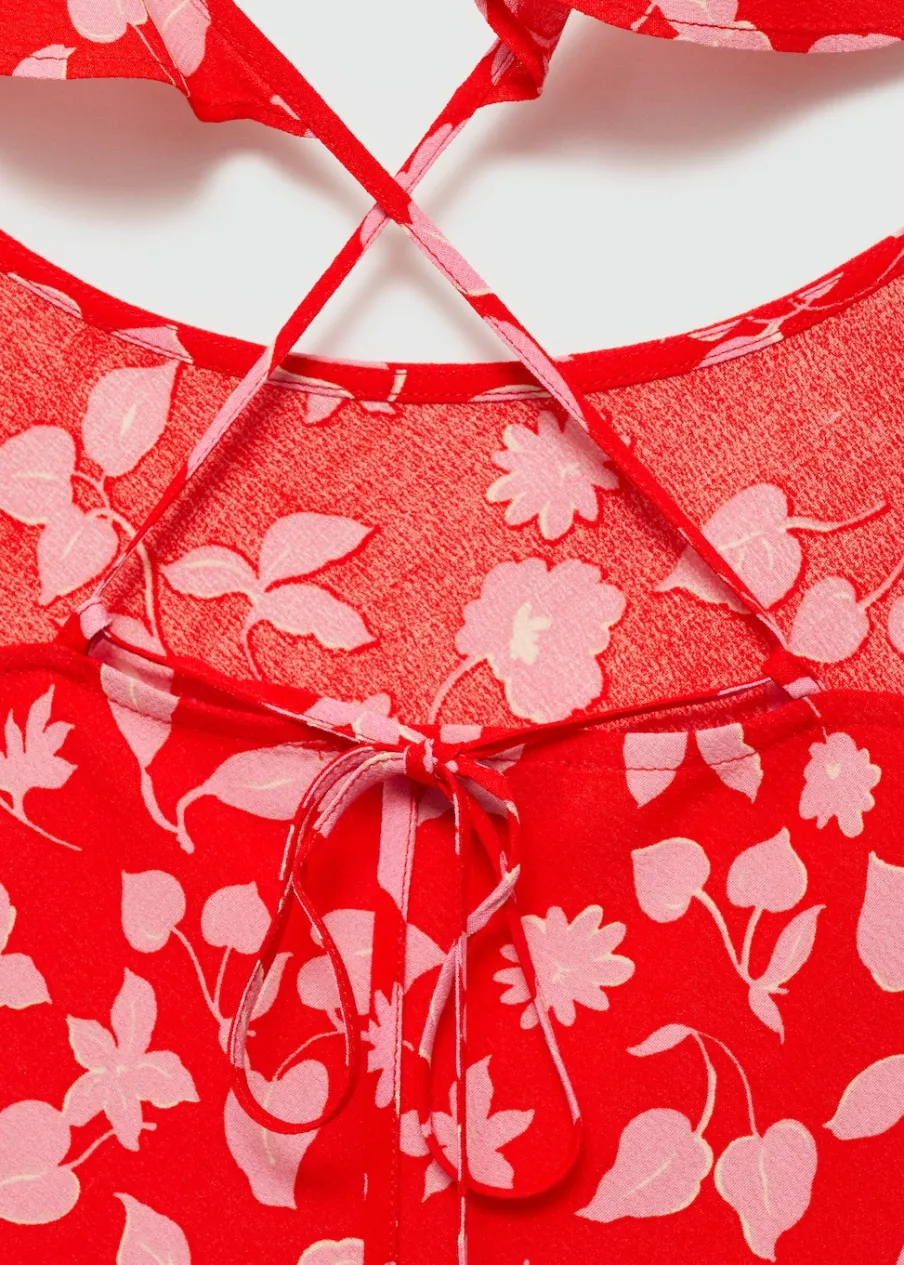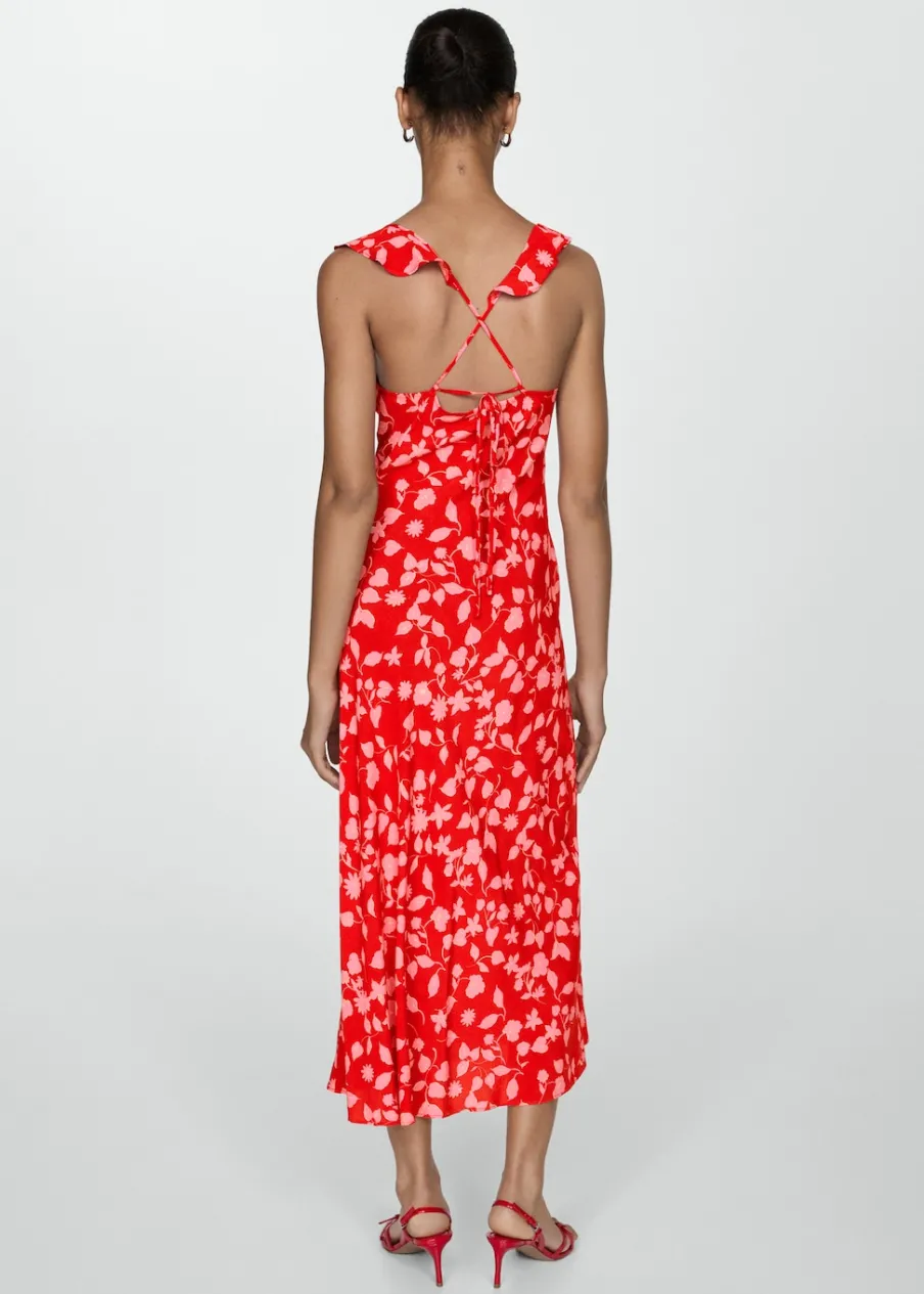 Lejąca tkanina. Model długi. Model prosty. Kwiatowy wzór. Okrągły dekolt. Bez rękawów. Cienkie paski skrzyżowane z tyłu. Wiązanie na plecach.