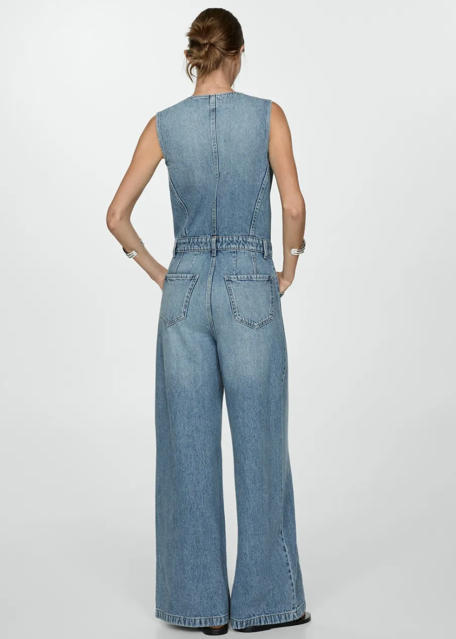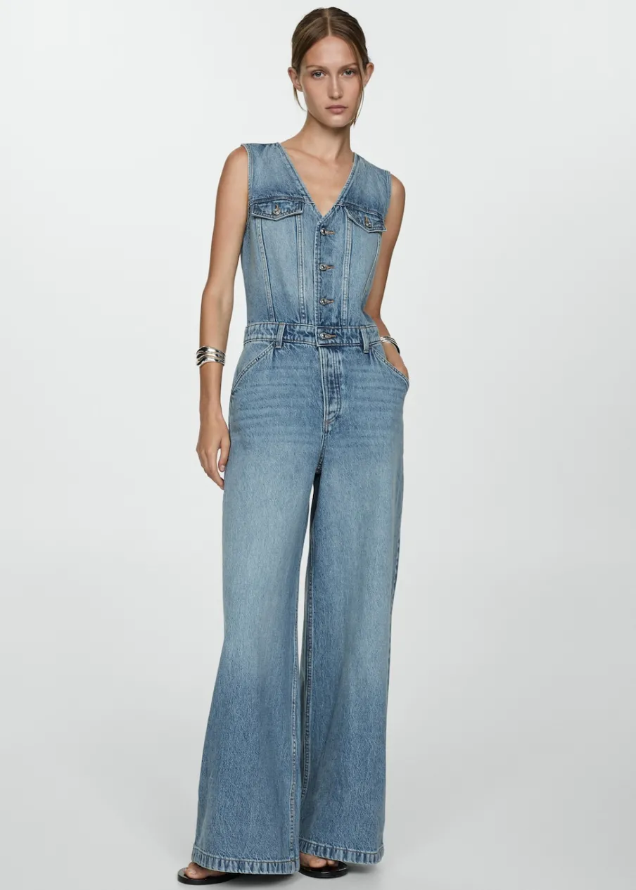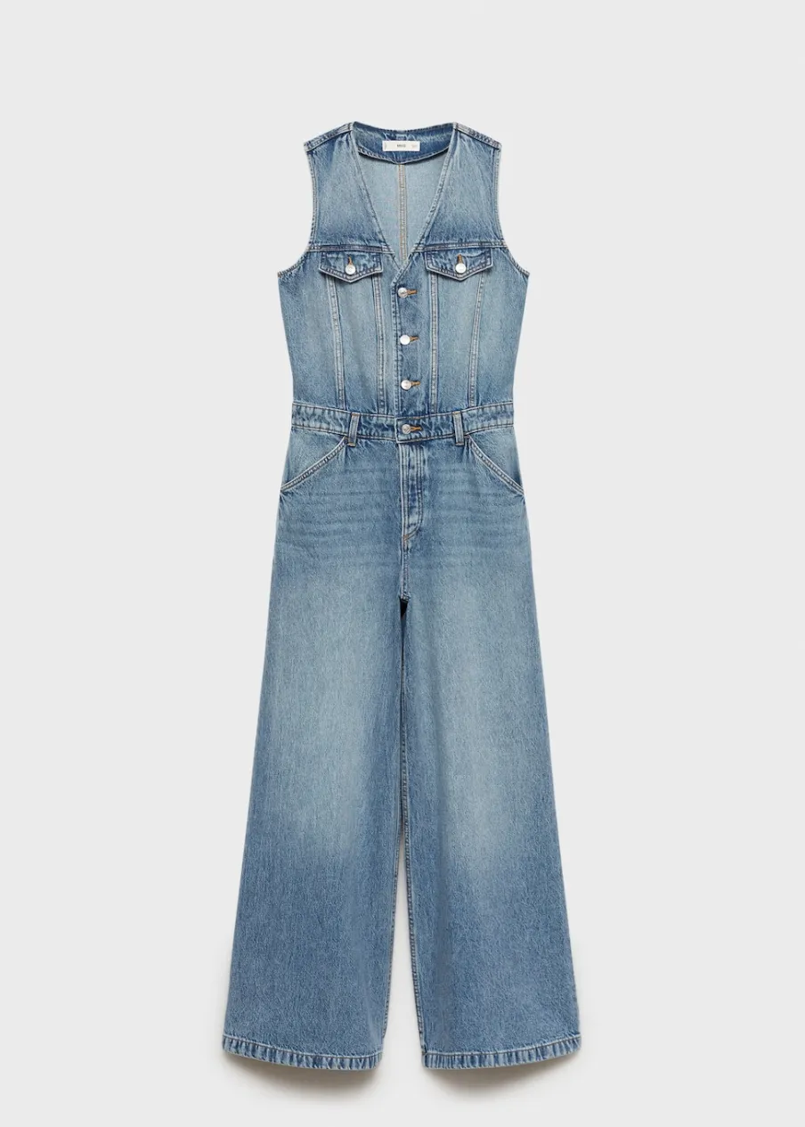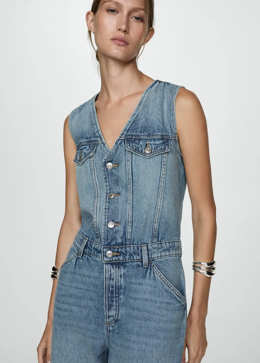 Tkanina bawełniana w dżinsowym stylu. Model długi. Fason wideleg. Dekolt V. Bez rękawów. Dwie kieszenie z patką na piersi. Dwie kieszenie boczne. Szlufki. Zapięcie na guziki z przodu. Model wcięty.