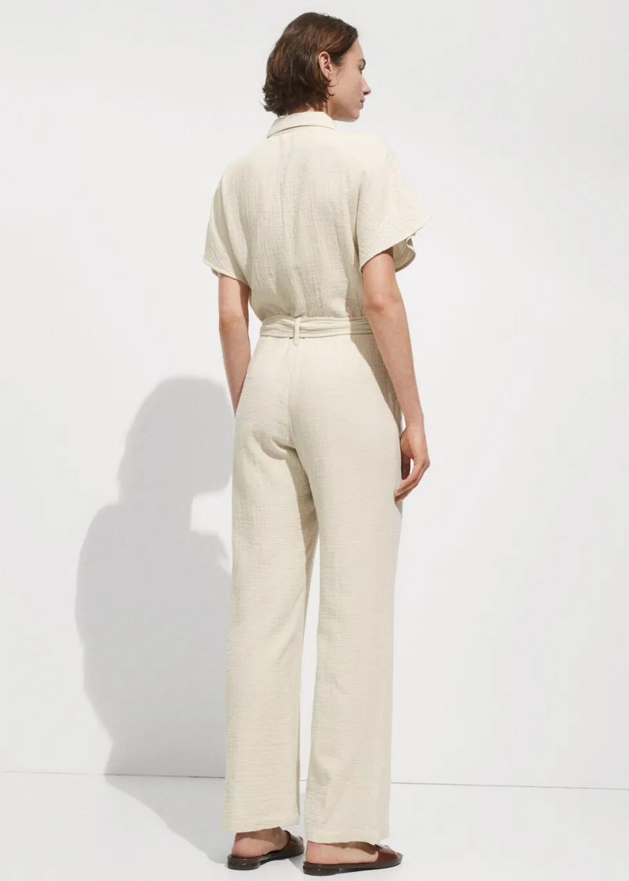 Kreszowana tkanina. Model długi. Model prosty. Koszulowy kołnierz. Krótki rękaw. Dwie kieszenie boczne. Szlufki. Regulowany pasek. Zapięcie na guziki z przodu. Tkanina z 100% bawełny.