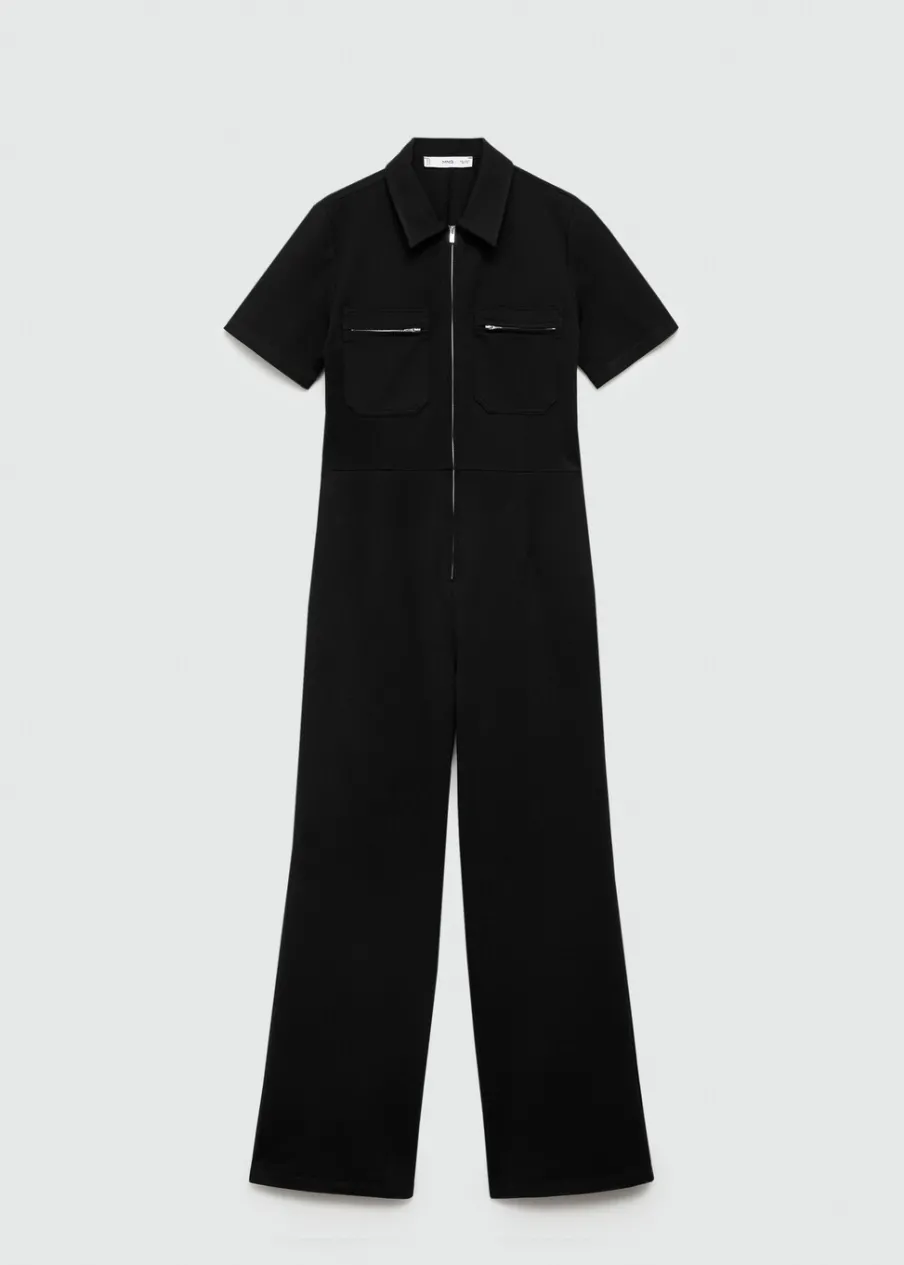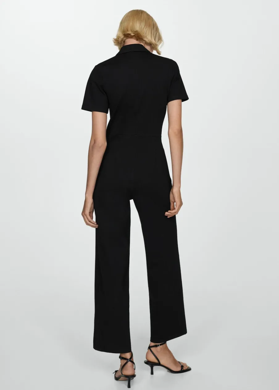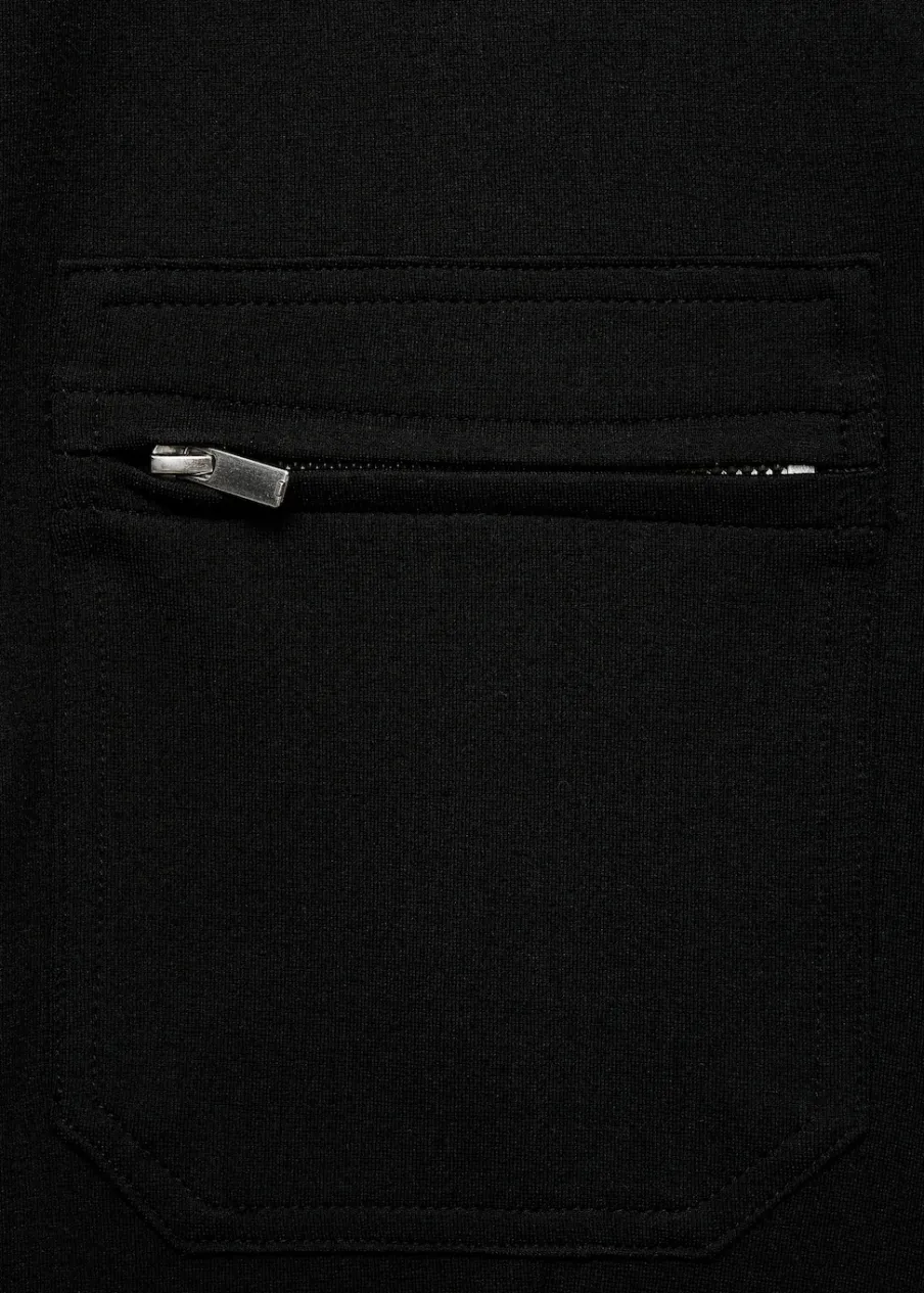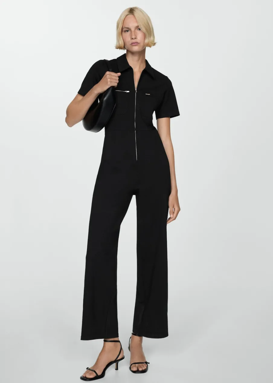 Lejąca tkanina. Model długi. Kołnierzyk polo. Krótki rękaw. Dwie kieszenie na suwak z przodu. Zapięcie z przodu na suwak. Model wcięty.