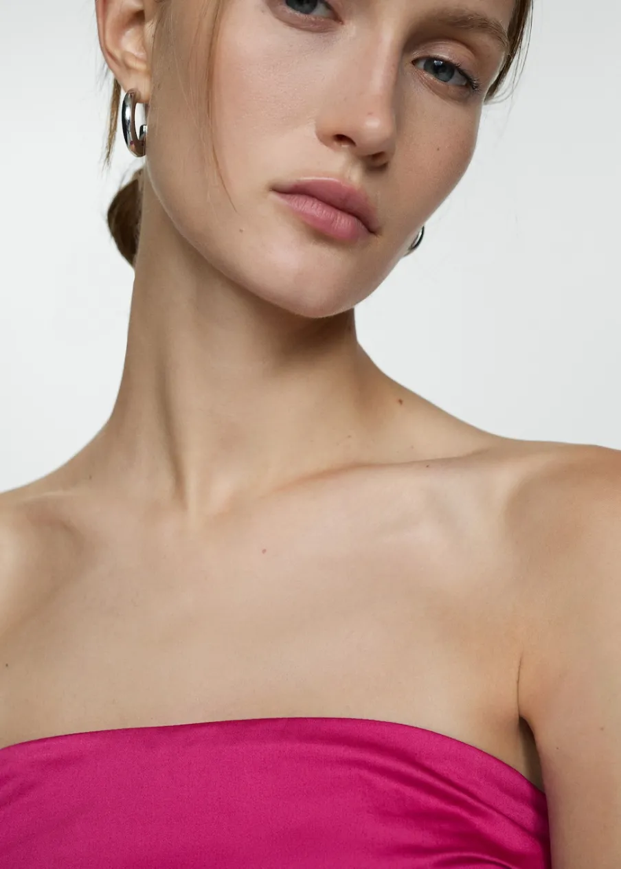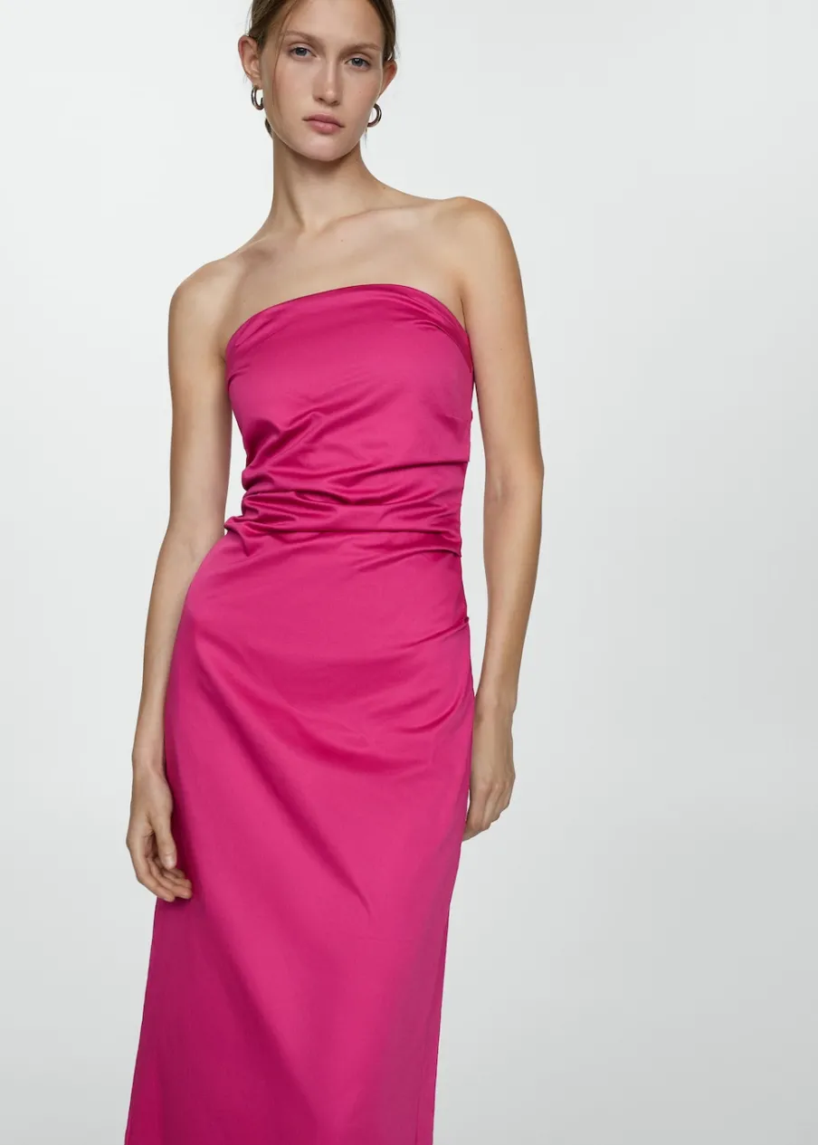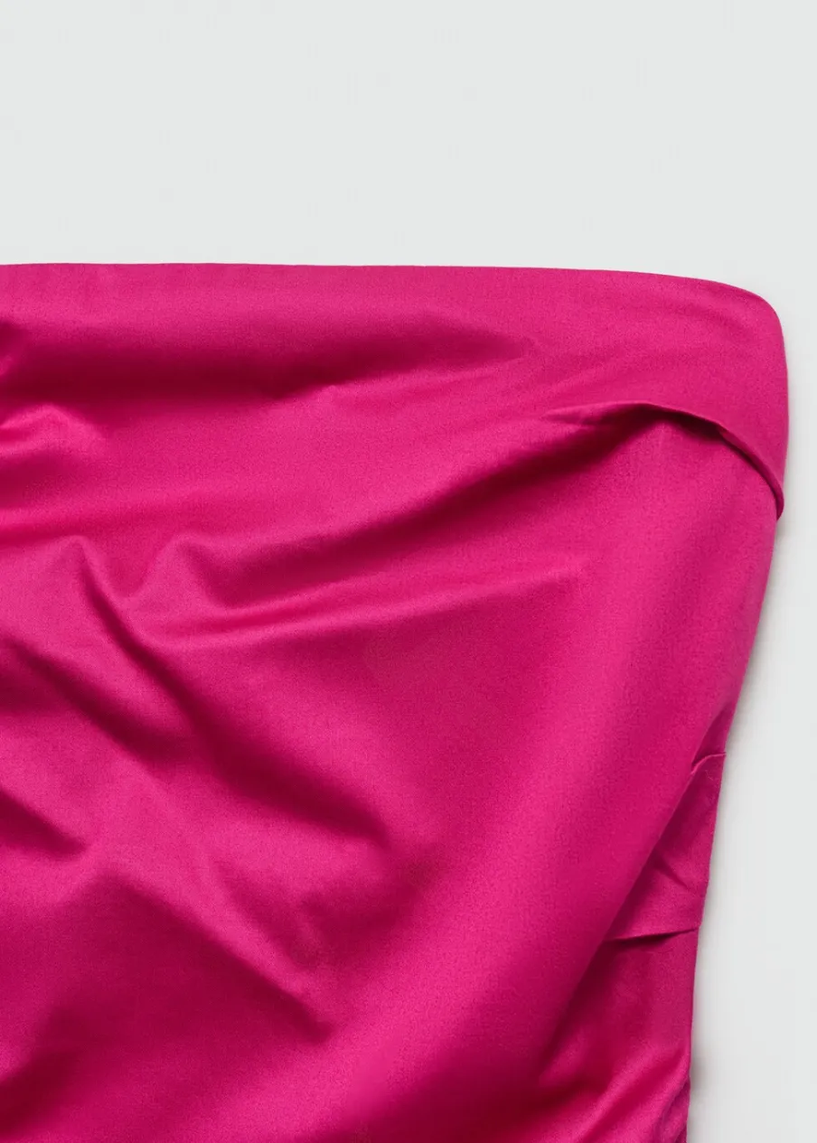 Model prosty. Krój do kolan. Model z drapowaniem. Dekolt bez ramiączek. Bez rękawów. Zapięcie z tyłu na kryty suwak. Rozcięcie z tyłu u dołu. Tkanina z 100% bawełny.