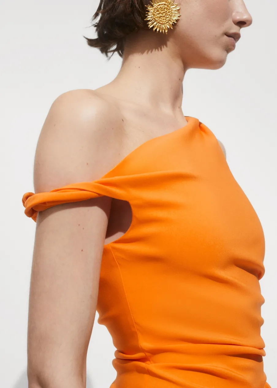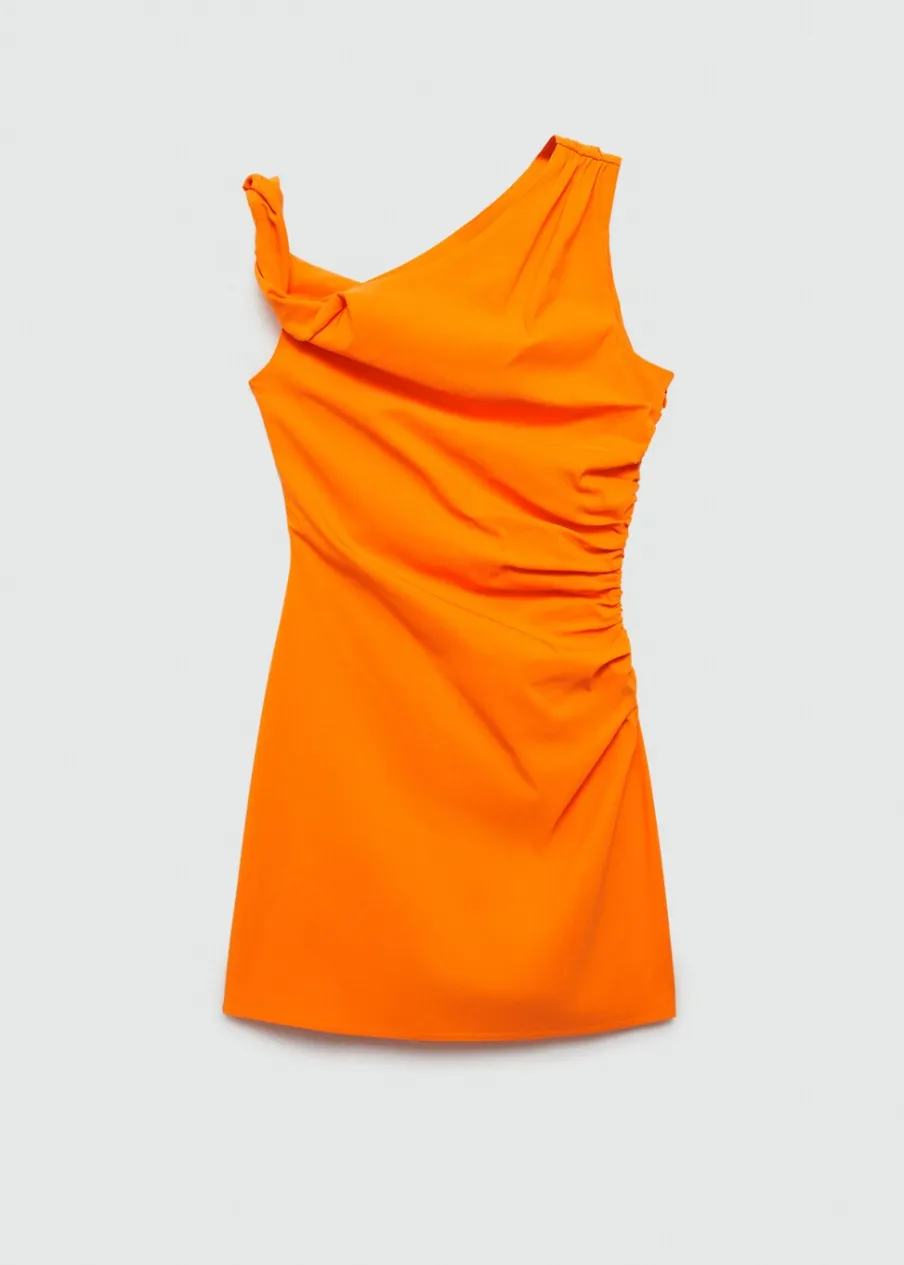 Krótki krój. Model prosty. Asymetryczny dekolt. Bez rękawów. Szerokie ramiączko. Kryte zapięcie na zamek z boku. Marszczona tekstura. Wewnętrzna podszewka.