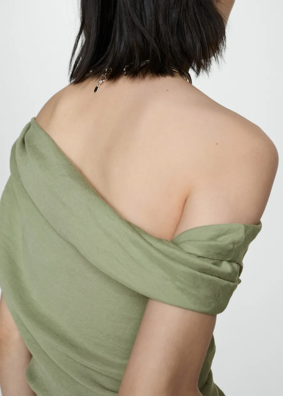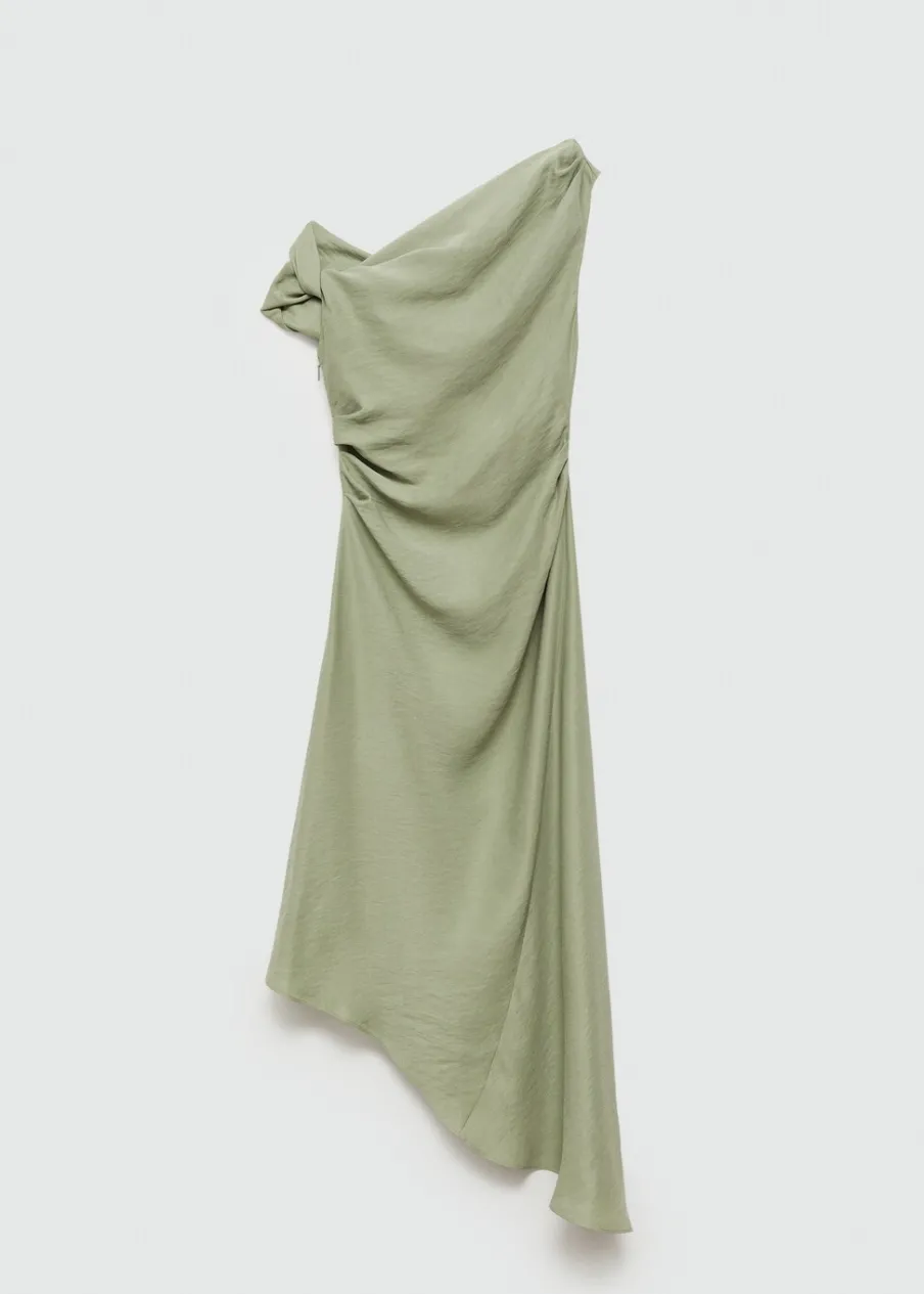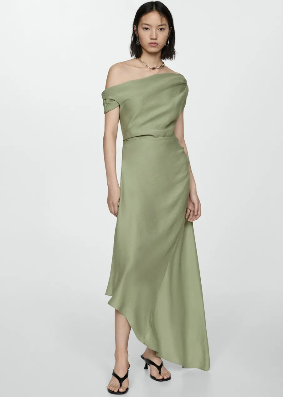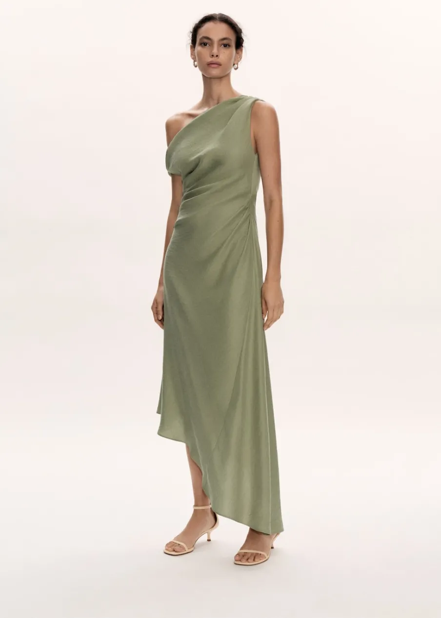 Tkanina z mieszanki modalu. Lejąca tkanina. Krój do kolan. Model prosty. Marszczenie na dekolcie. Bez rękawów. Szerokie ramiączka. Kryte zapięcie na zamek z boku. Asymetryczny dół. Kolekcja wizytowa.